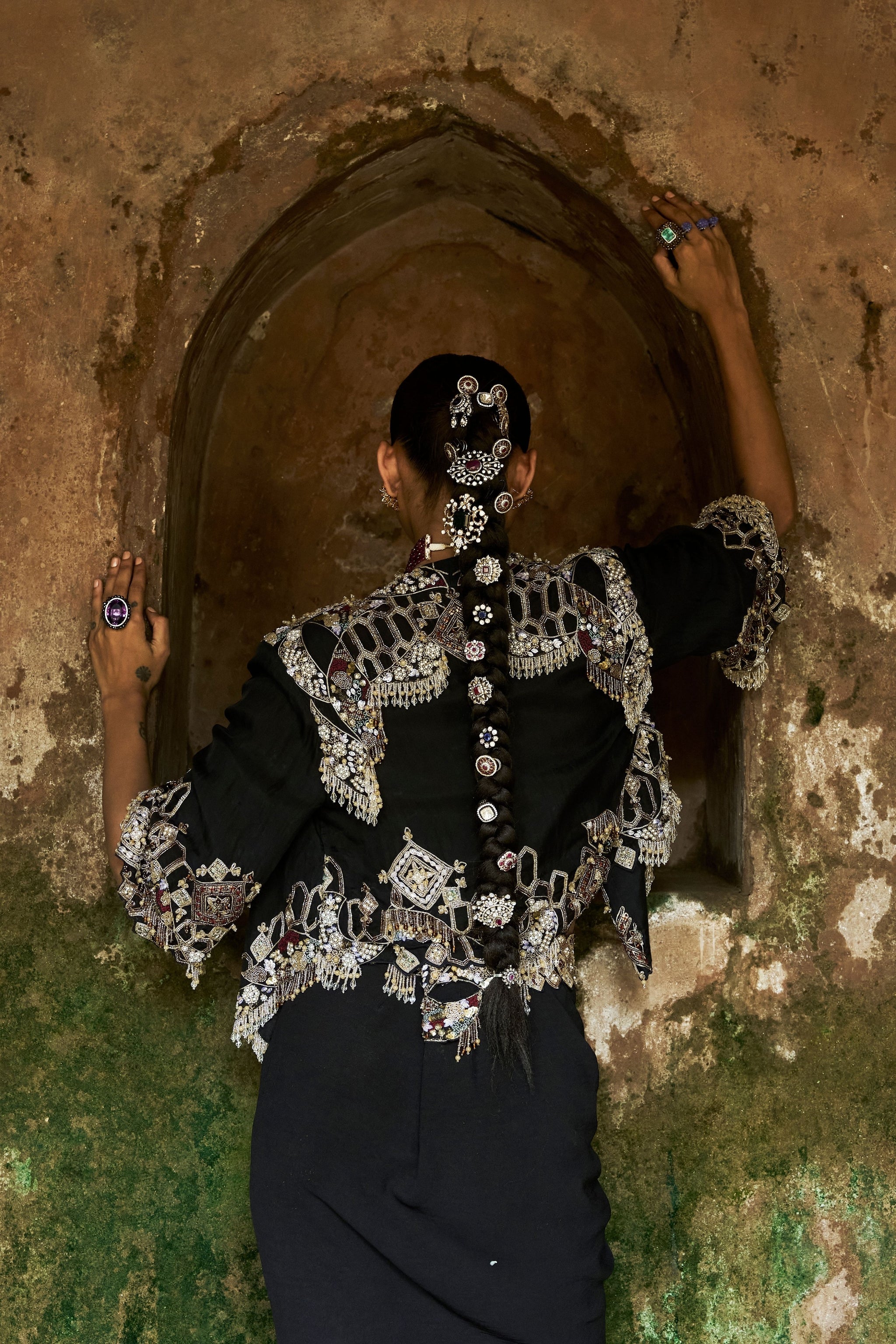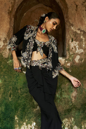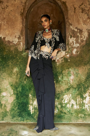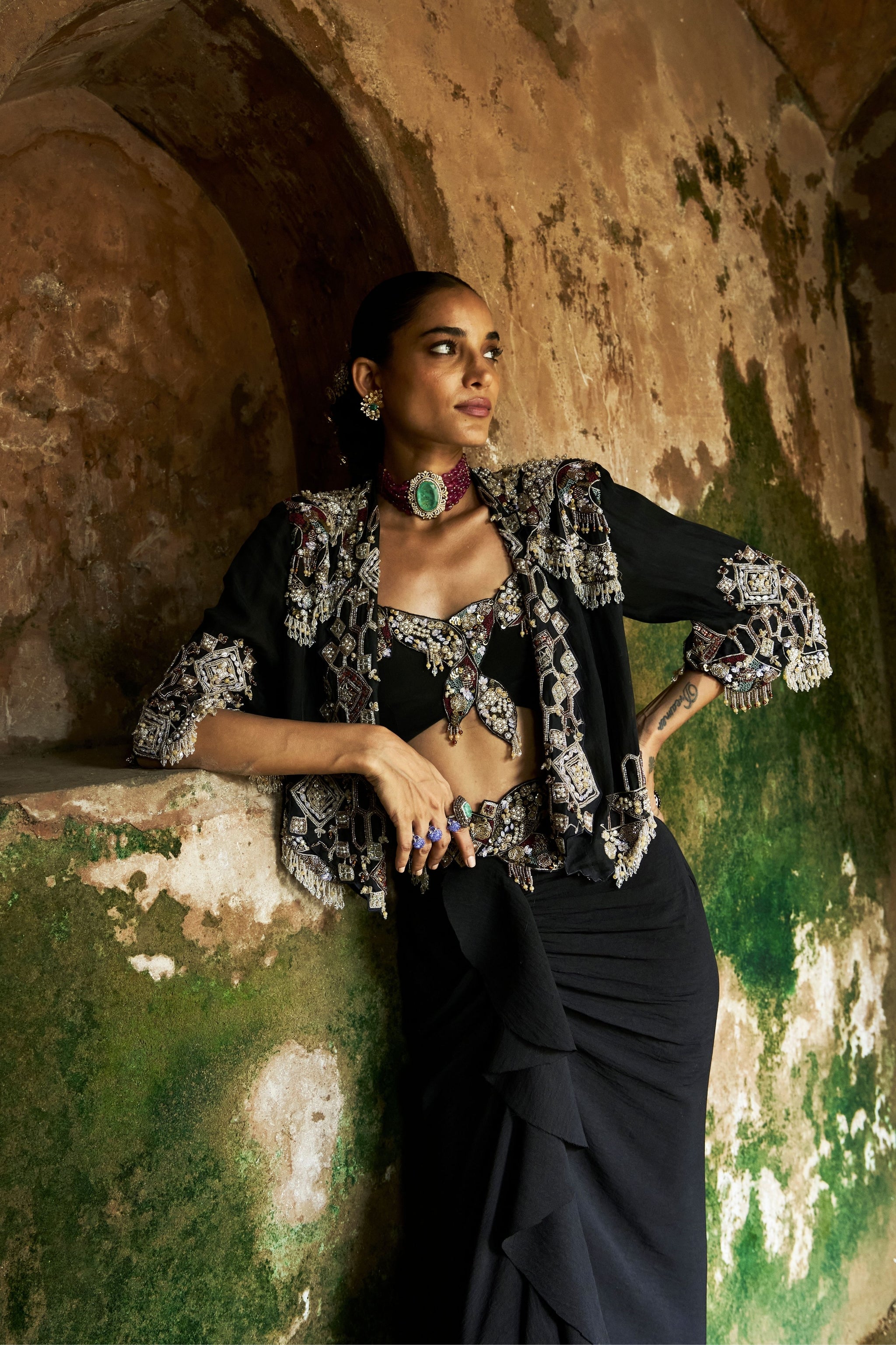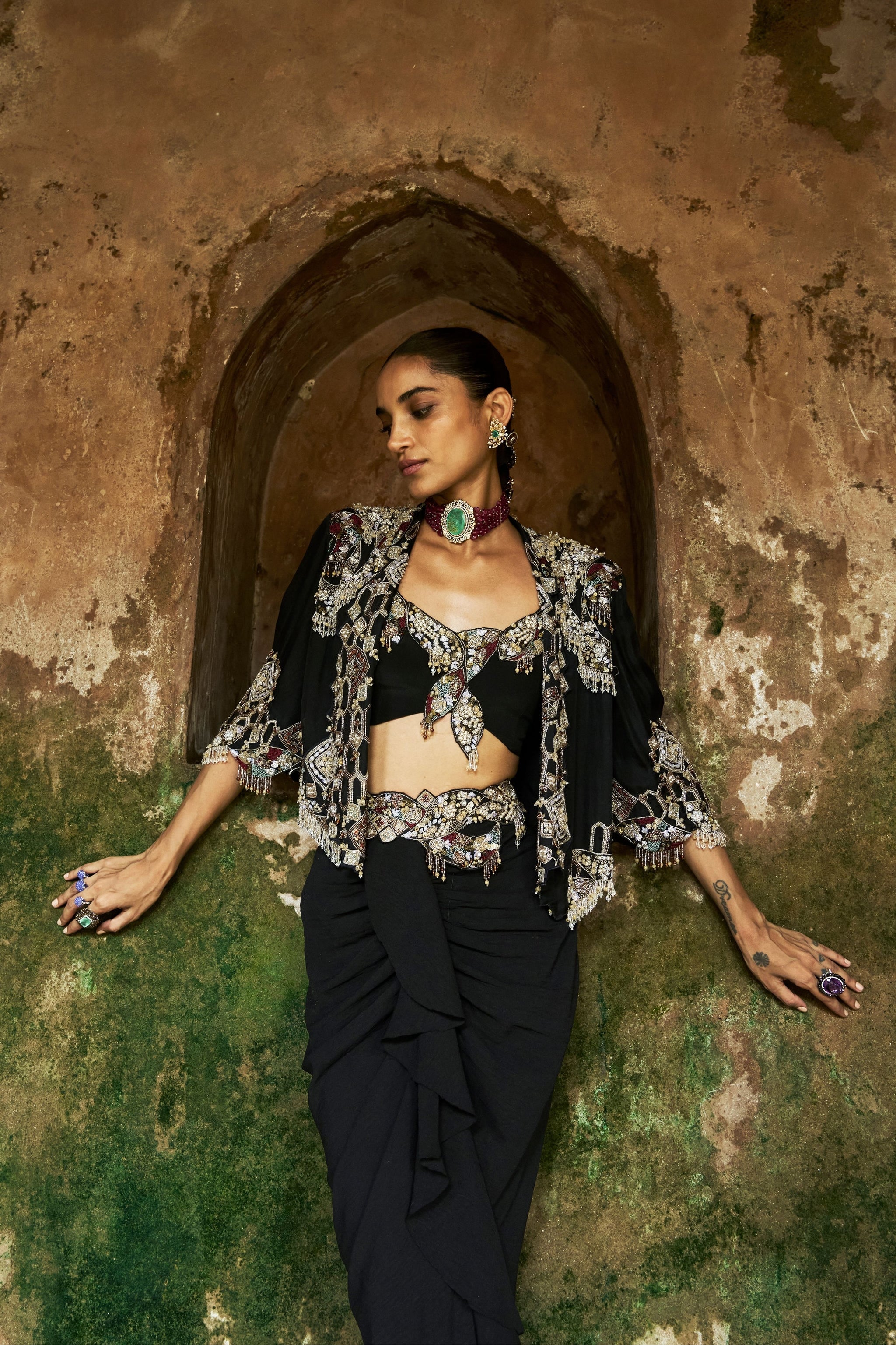 • The Lustre Jacket Set is a statement of unparalleled elegance and craftsmanship. The heavily embellished jacket, a true masterpiece, is paired with a detailed bustier. The draped skirt, featuring meticulous pleating and an embroidered waist, creates a striking silhouette that adds a modern twist to traditional form. This ensemble effortlessly merges opulence with contemporary grace—perfect for those seeking timeless glamour with a bold edge.