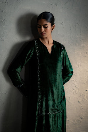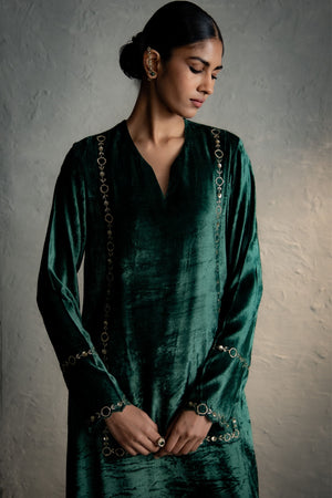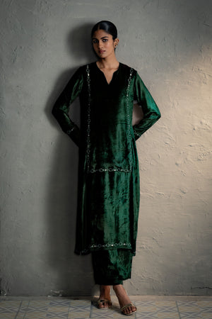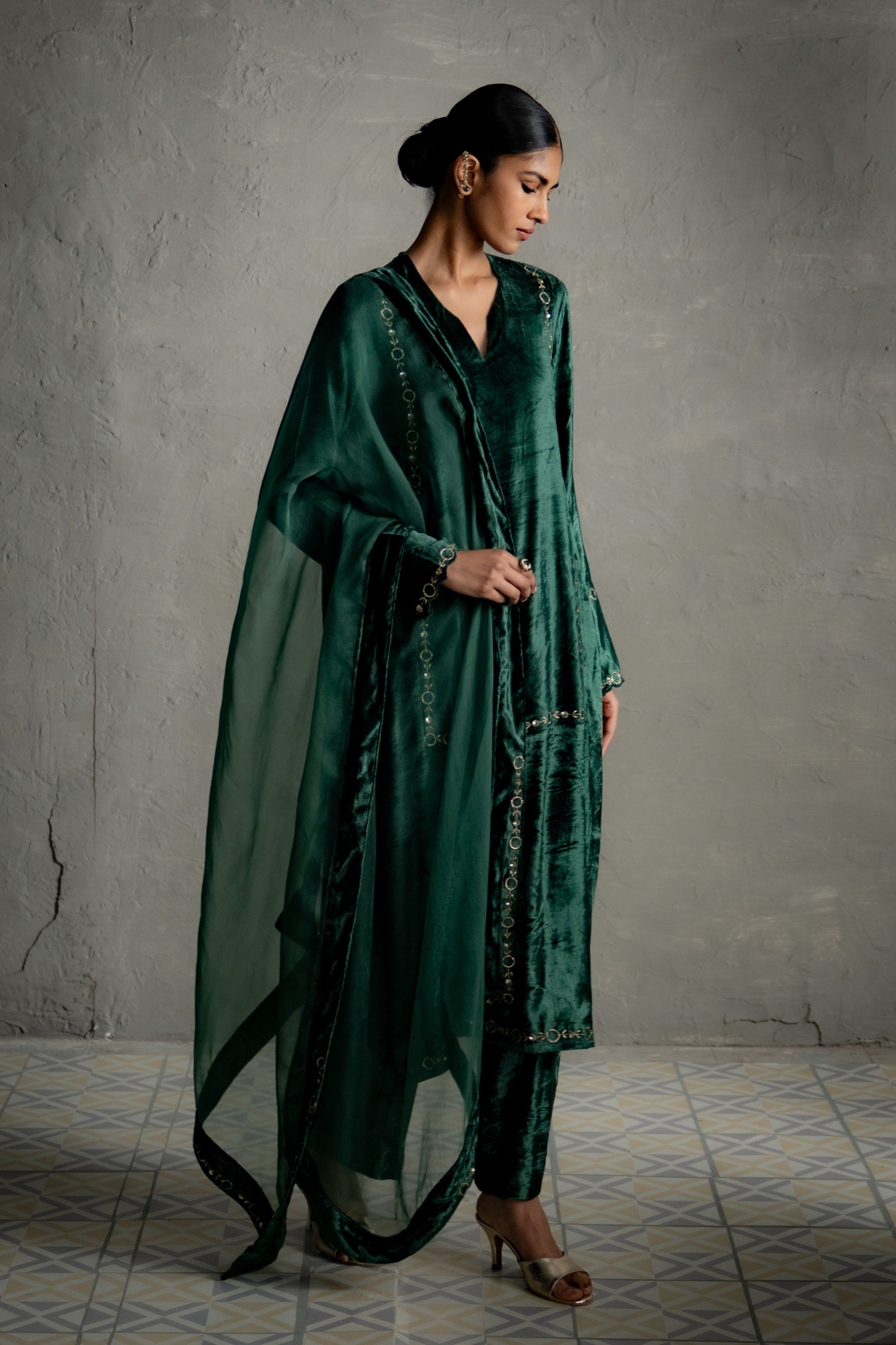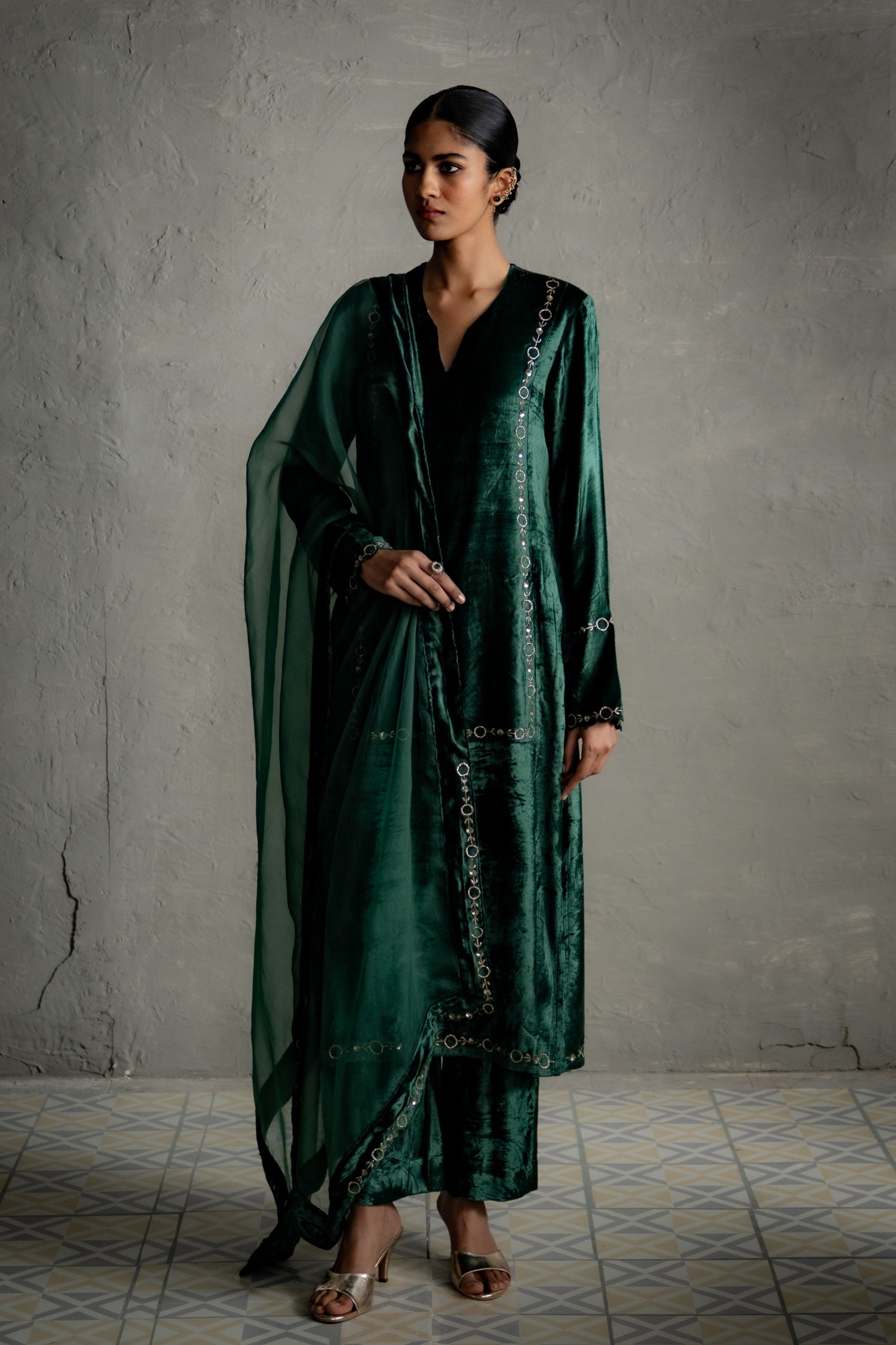 • A straight-fit kurta adorned with circular embroidery arranged in a long rectangular line along the front and sleeves, paired with plain, loose pants for a clean, contemporary silhouette. Available in two rich colour options, one styled with an embroidered velvet stole, and the other with an organza dupatta edged in velvet for a soft, flowy drape.