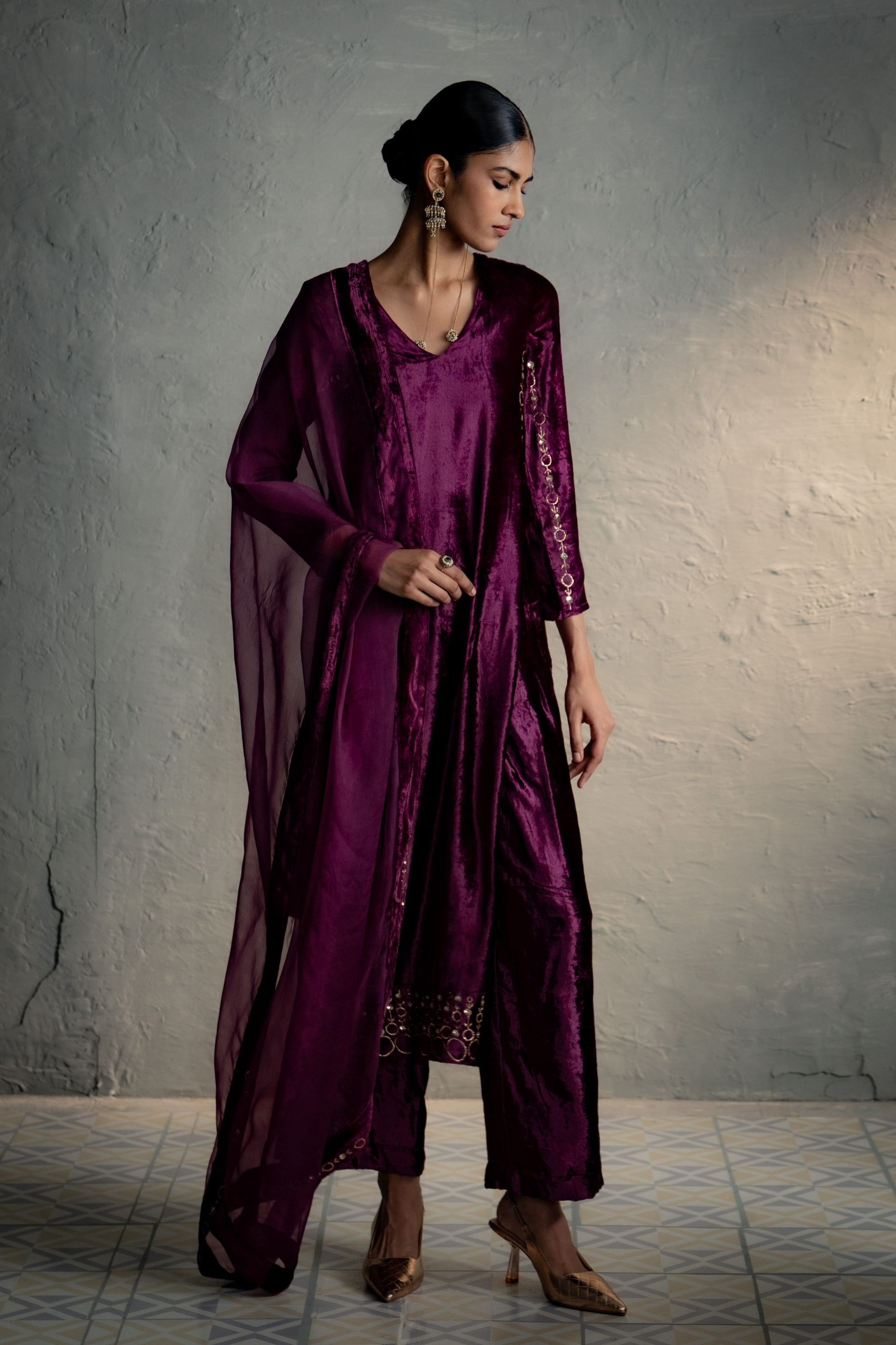 • A velvet kurta set in a straight-fit silhouette, featuring an intriguing side-slit detail, a sleek side band on the bodice, and a back tie-up for a structured yet graceful look. Intricate embroidery adorns the long slits, sleeves, and the front hem, paired with loose palazzos for effortless ease. Available in two rich colour options, one styled with an embroidered velvet stole, and the other with an organza dupatta edged in velvet for a soft, flowing drape.