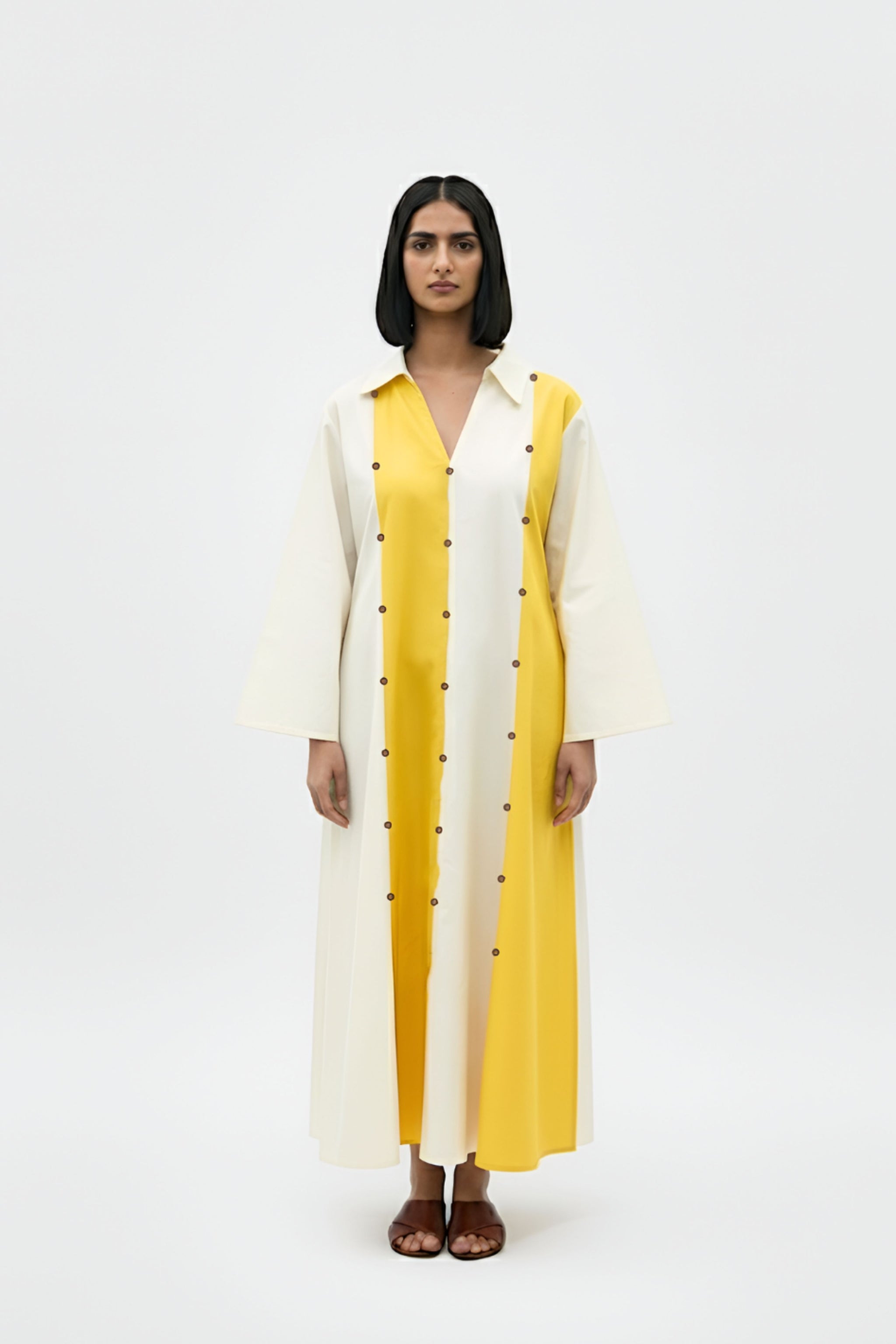 • This subtle ivory-mango yellow maxi dress radiates effortless elegance. Its sleek lines and elegant silhouette showcase understated sophistication. Features like trumpet sleeves, 2 colored-panels, wooden button detail, and a v-neck with a collar add a touch of flair, while the full-length cut offers versatile styling options. Ideal for chic comfort, it leaves a lasting impression at any event. Perfect for making a seamless transition from day to night.