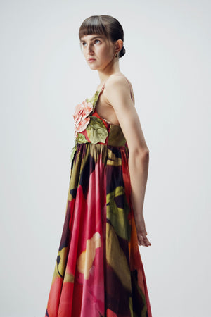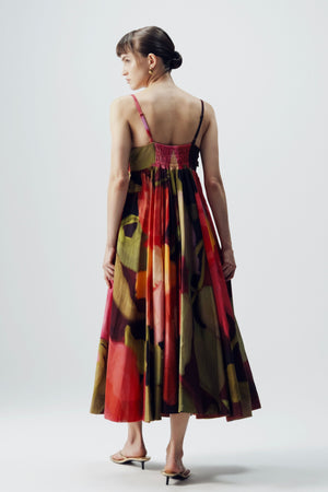• A vibrant, painterly print blending deep reds, fuchsias, lush greens, and soft purples. The pattern resembles abstract floral strokes, creating a dynamic, artistic effect with depth and movement. The colors transition beautifully, giving the pleated fabric dimension and a fluid, almost watercolor-like feel. Bold yet elegant, the print evokes the richness of a blooming garden at sunset. Dress length - 50"