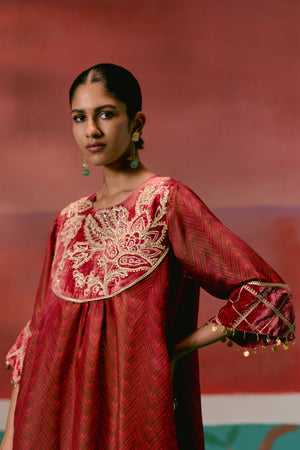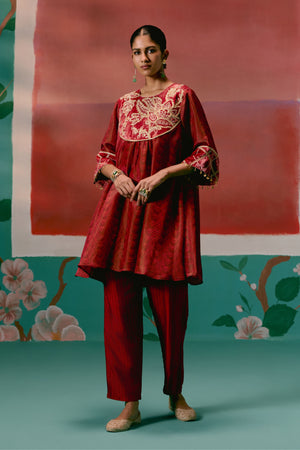 • Distinctive and opulent, this maroon embroidered anarkali features a velvet gotta patti yoke, tasselled back tie, and beaded coin-embellished sleeves, paired with elasticated salwar pants for festive elegance and comfort.