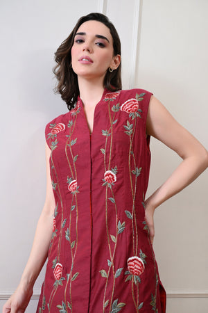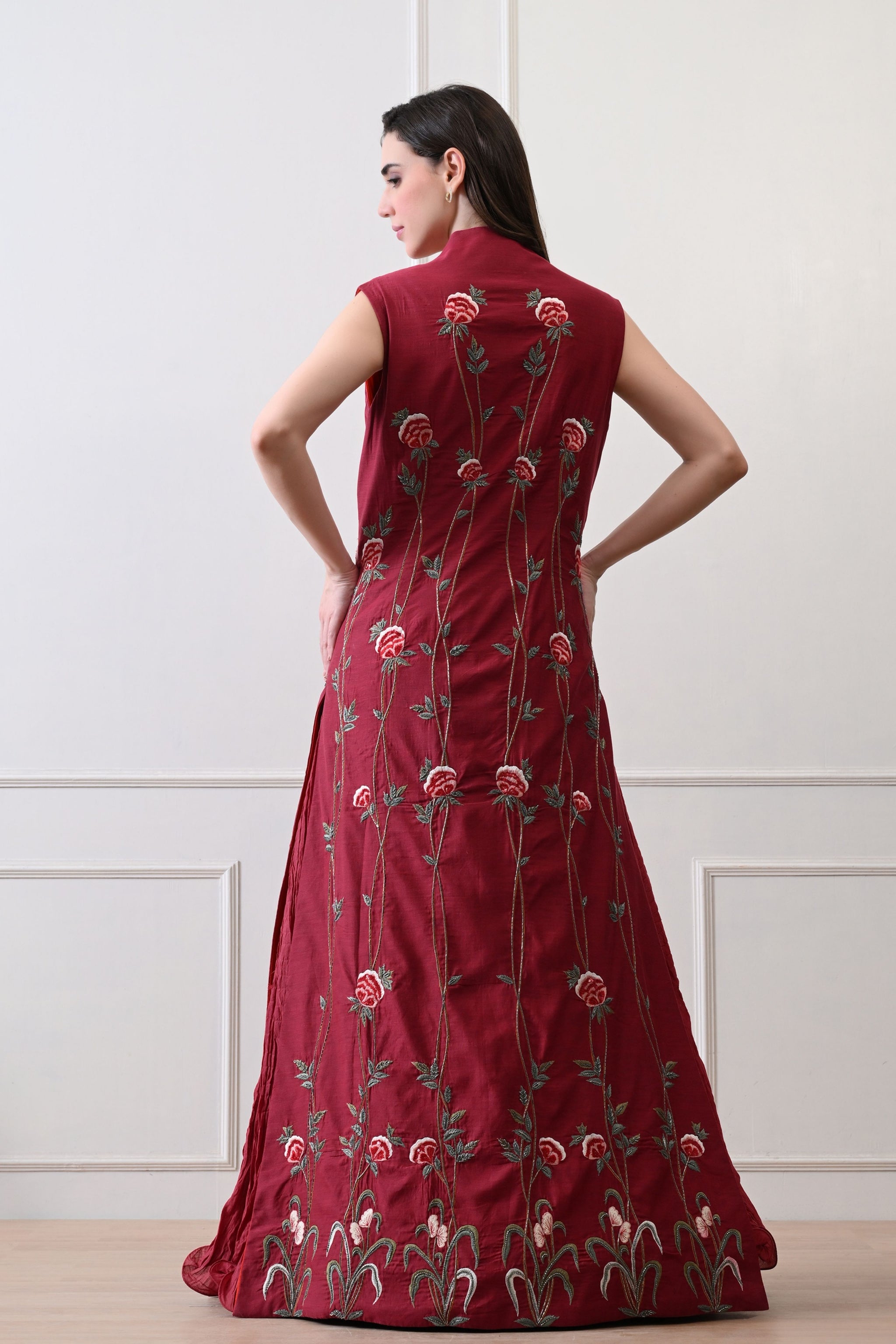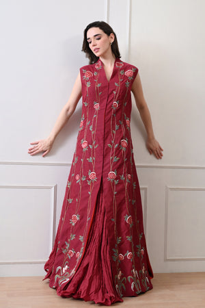 • Maroon v-neck jacket paired with a skirt, featuring intricate all-over embroidery in grey and jewel tones.