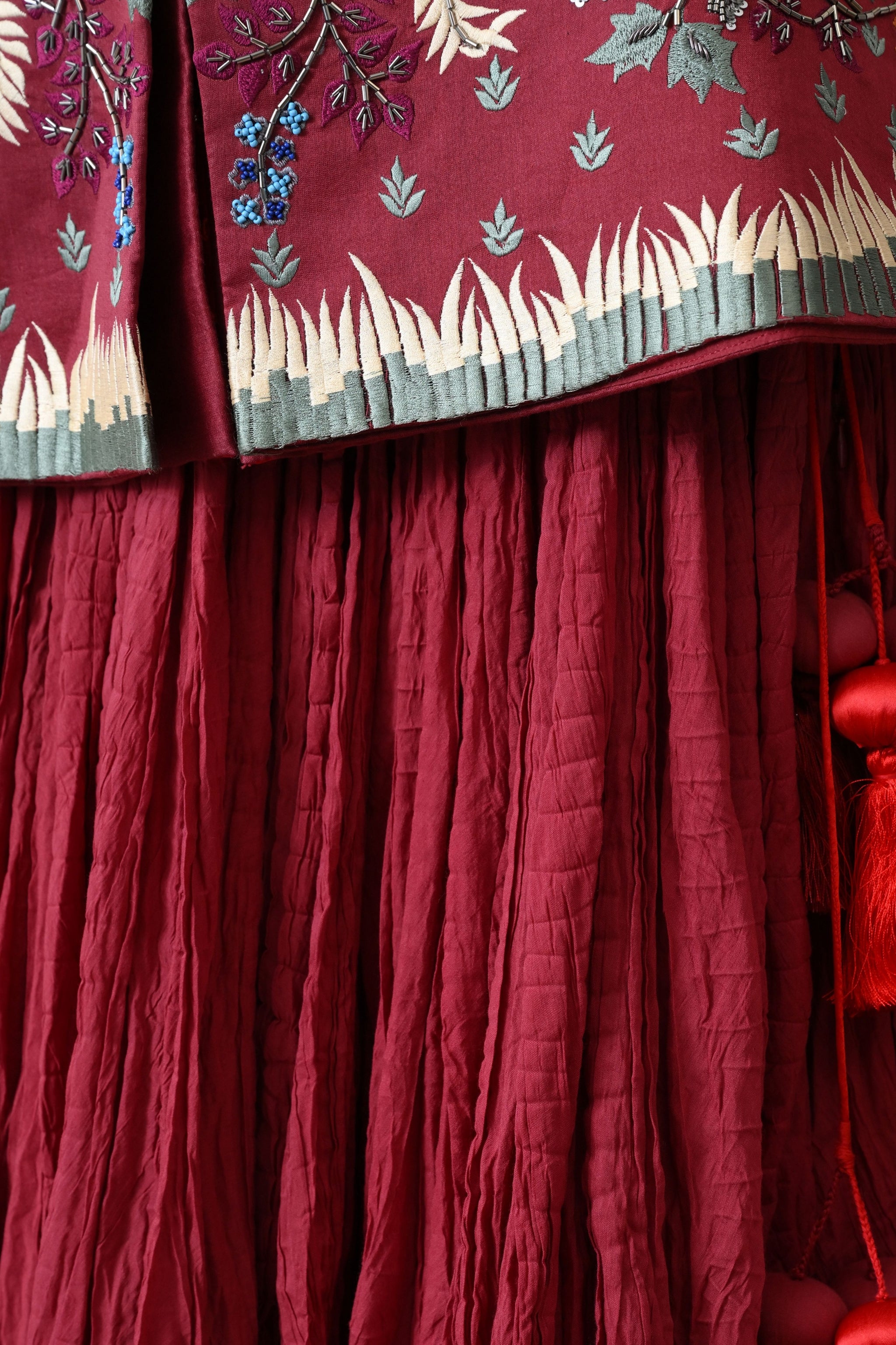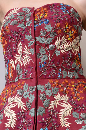 • Maroon corset-style top with intricate all-over floral embroidery, paired with a matching flowing skirt, creating a chic and elegant ensemble