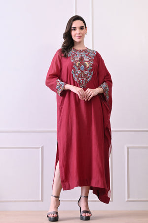 • Maroon kaftan-style dress, crafted from soft, breathable fabric and featuring a relaxed silhouette that drapes beautifully, offering effortless style and timeless sophistication.