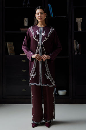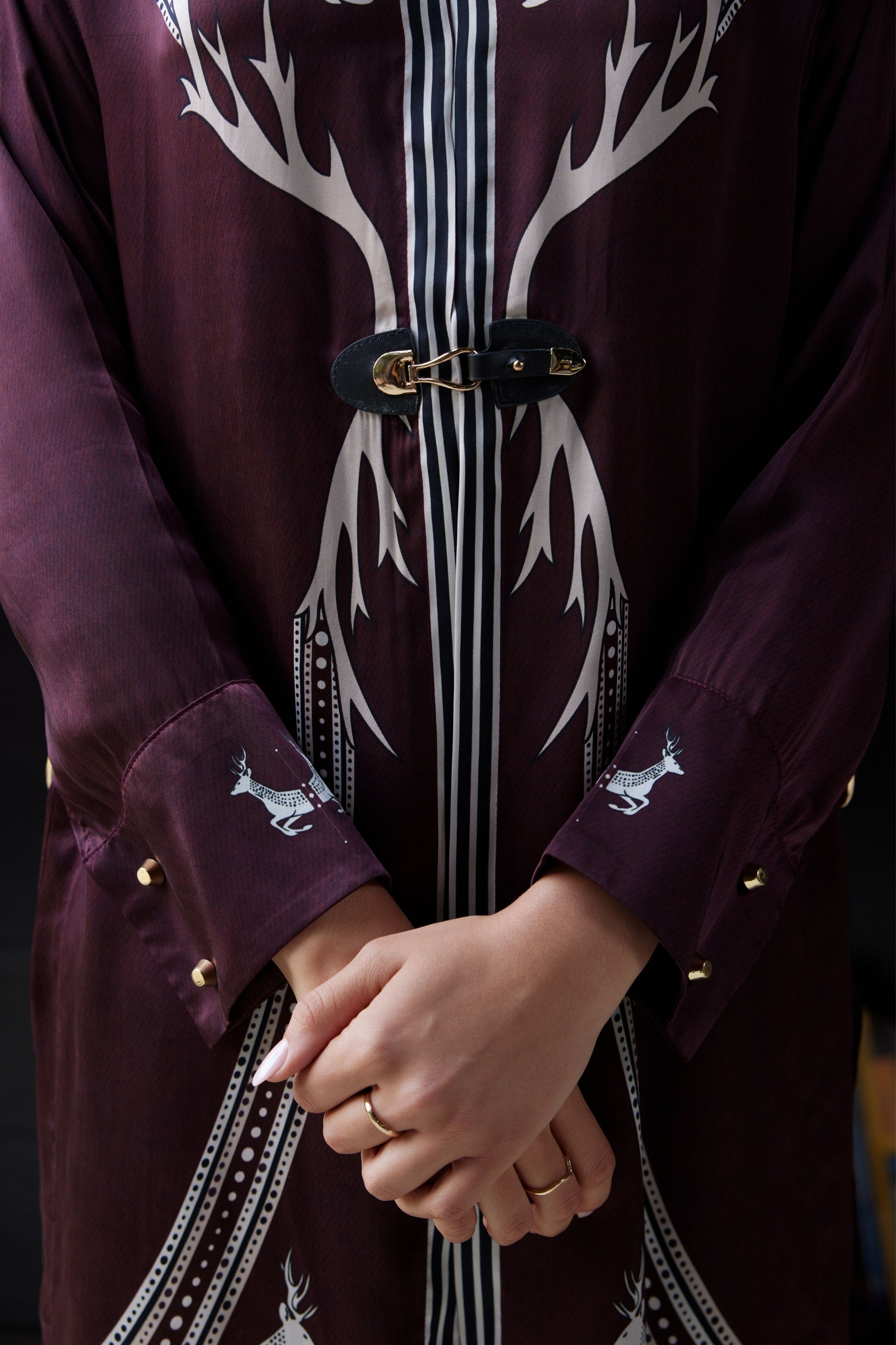 • In a rich burgundy hue, Maysa captures quiet strength with its elegant deer motifs and bold antler-inspired lines framing the silhouette. The front clasp detail adds a touch of structure, balancing fluid drape with refined form.