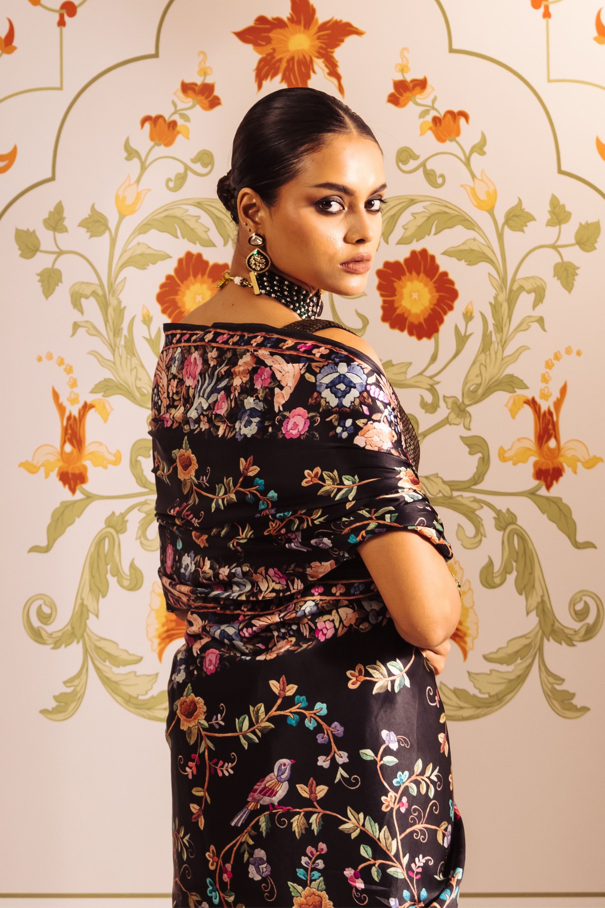 • This exquisite satin silk saree features a timeless black base, serving as a perfect canvas for vibrant Hand Parsi Embroidery prints. The intricate digital rendering highlights a rich palette of bold, beautiful colors, creating a stunning contrast and sophisticated elegance.