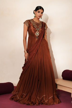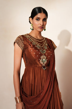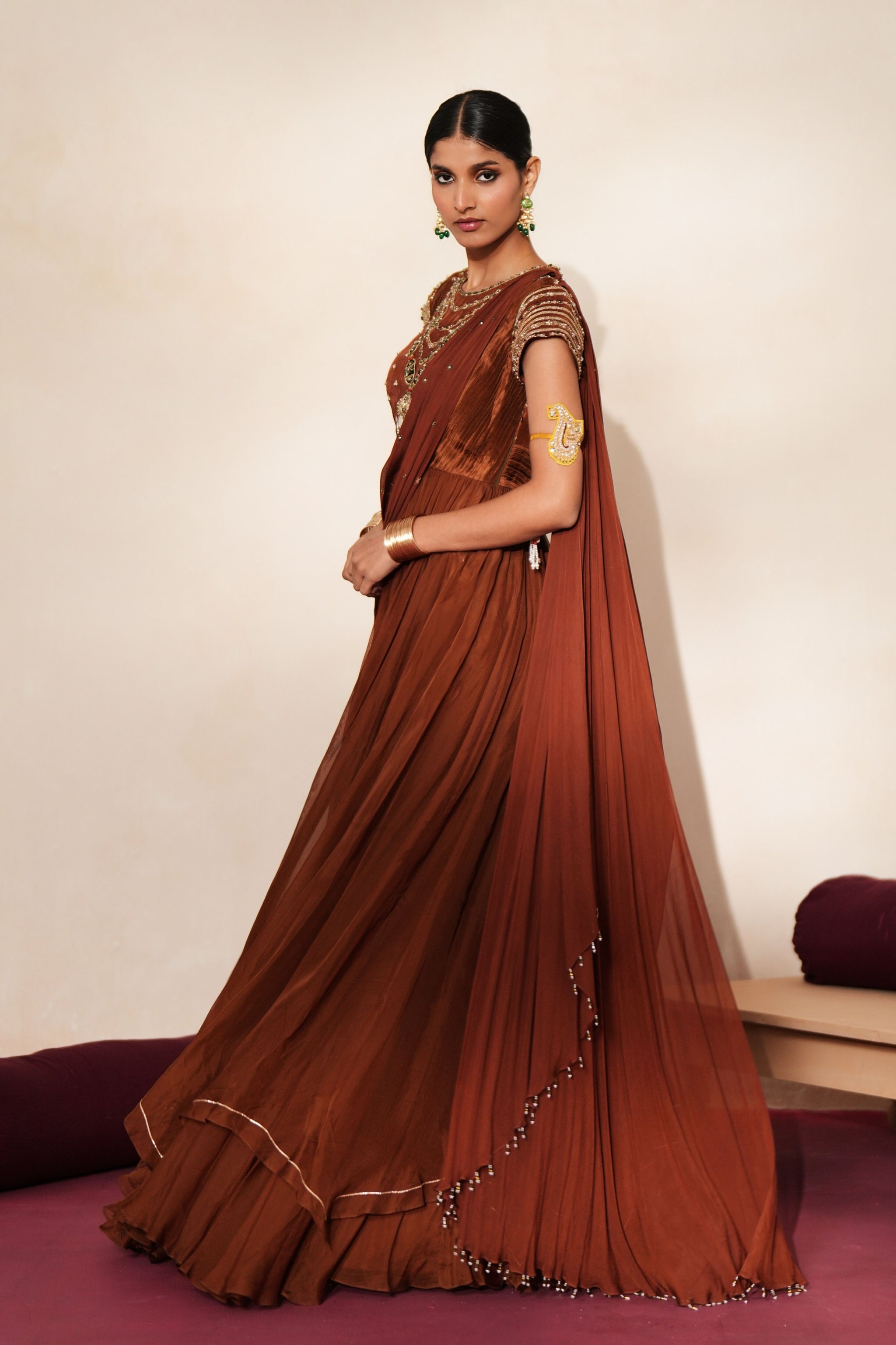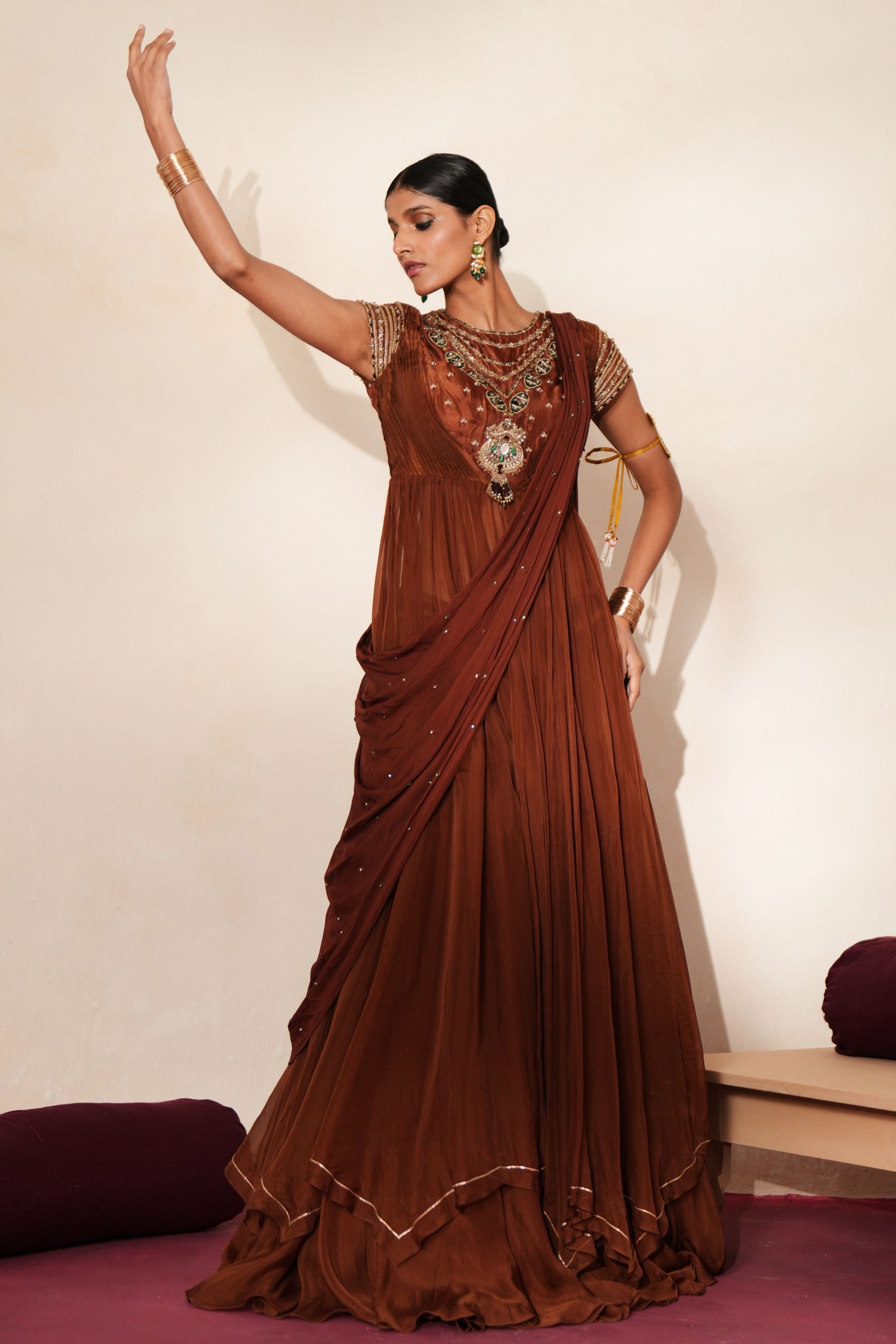 • Draped in the opulent hue of raktaratna, this metallic wine-brown asymmetric anarkali set embodies timeless grandeur and contemporary grace. The silk and organza anarkali features a jeweled jadau-embellished neckline, exuding royal charm, while the organza skirt adds layered volume and fluidity. A draped organza dupatta, embroidered with intricate all-over bootis, completes the look with soft movement and regal refinement.