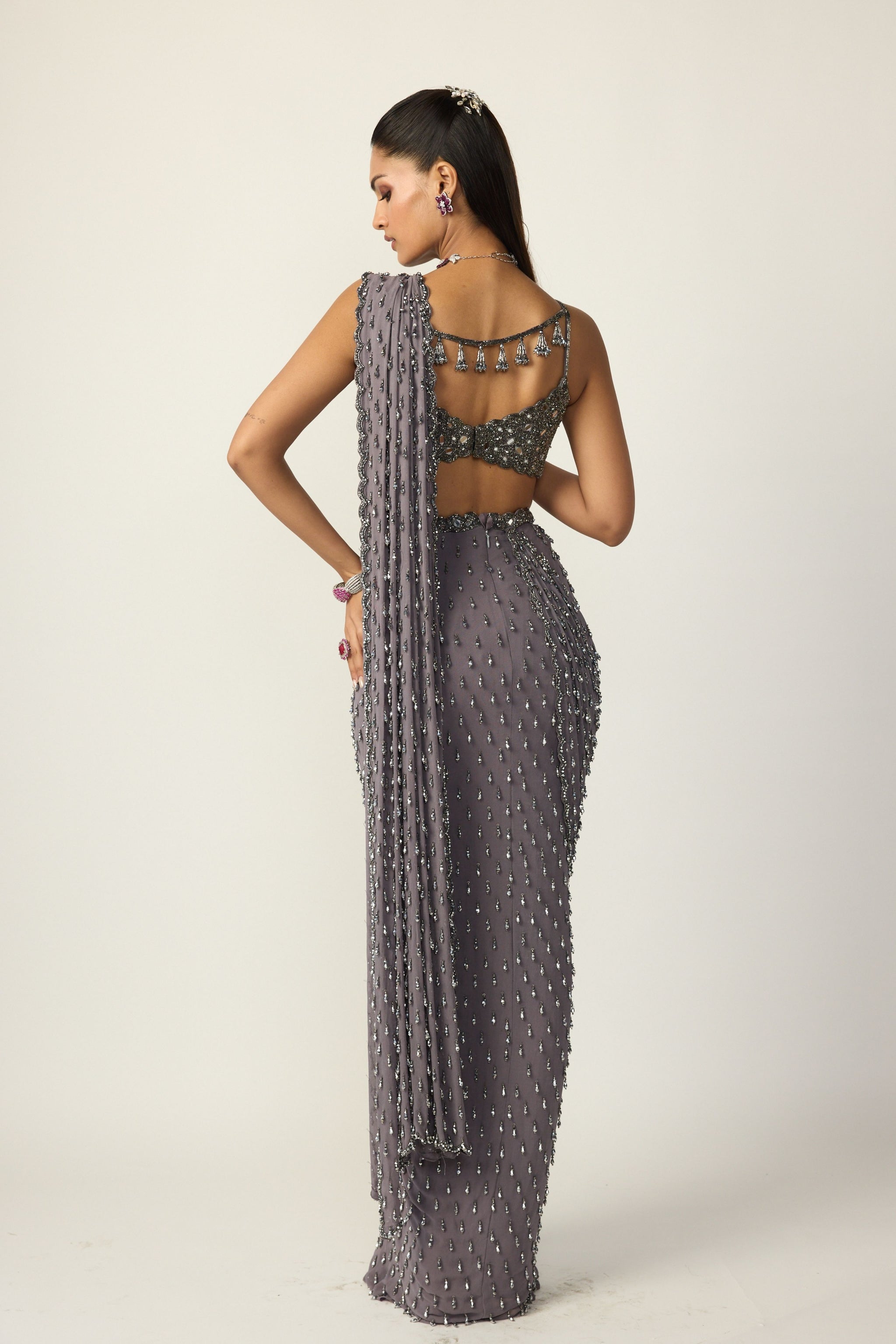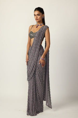 • Metallic Grey Single Drop Saree Clubbed with Cutdana and Mirror Hand Embroidered Sleeveless Blouse.
