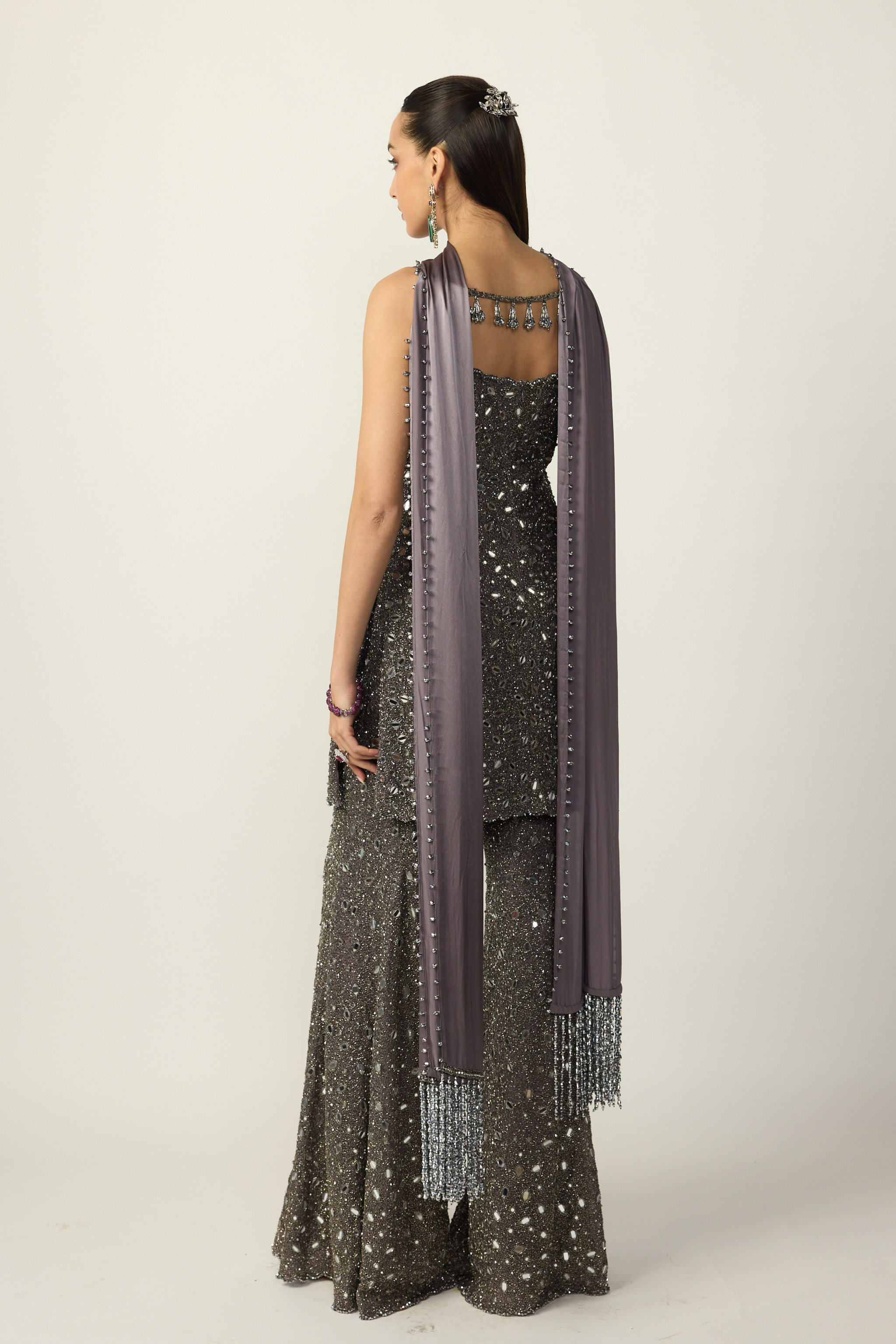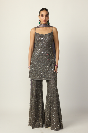 • Metallic Grey Sharara with kurta set, Adorned with cutdana and mirror embroidery work paired with stole.
