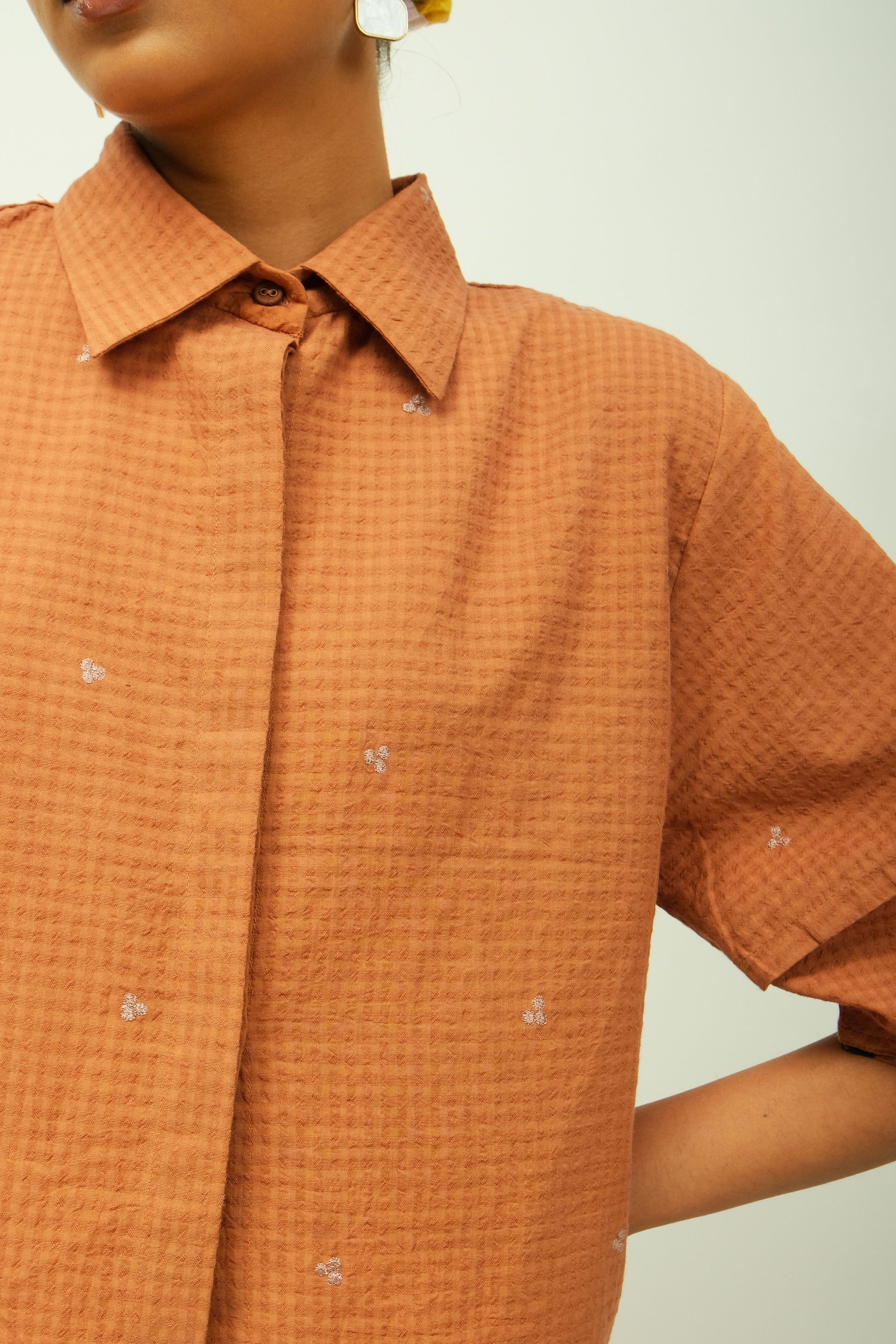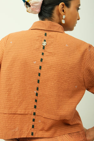 • Cropped top, v-neckline, full placket, short sleeves, bead detailing, horizontal seam detail, the outfit is made from lightweight textiles, variations in color, texture, and weave are inherent due to the handmade nature of the garment- single piece. Garment length- 18".