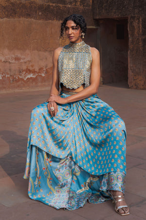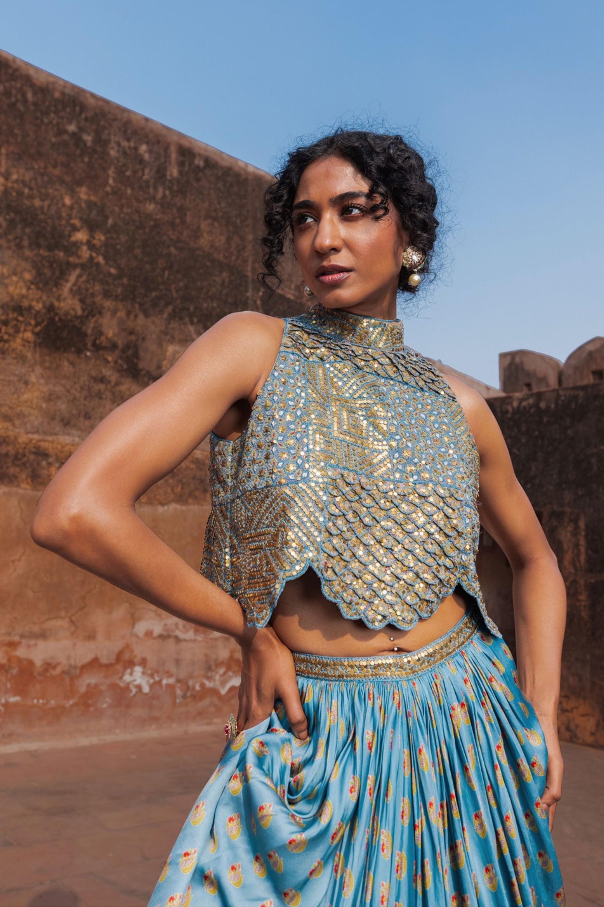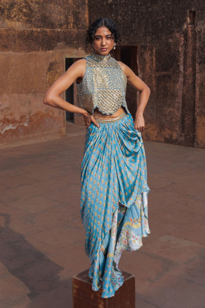 • A heavily embellished coin work scallop finished top which is a striking feature of the whole look with a printed draped skirt, bringing modernity to our ancient inspiration.