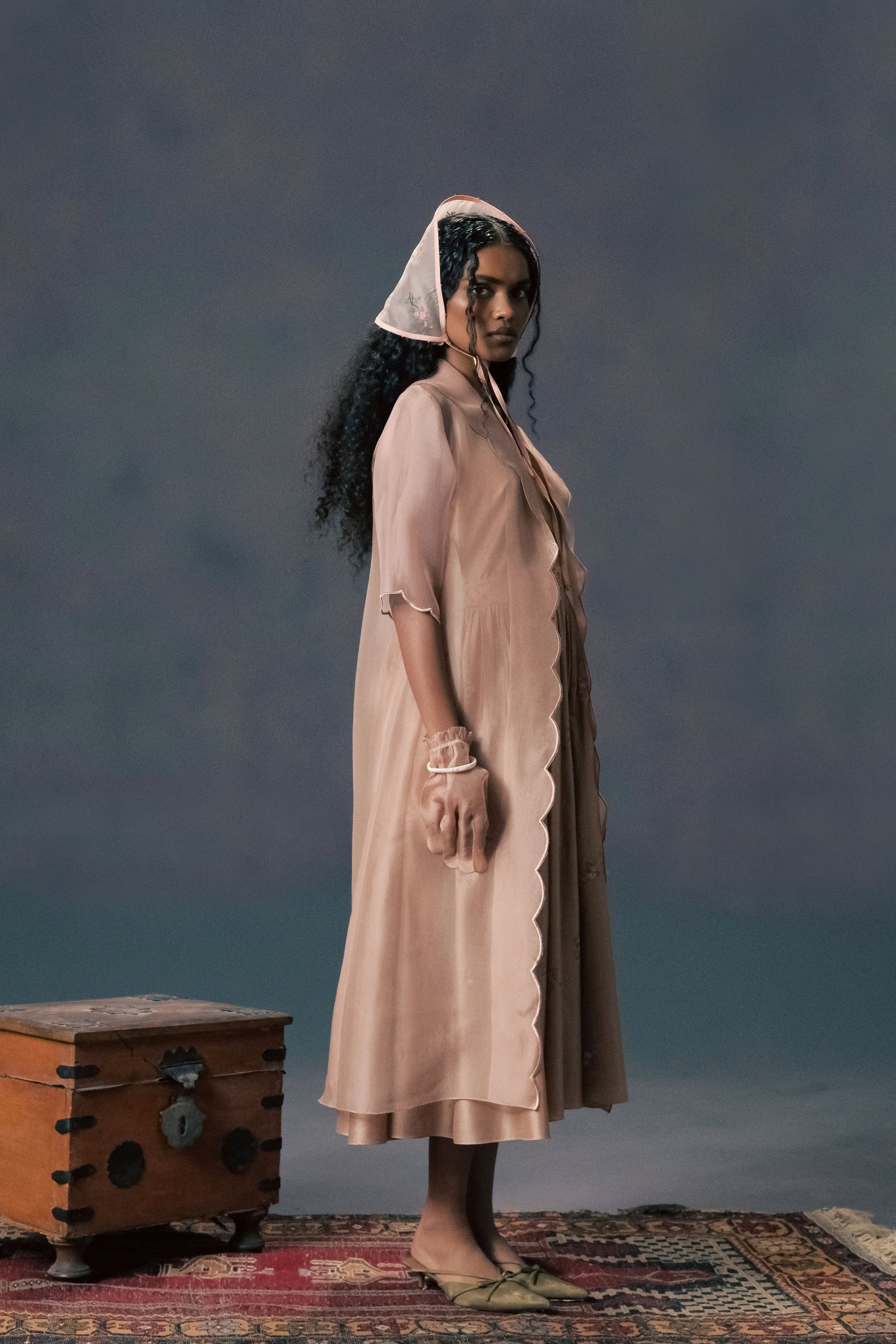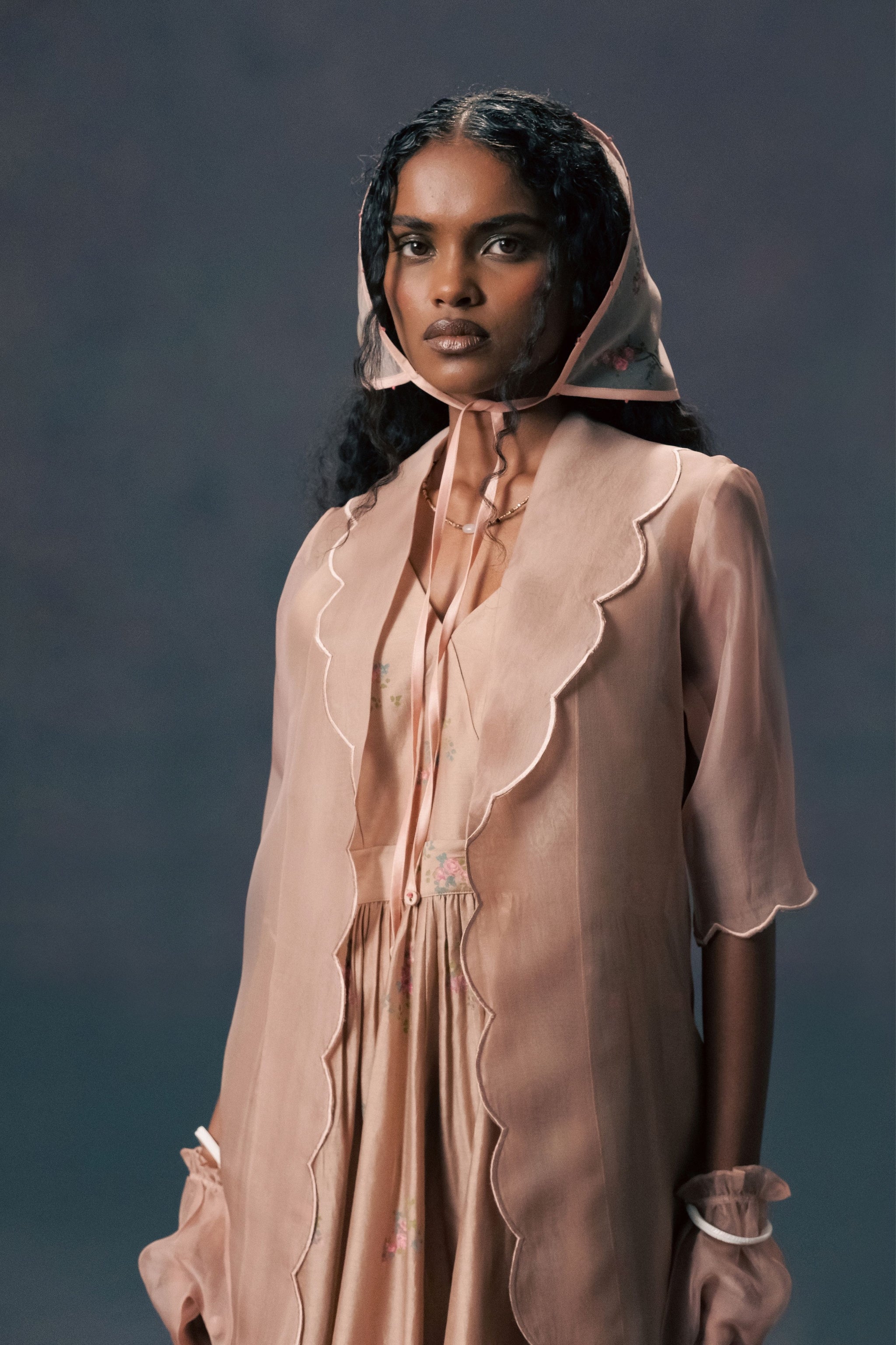 • Mocha mousse scalloped organza jacket with rose printed strap dress in silk chanderi