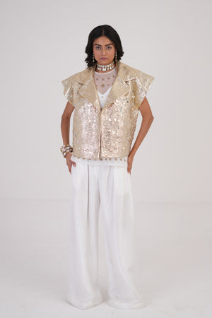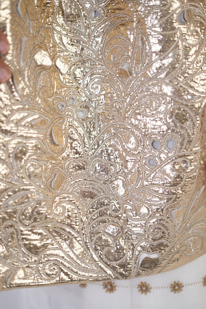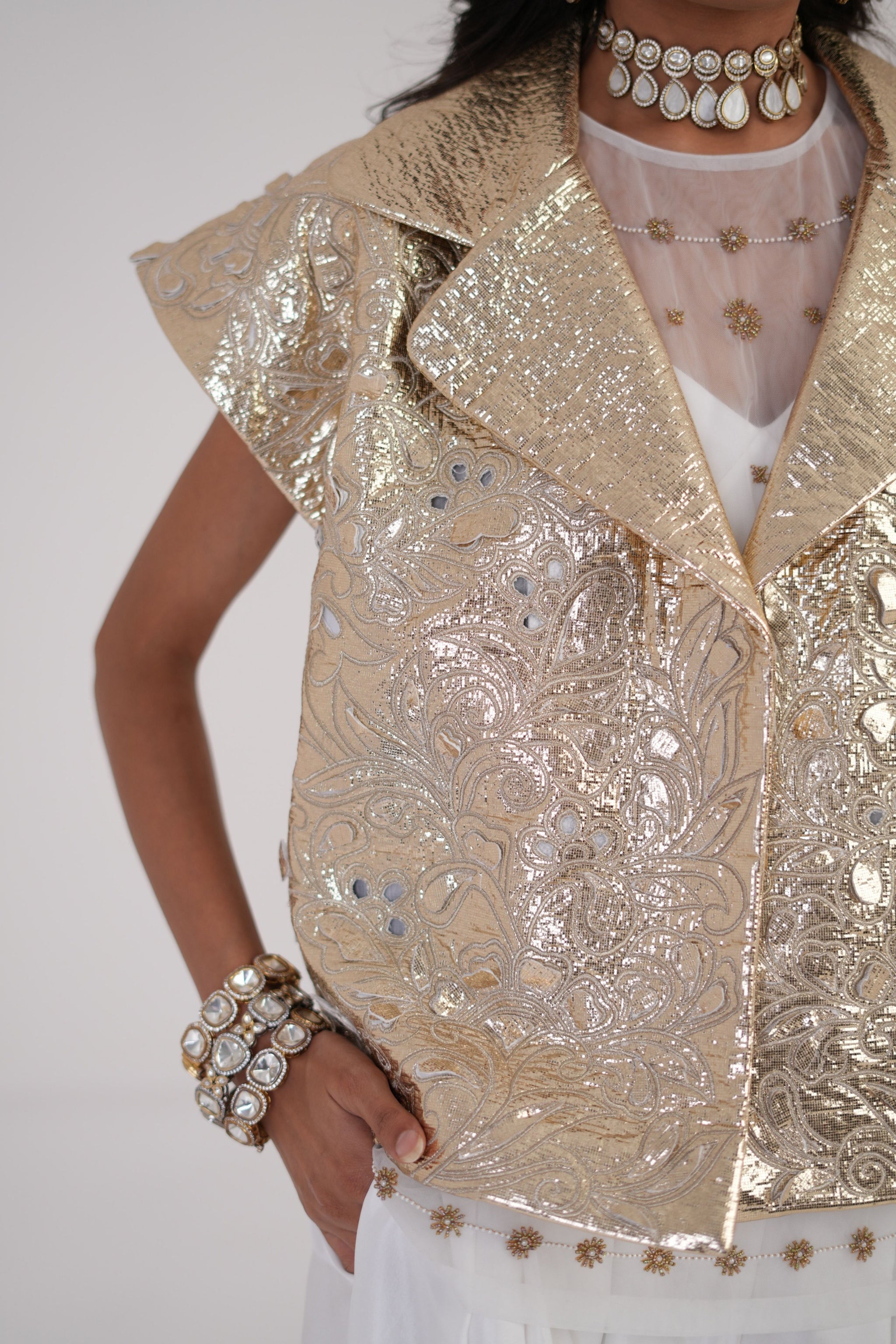 • Step into statement-making style with the moon bloom jacket by be true- a bold expression of modern elegance fused with timeless tradition. Crafted from a high-quality blend fabric, this jacket features gold cutwork motifs that instantly catch the eye and elevate any outfit. The white base offers a clean, sophisticated canvas for the intricate gold detailing, making this jacket anything but subtle. Its versatile silhouette allows you to style it effortlessly over silk pants, denims, or even flowy dresses, perfect for when you want to make an impression without saying a word. A perfect fusion of contemporary edge and traditional craftsmanship, the moon bloom jacket is more than just outerwear- it's a wardrobe icon.
