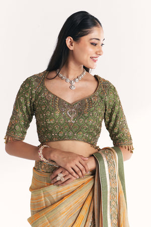 • Morni green saree features the inspiration from peacock with the intricate hand embroidery with beautiful hues. The ensemble is completed with a sheer dupatta adorned with intricate border detailing, making it perfect for festive occasions and cultural celebrations.