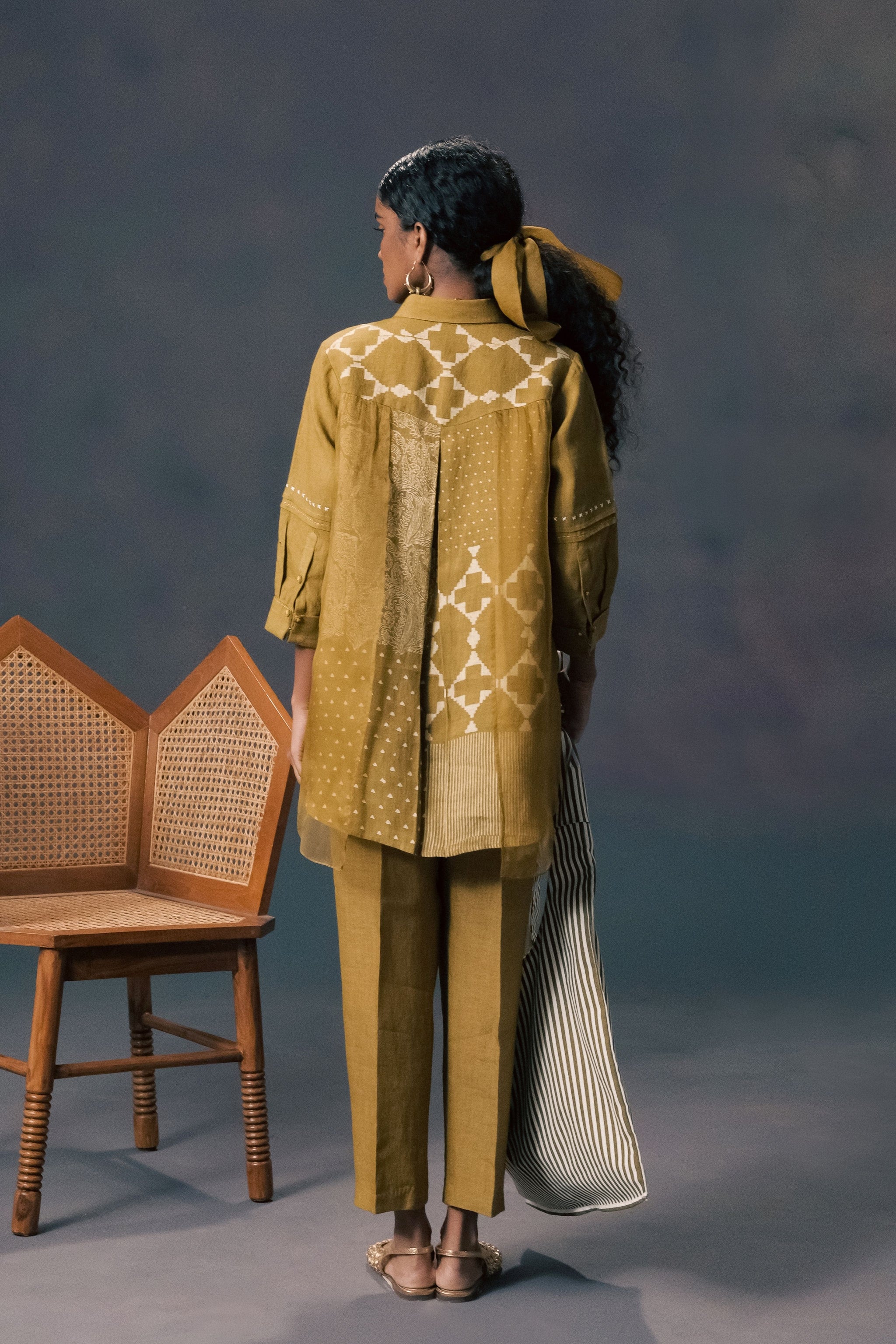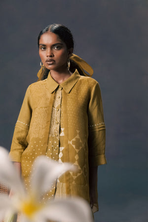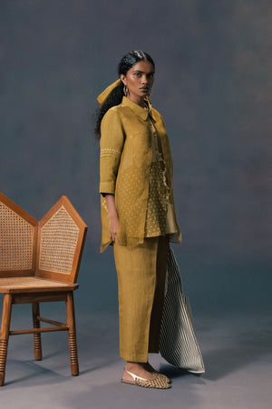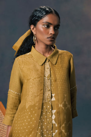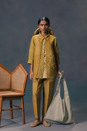 • Moss green double layer discharge print shirt in linen and organza with straight pants in linen