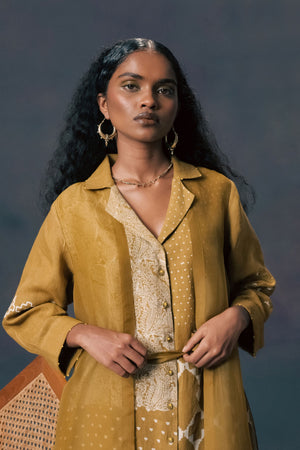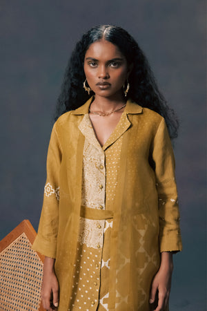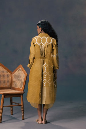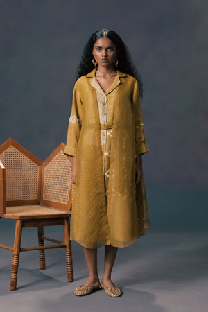 • Moss green double layer discharge print dress in linen and organza with embroidered sleeves
