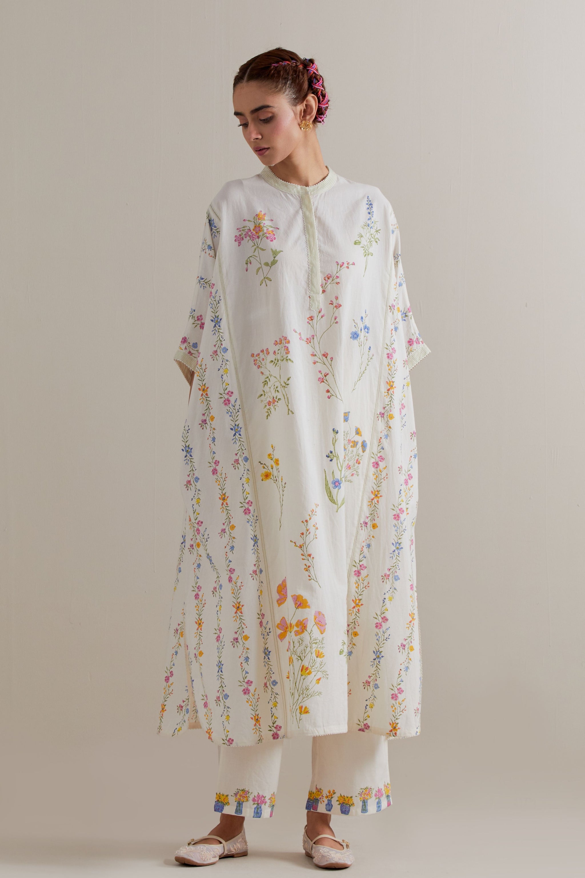 • Off white cotton easy fit kaftan with all-over multi coloured flower hand block print, highlighted with ladder lace at sides panels. It has a round neck with a button placket in the front. The edges of sides, neck, and hem are finished with ric rac. Paired with off white cotton straight pants with multi coloured small floral hand block printed border at hem. It has side pockets and an elasticated waistband with drawstrings in the front for a better fit.