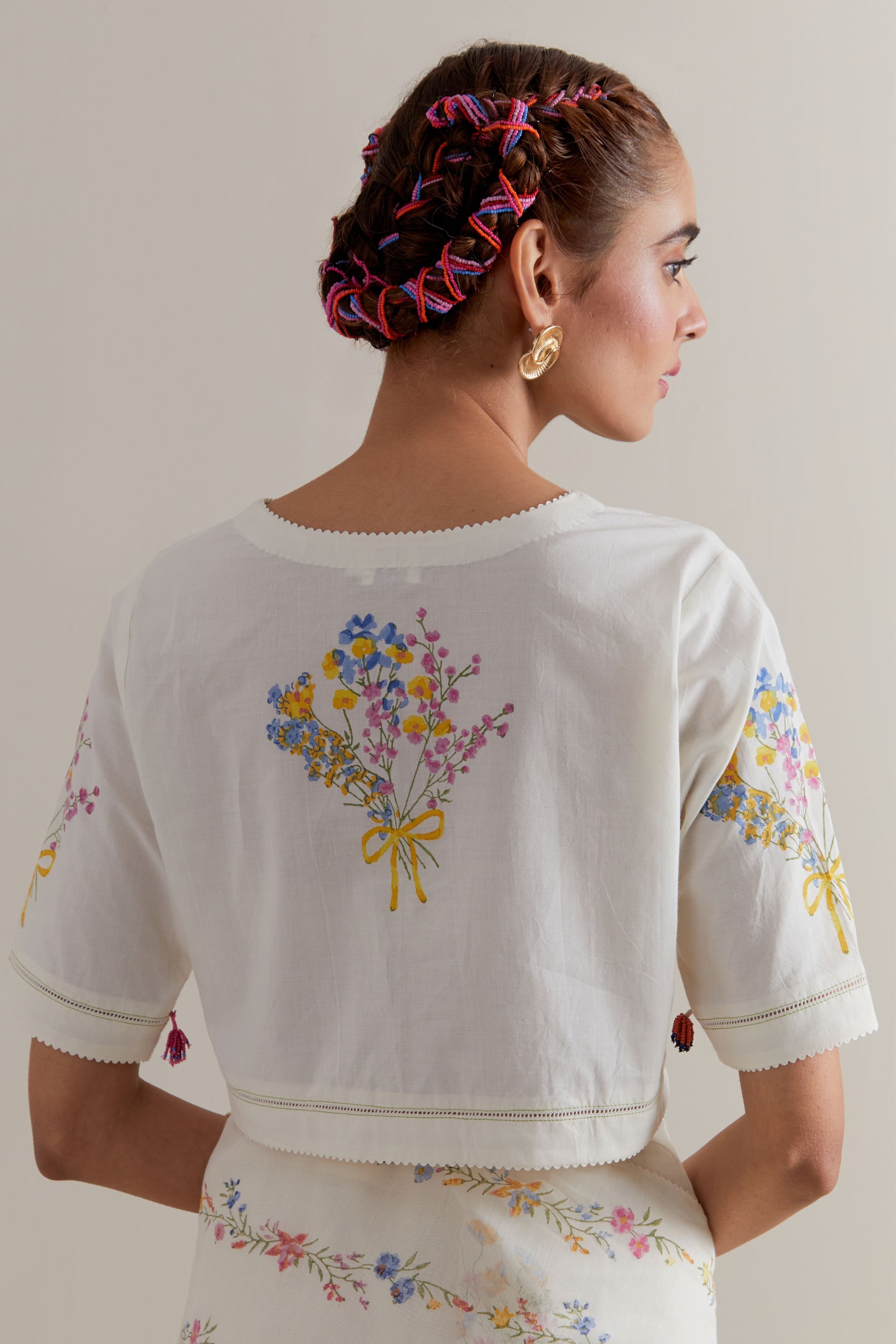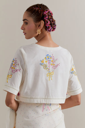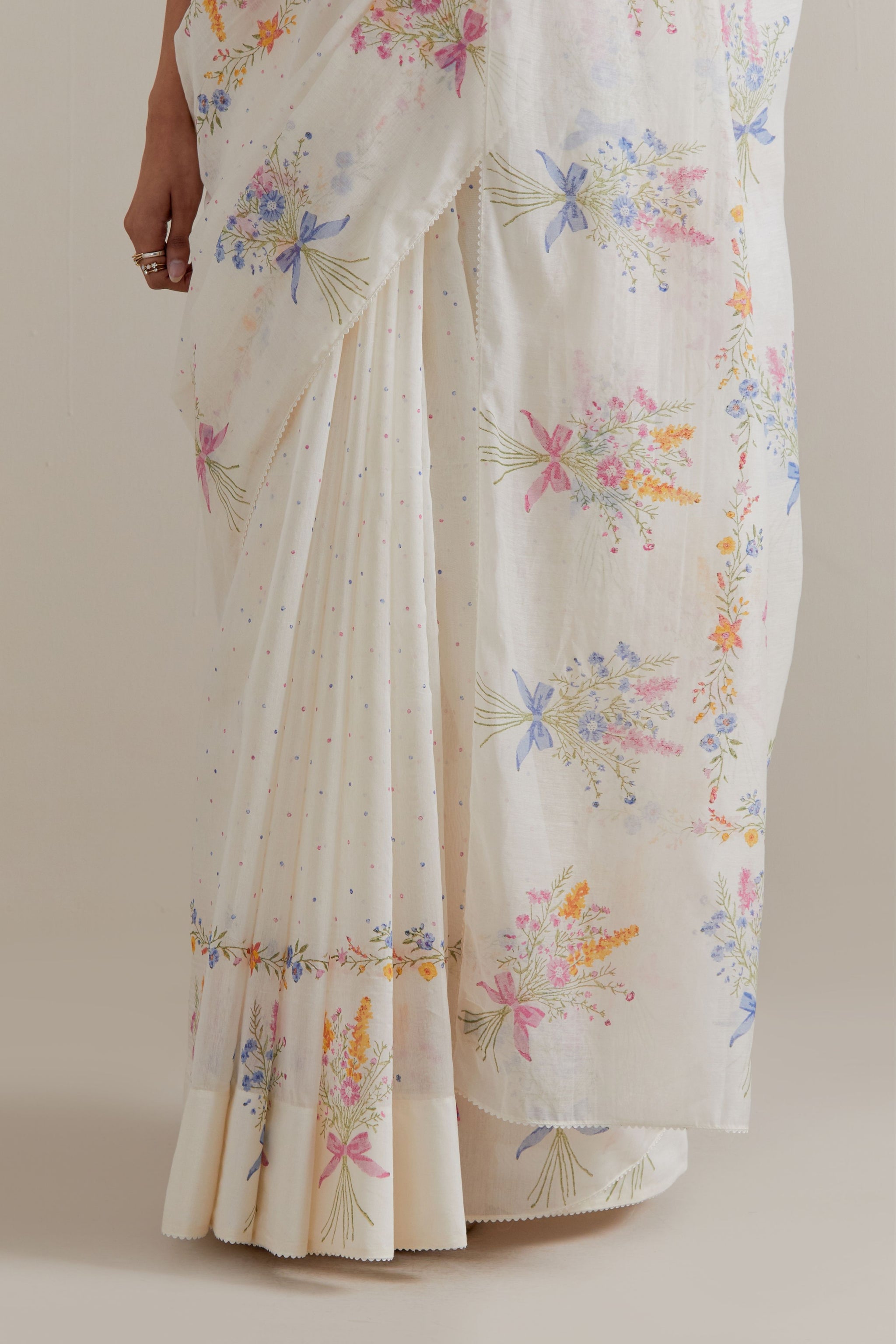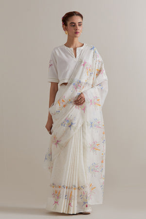 • Off-white chanderi cotton saree with all-over multi coloured floral hand block printed boots on the sides and small polka dots throughout. The edges of the saree are finished with ric rac. The corners of the saree pallu have beaded tassels. Paired with off-white cotton blouse with multi coloured floral hand block printed boots at sleeves and back. The edges of sleeves, neck, side slits and hem are finished with ric rac.