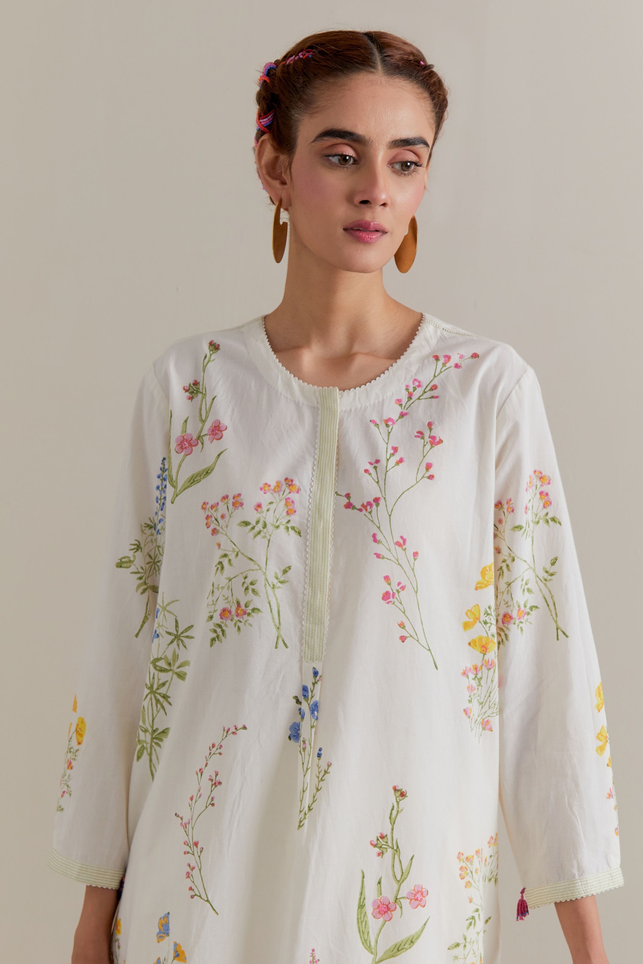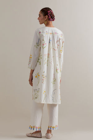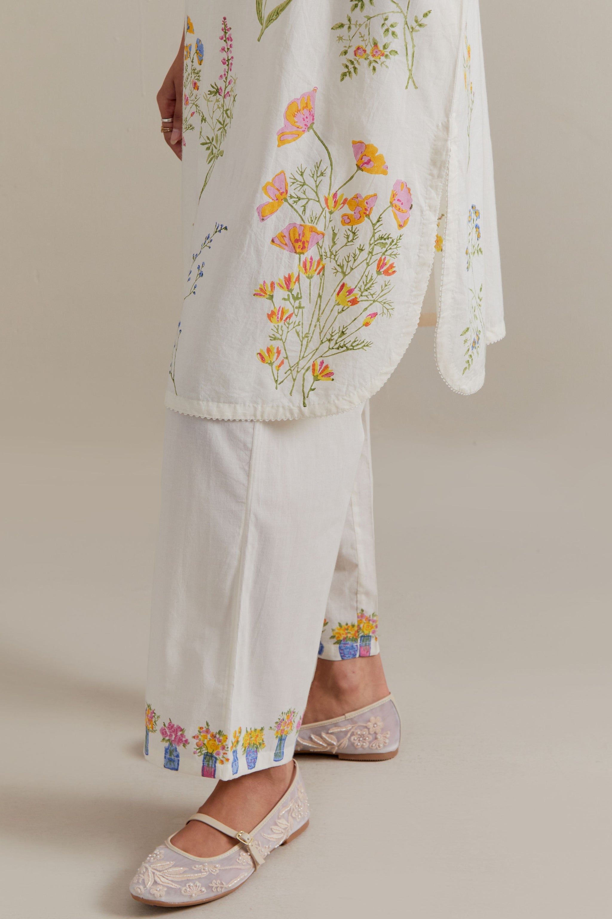 • Off white cotton straight short kurta with all-over multi coloured flower hand block print and side pockets. It has a round neck with a button placket in the front. The edges of long sleeves, neck, side slits and round hem are finished with ric rac. Paired with off white cotton straight pants with multi coloured small floral hand block printed border at hem. It has side pockets and an elasticated waistband with drawstrings in the front for a better fit. Comes with off white cotton chanderi dupatta with all-over pink & green floral hand block print. The edges of the dupatta are finished with ric rac. The corners of the dupatta have beaded tassels.