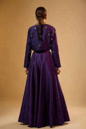 • This 3 piece lehenga set comes with a jacket which is embroidered with zardosi, mirror and tikkis. It is paired with silk skirt and bustier.