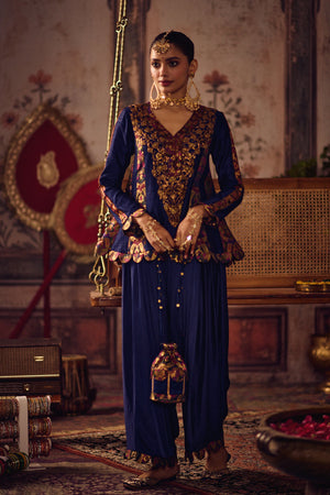 • This royal blue peplum kurta in raw silk kheem khaab is crafted with multi-colour hand embroidery and intricately stitched panels. Paired with a farshi salwar in cotton satin, it reflects rich Punjabi couture with regal movement and detail.