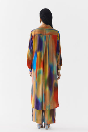 • The Night Queen Kurta Shirt & Pants crafted from our stunning vegan silk fabrication, trans-seasonal, is a statement piece. This two piece set, printed in our brushstrokes print resembling a night queen flower, has a chic look. With embroidered flowers in sequin and beads, the shirt has a boxy fit. With a front opening, it has dropped shoulders. It is paired with our matching night queen straight fit pants with an elasticated back. Wear it with heels for an elegant look. The model is wearing a Size M and is 5'8.