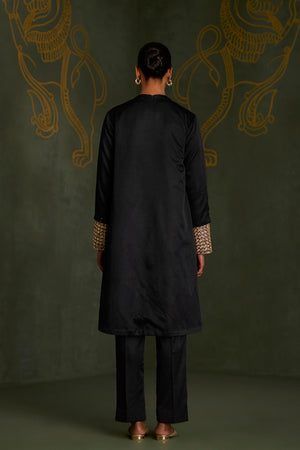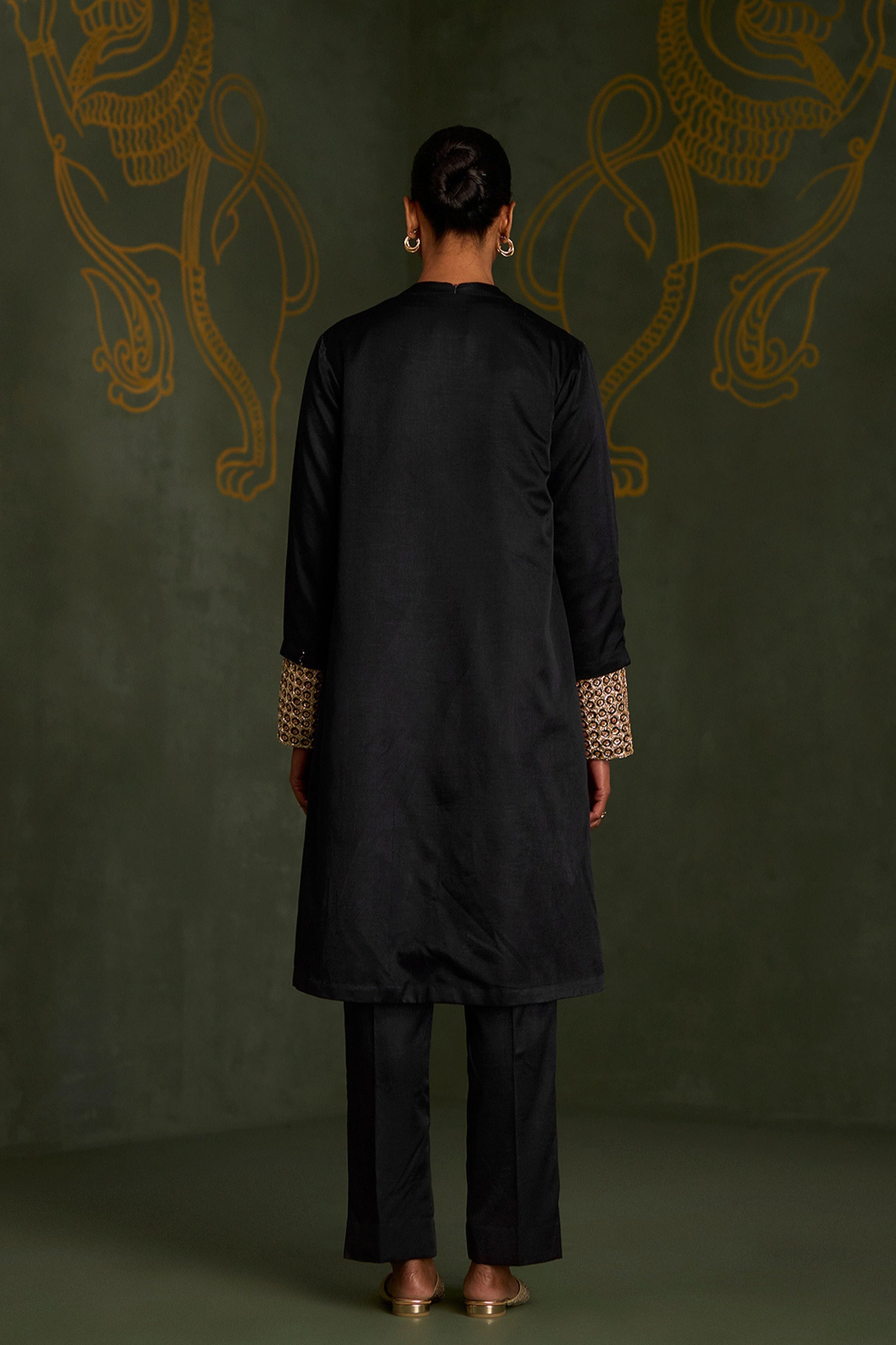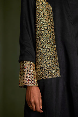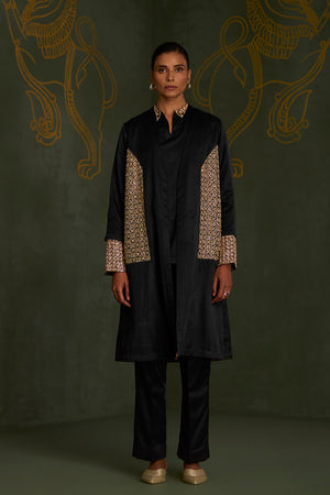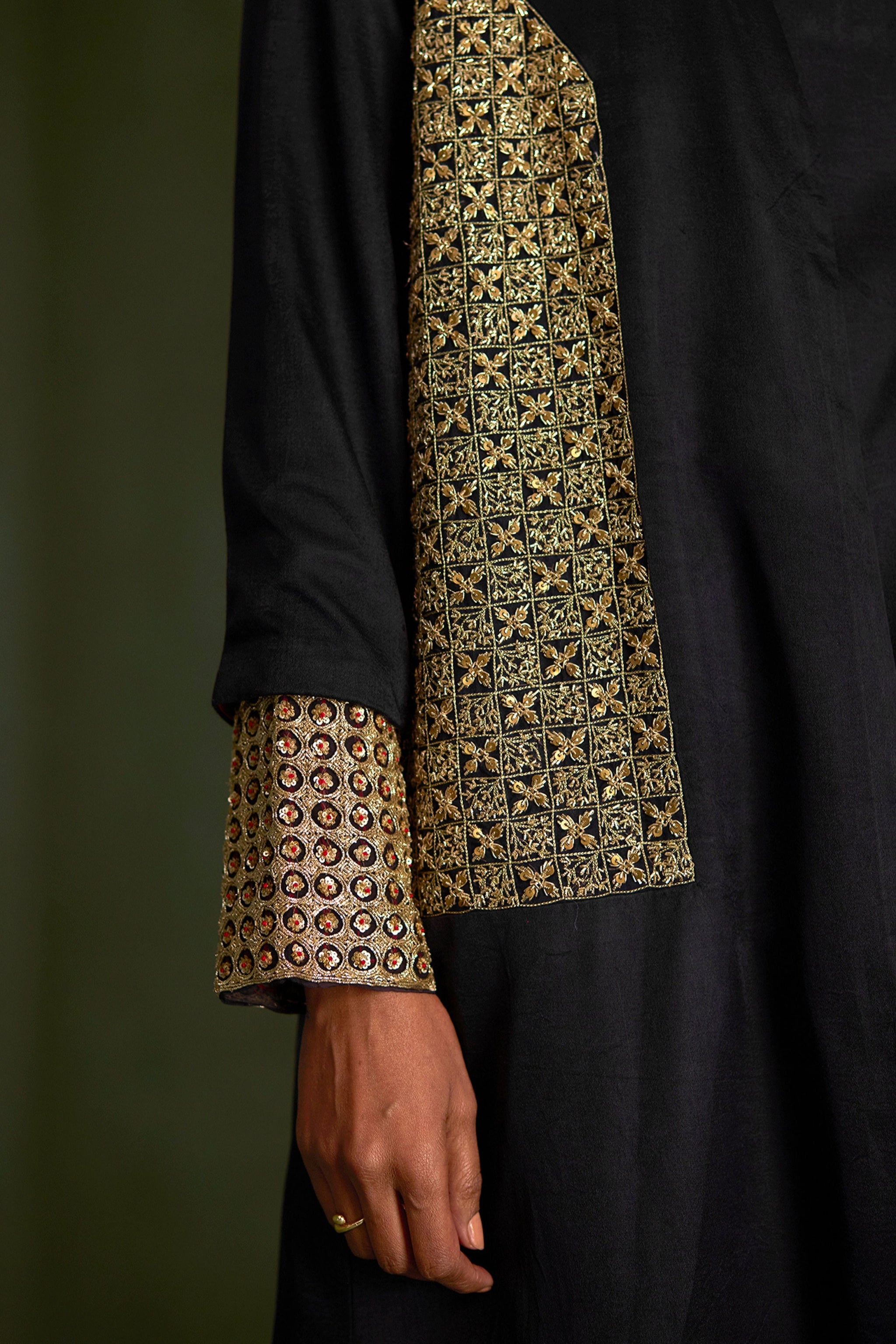 • Step into understated elegance with this luxurious three-piece jacket set, crafted from rich gajji silk. The ensemble features a hand-embroidered open-front jacket adorned with intricate dabka, naqshi, and sequin work, perfectly paired with a sleek inner top detailed with embroidered cuffs and a delicately embellished collar. Coordinated solid silk pants complete the look, making this set ideal for evening soirees, festive gatherings, or refined celebrations.