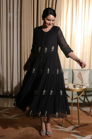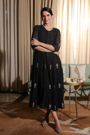 • The black tier dress carries delicate hand embroidery across its tiers of mul chanderi. It moves with ease and elegance, ideal for evening festivities and dusky soirées. A treasure for the woman who finds beauty in quiet luxury.