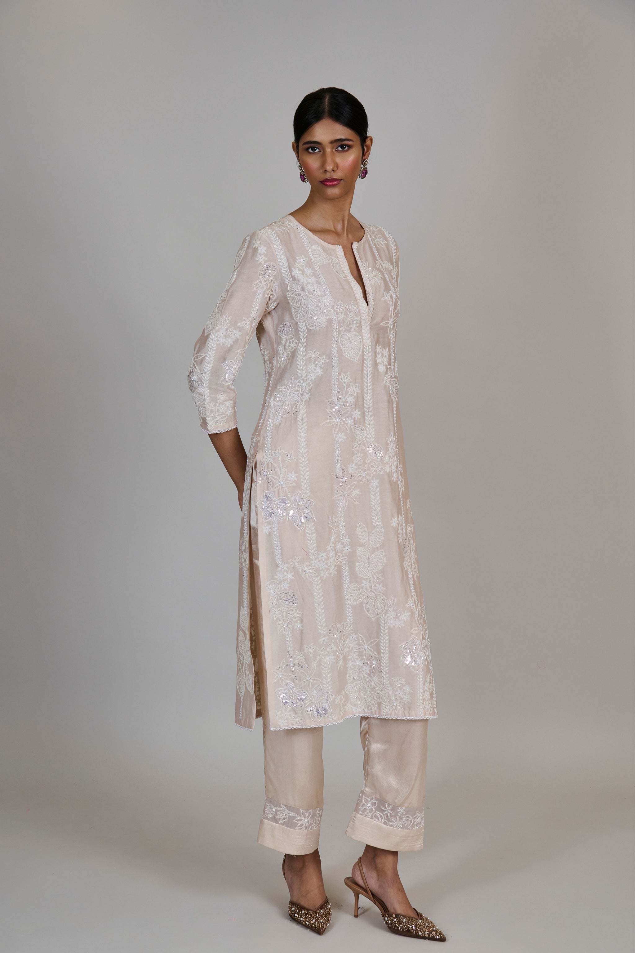 • Tropical floral embroidery kurta and pants with hem embroidery