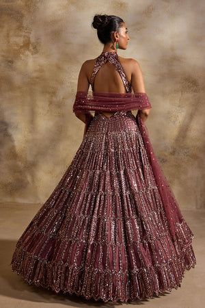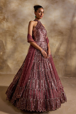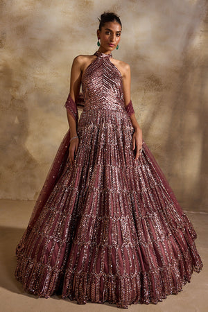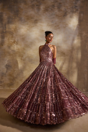 • Old rose tulle halter necked gown heavily embellished in bronze metallics, sequins and crystals accompanied with a worked dupatta