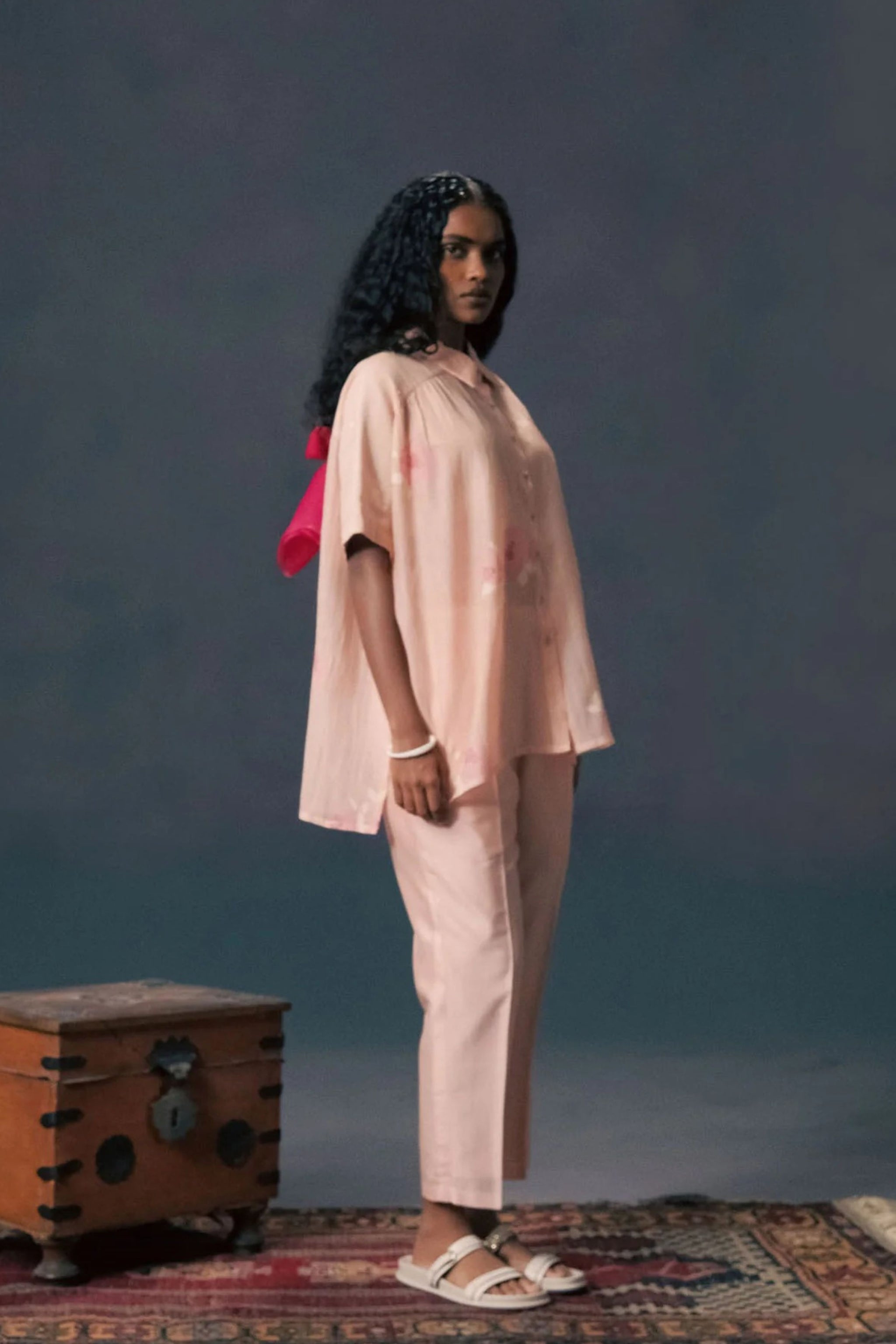 • Old rose shirt in mul chanderi with screen printed straight pants in silk chanderi