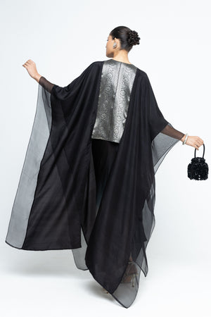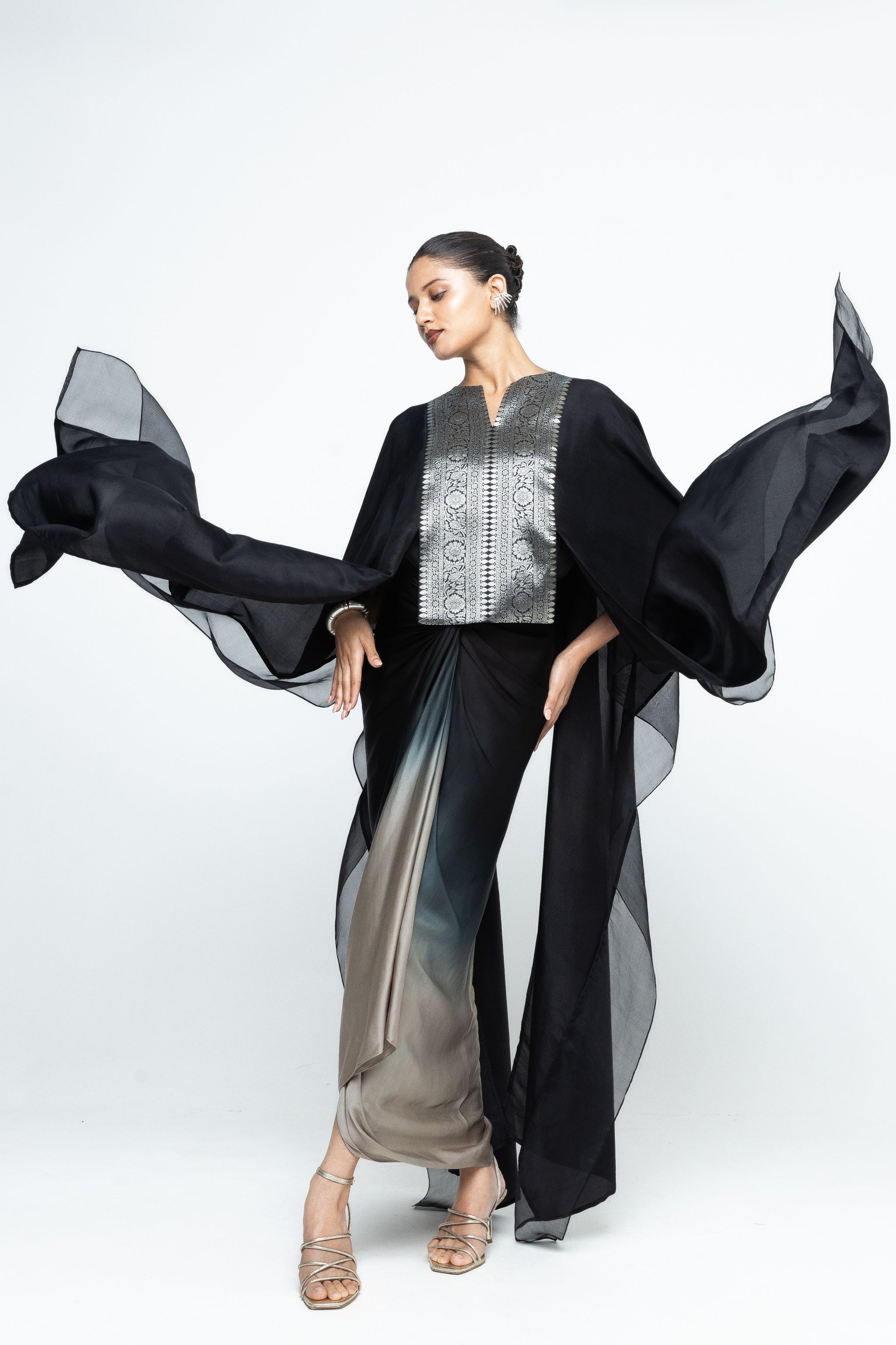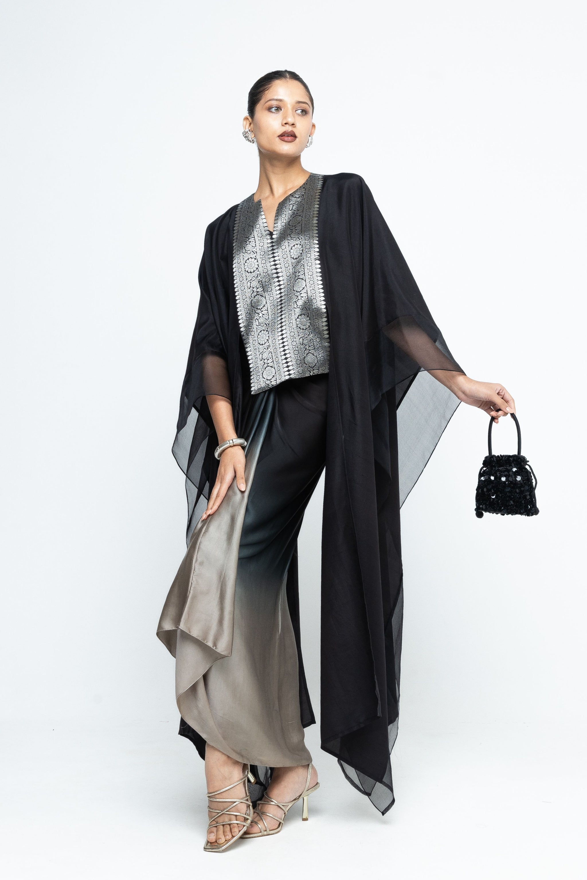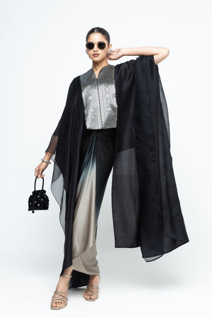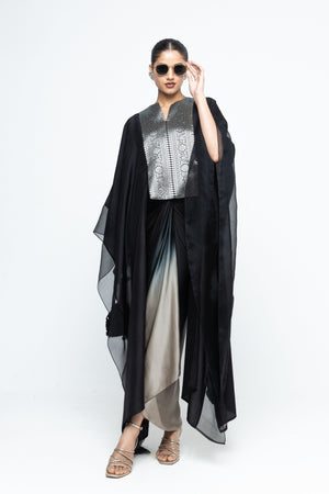 • Black flowy silk cape with brocade neck and back detail and organza finish paired with an ombre Asymmetrical tie detail skirt