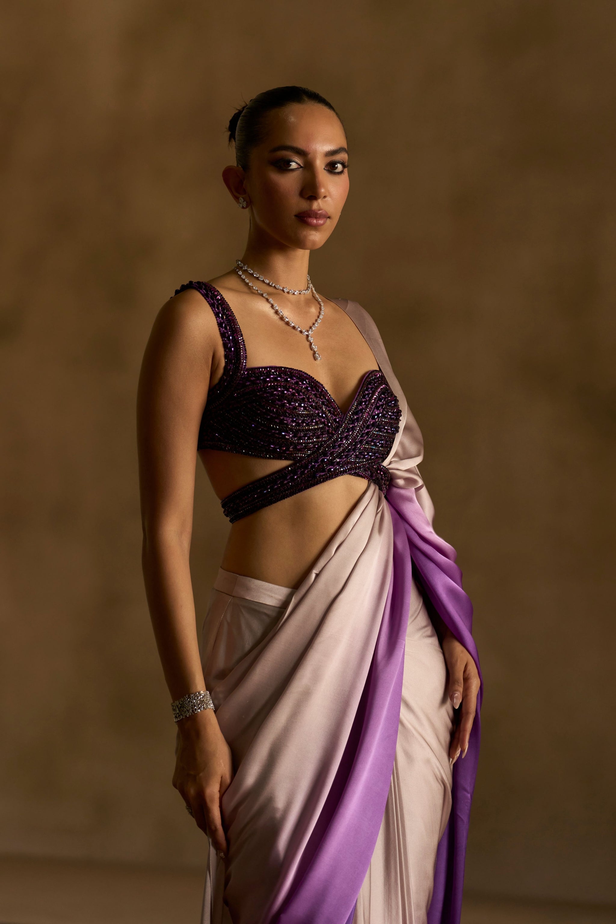 • Greyish lavender and purple ombre shaded lustrous satin pre-draped skirt, teamed with cut sleeves blouse, encrusted with glass crystals.
