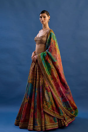 • Multicolour print lehenga set with crystal embellishment. It is paired with complimenting corset blouse and a dupatta.