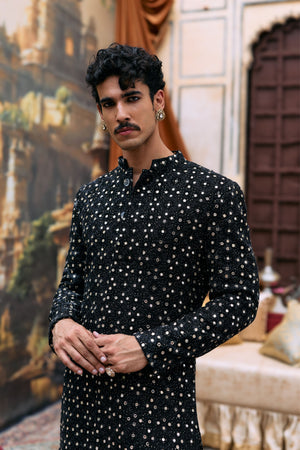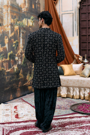 • Black chikankari embroidered sherwani paired with black velvet pants DISCLAIMER: This piece is handcrafted, and slight variations in weave, embroidery, and finish are natural. These variations are not imperfections, but a testament to the artistry that makes each creation unique.