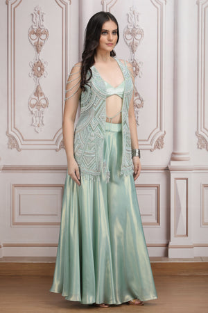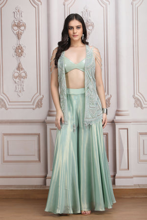 • This elegant pastel green ensemble features a stylish bralette paired with flowing palazzo pants and a delicately embellished sheer jacket. The look combines modern silhouettes with intricate detailing, perfect for festive occasions or contemporary celebrations.