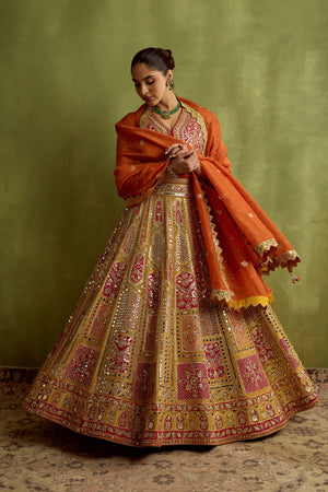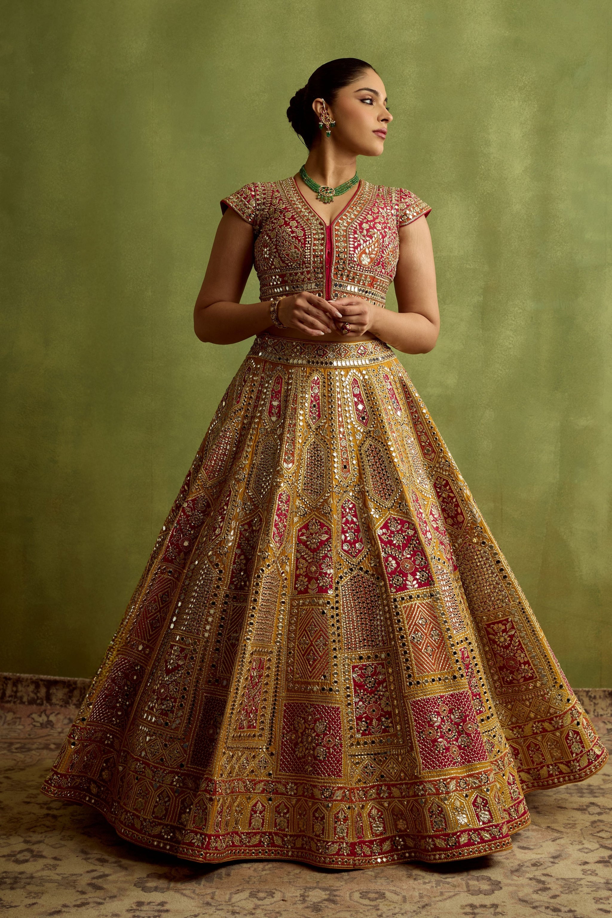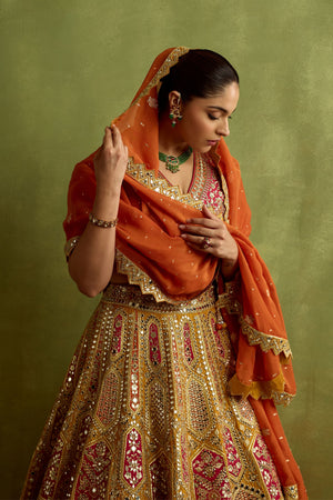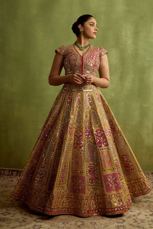 • Yellow patch silk lehenga set embroidered with gota and zari mirrorwork