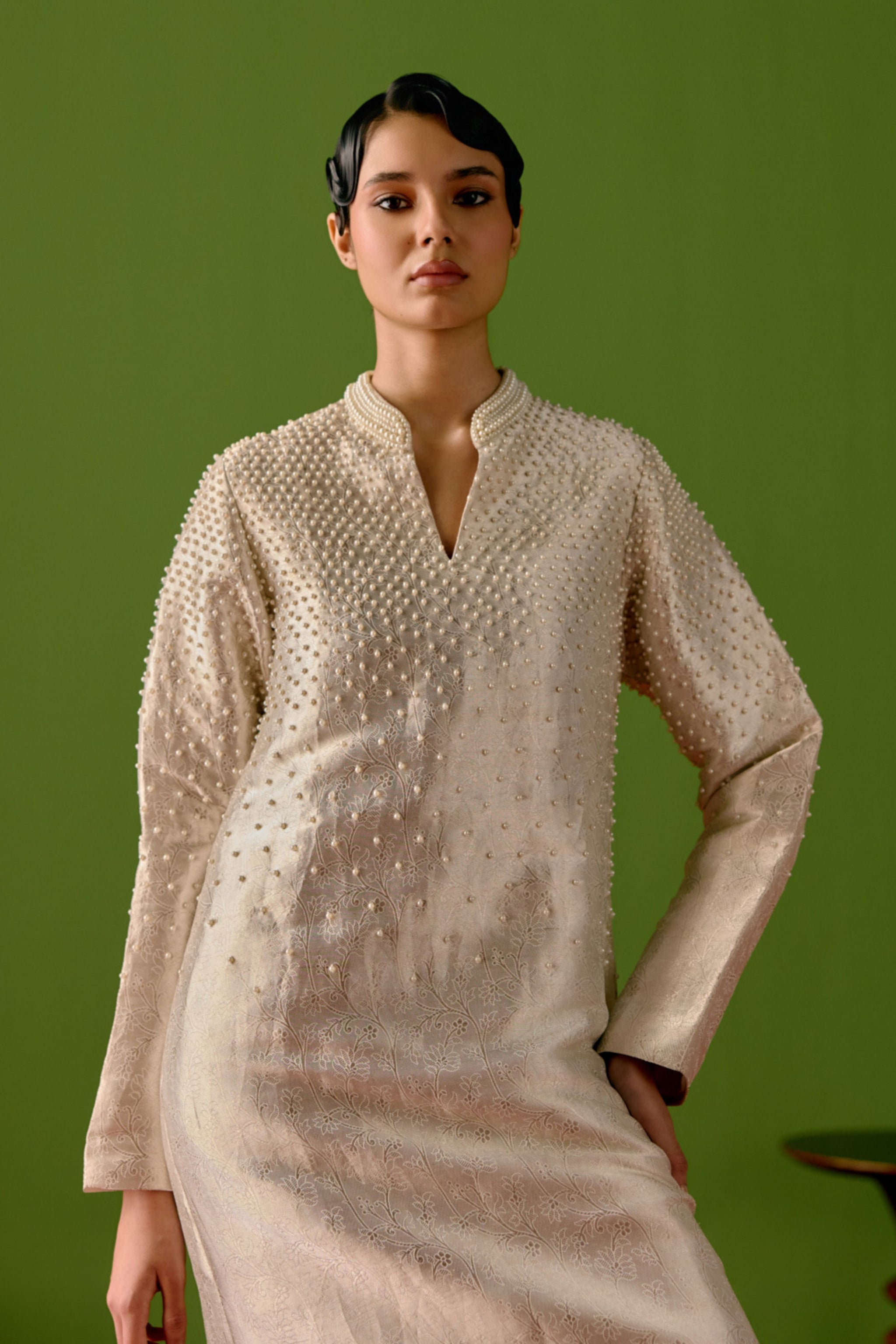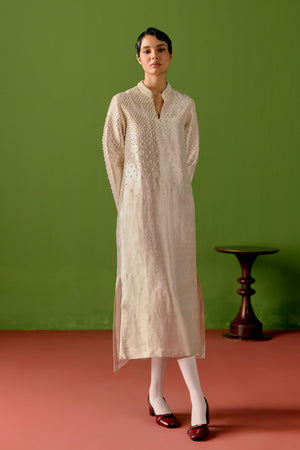 • Effortlessly striking and beautifully versatile, this kaftan-inspired long dress is crafted in hand-woven tanchoi, celebrated for its rich texture and fluid drape. Designed to move with ease and confidence, the silhouette features elegant high slits that add a contemporary edge while enhancing movement and wearability. Please note, all pieces are made by hand, celebrating handwoven fabrics and hand made, hence there might be some irregularities from piece to piece.