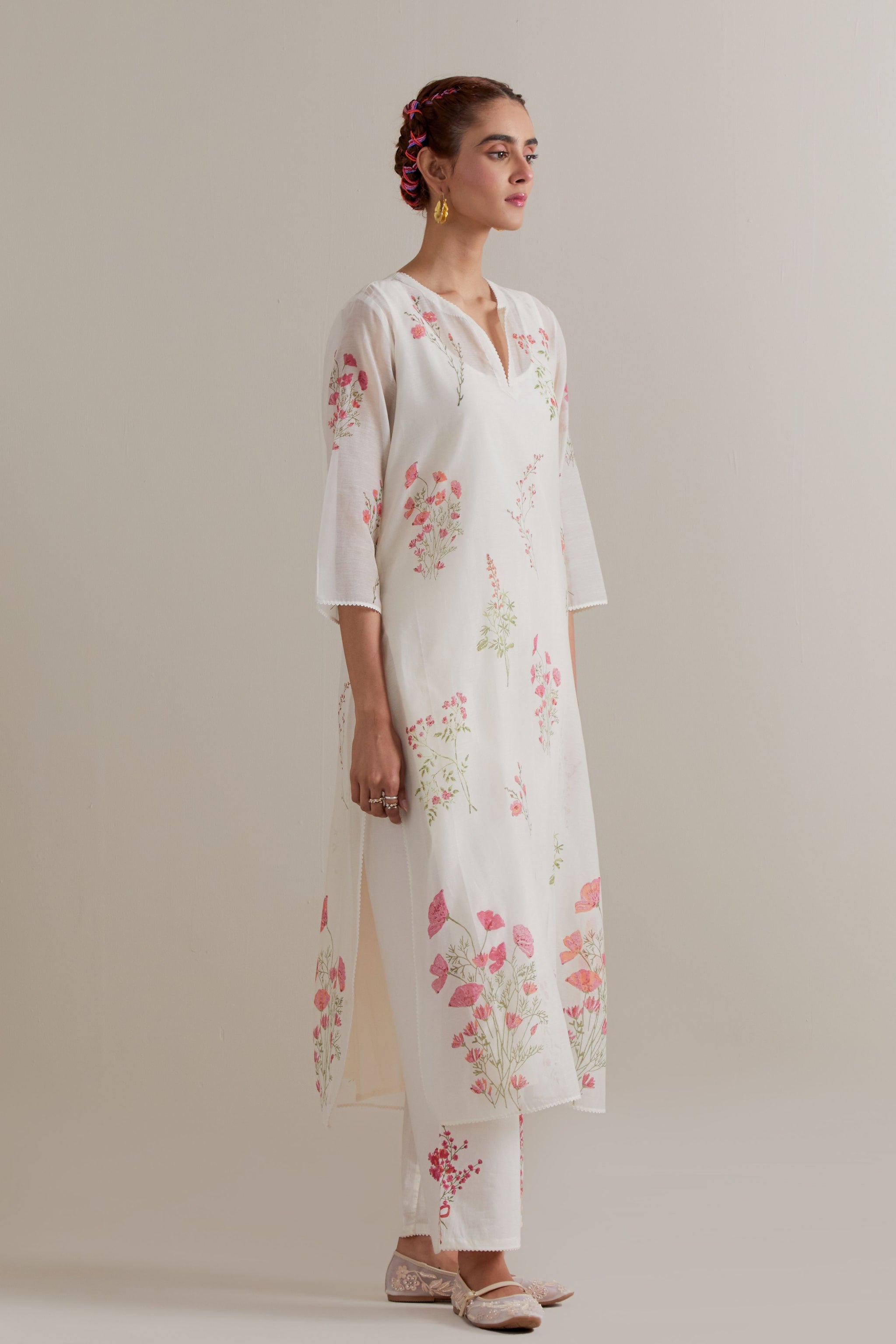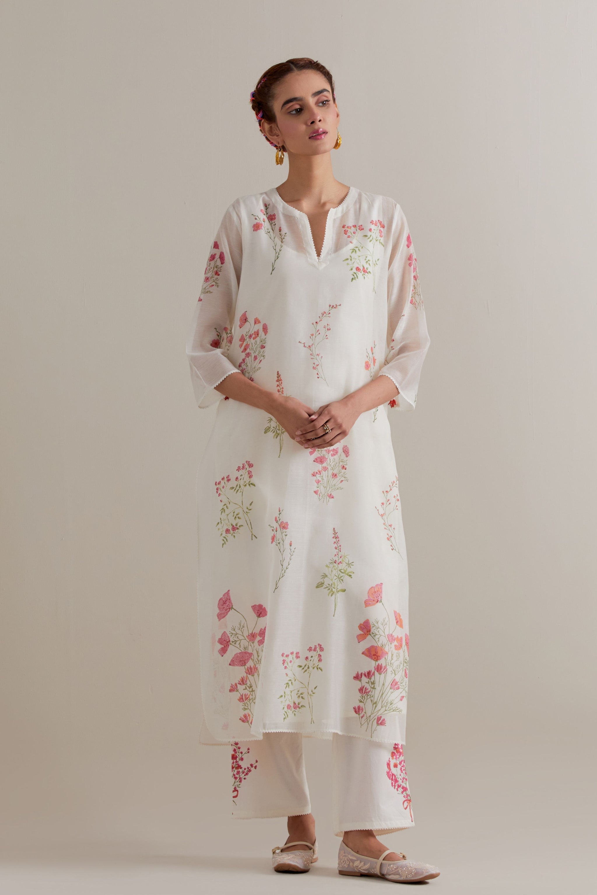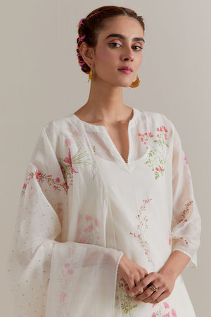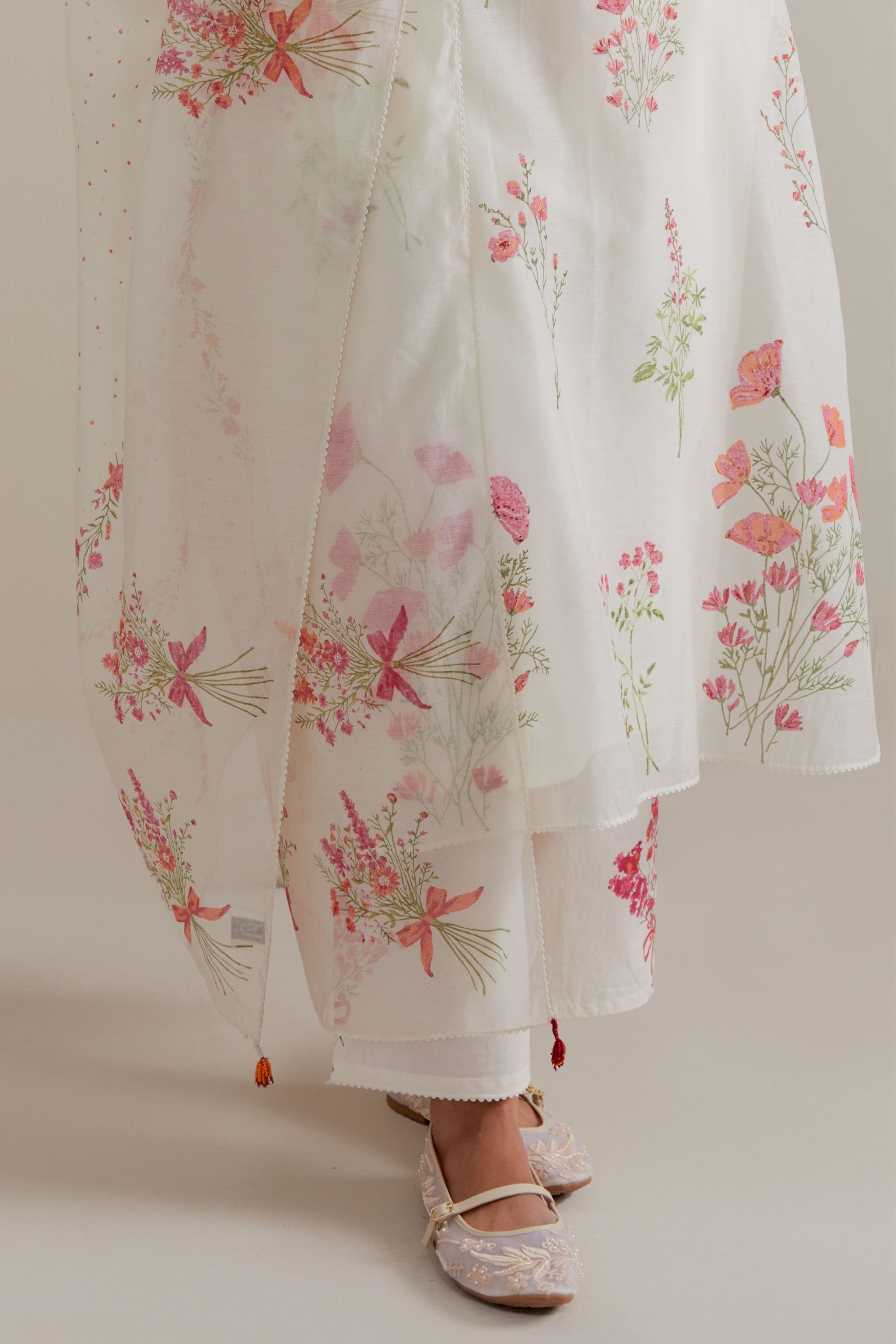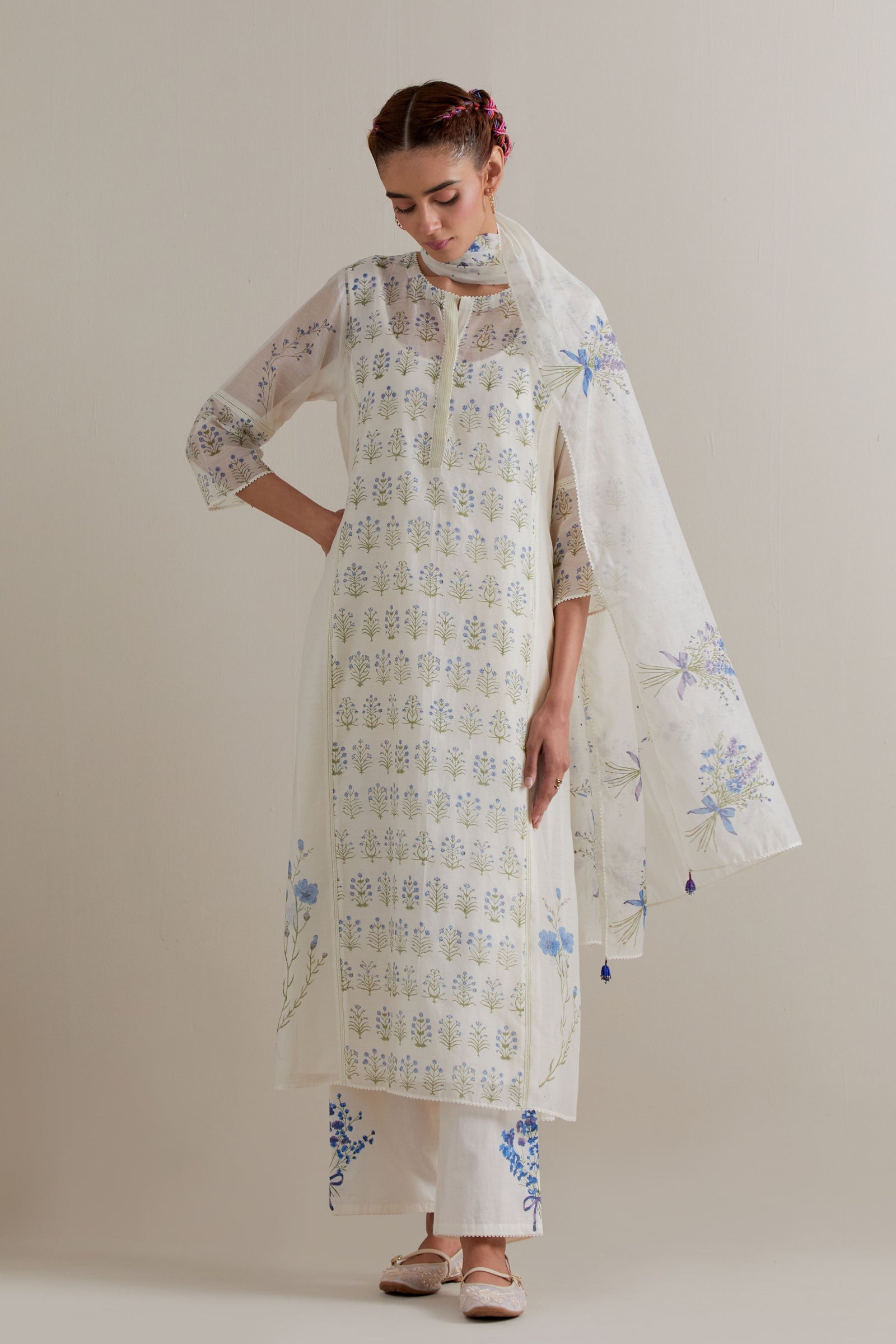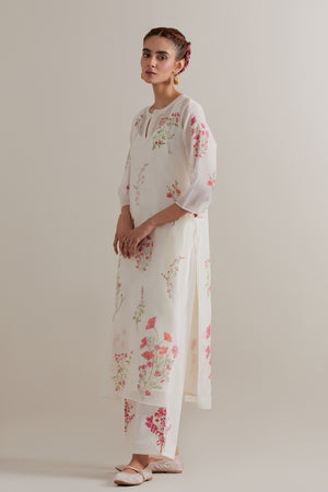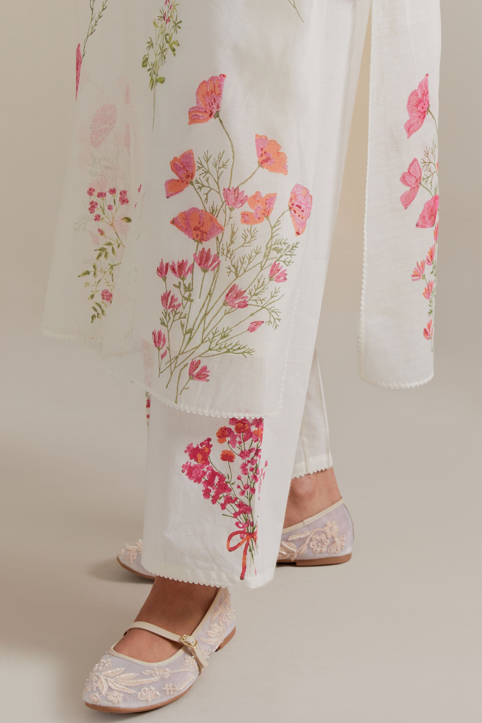 • Off white cotton chanderi hand block printed kurta with all-over pink and green coloured flower. It has round neck with slit in the front. The edges of 3/4 sleeves, neck, side slits and hem are finished with ric rac. Worn with a cotton slip. Paired with off white cotton straight pants with pink and green floral hand block printed boots at sides. It has side pockets and an elasticated waistband with drawstrings in the front for a better fit. Comes with off white cotton chanderi dupatta with all-over pink & green floral hand block print. The edges of the dupatta are finished with ric rac. The corners of the dupatta have beaded tassels.