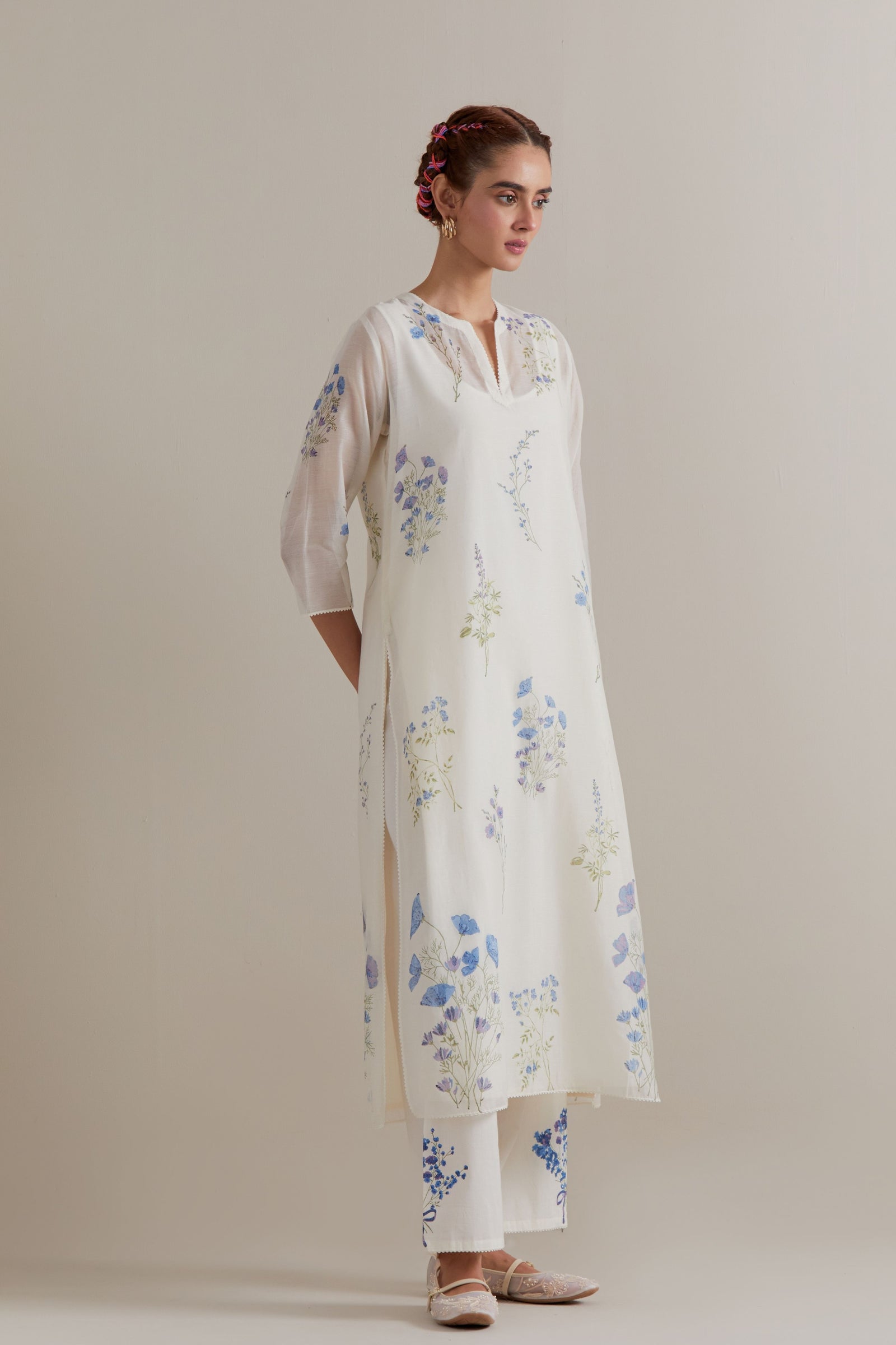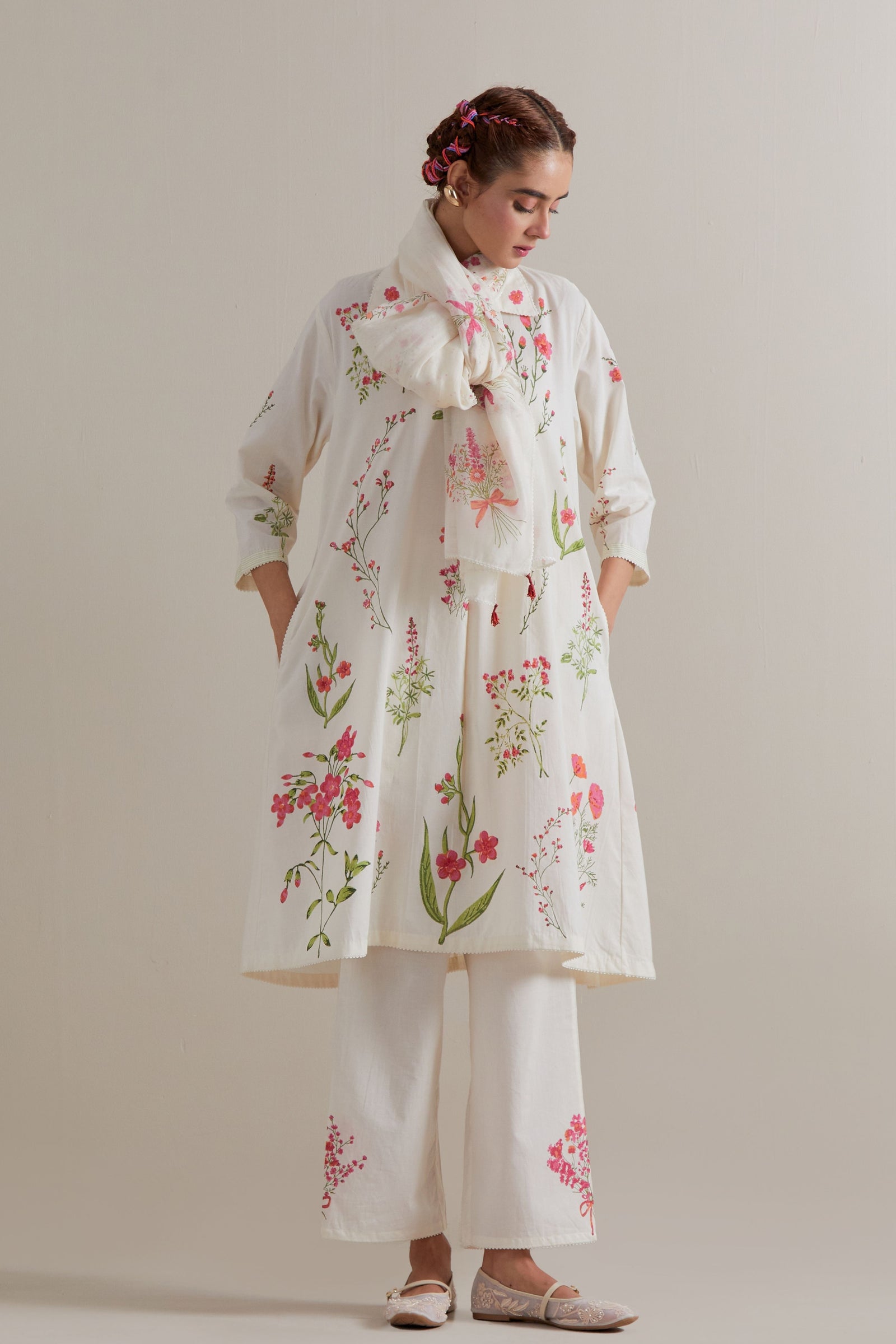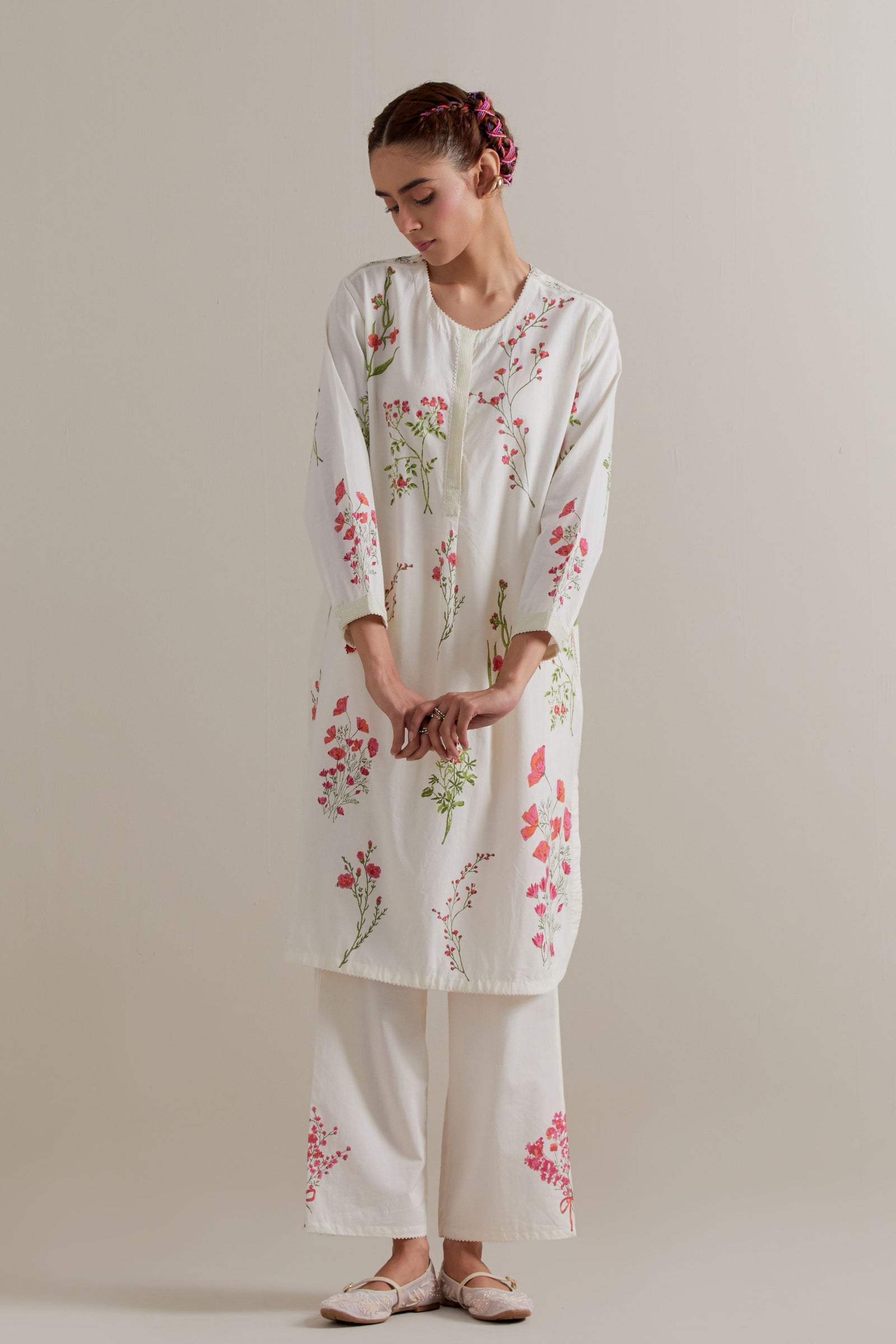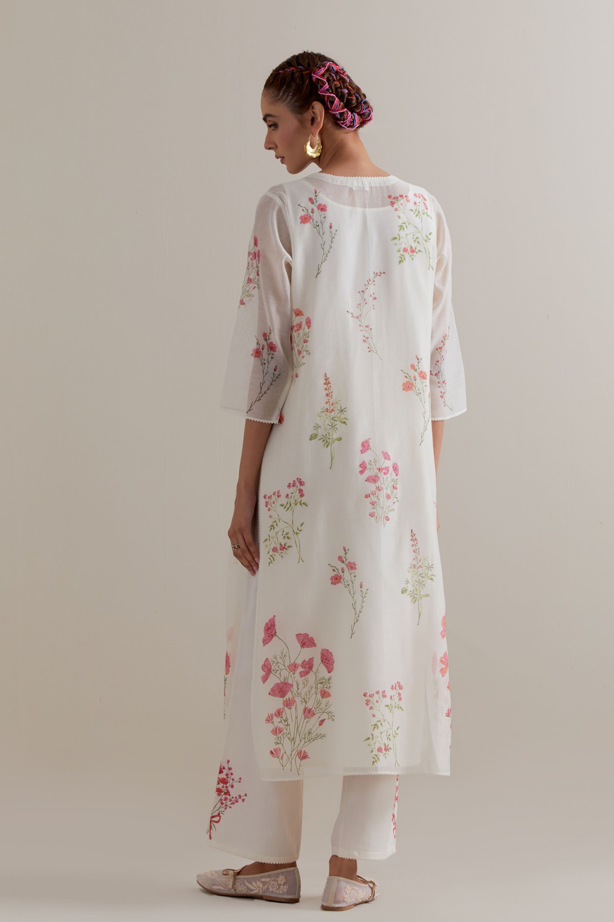 • Off white cotton chanderi hand block printed kurta with all-over pink and green coloured flower. It has round neck with slit in the front. The edges of 3/4 sleeves, neck, side slits and hem are finished with ric rac. Worn with a cotton slip. Paired with off white cotton straight pants with pink and green floral hand block printed boots at sides. It has side pockets and an elasticated waistband with drawstrings in the front for a better fit. Comes with off white cotton chanderi dupatta with all-over pink & green floral hand block print. The edges of the dupatta are finished with ric rac. The corners of the dupatta have beaded tassels.