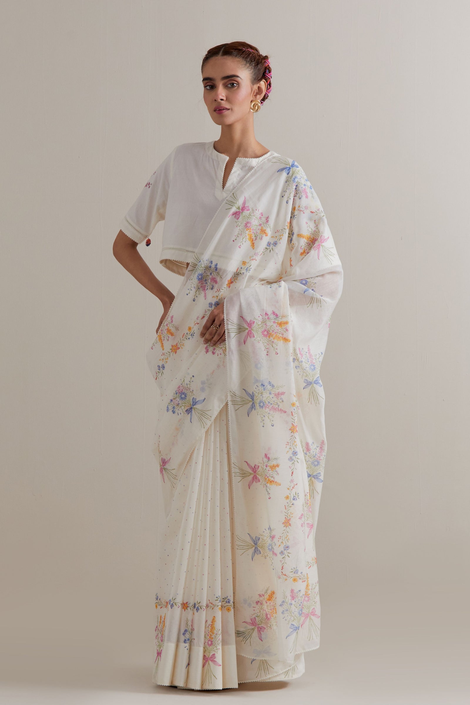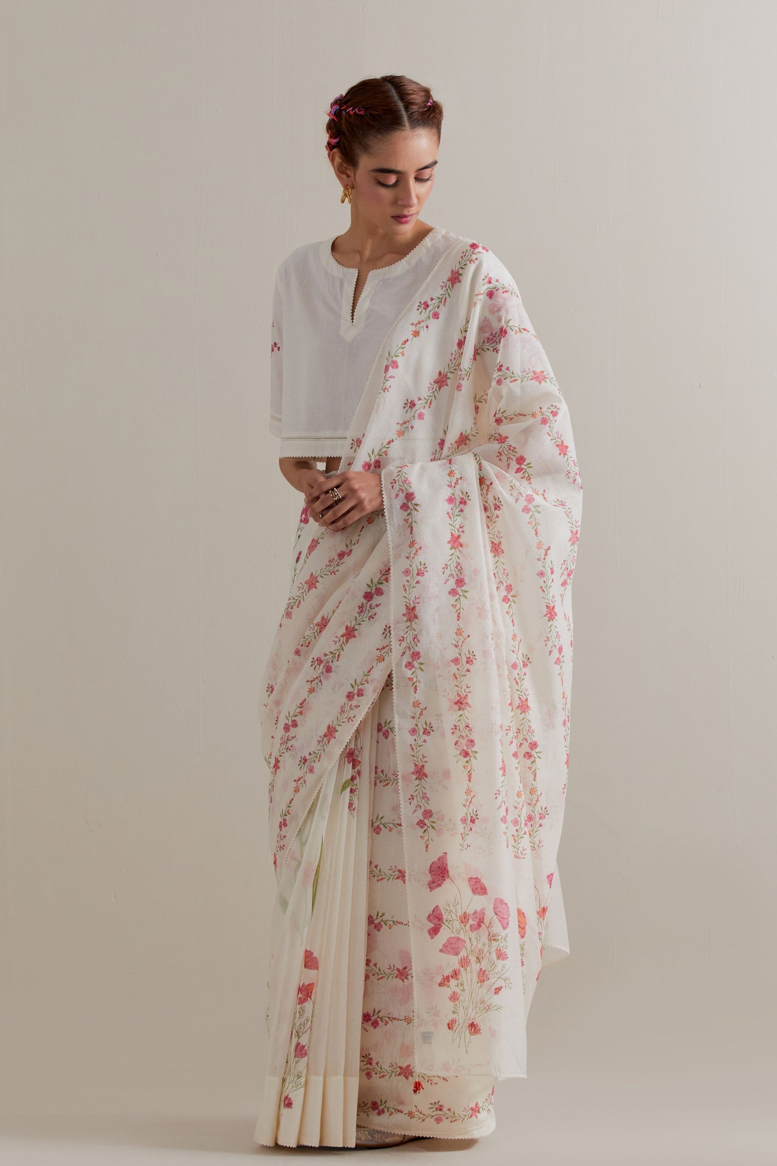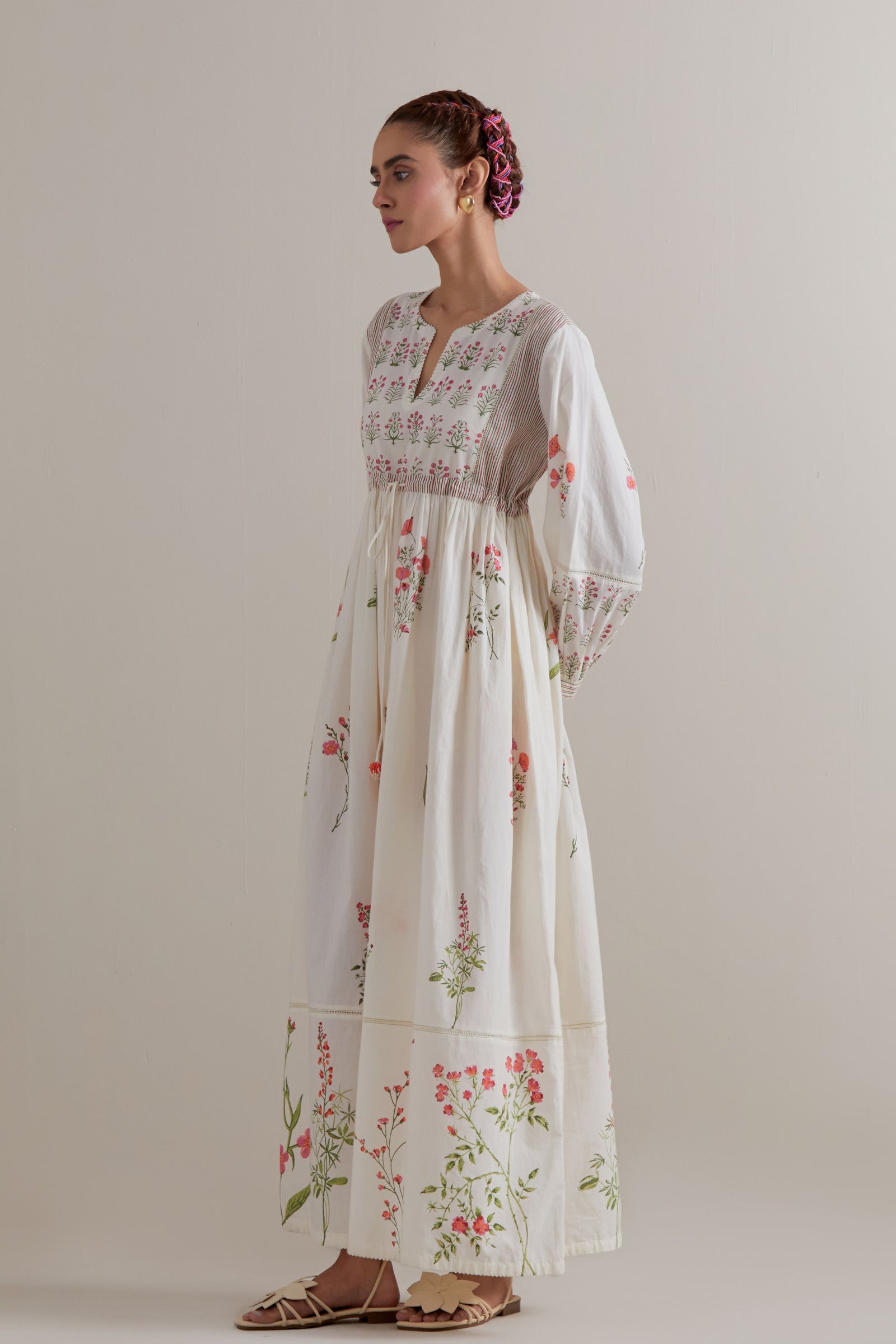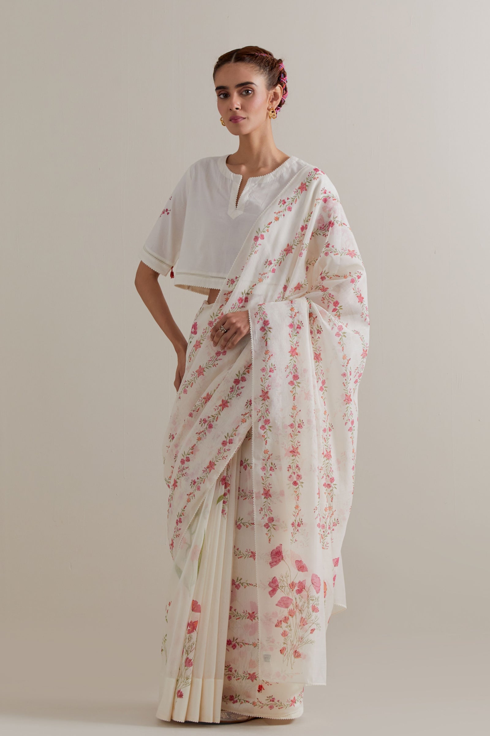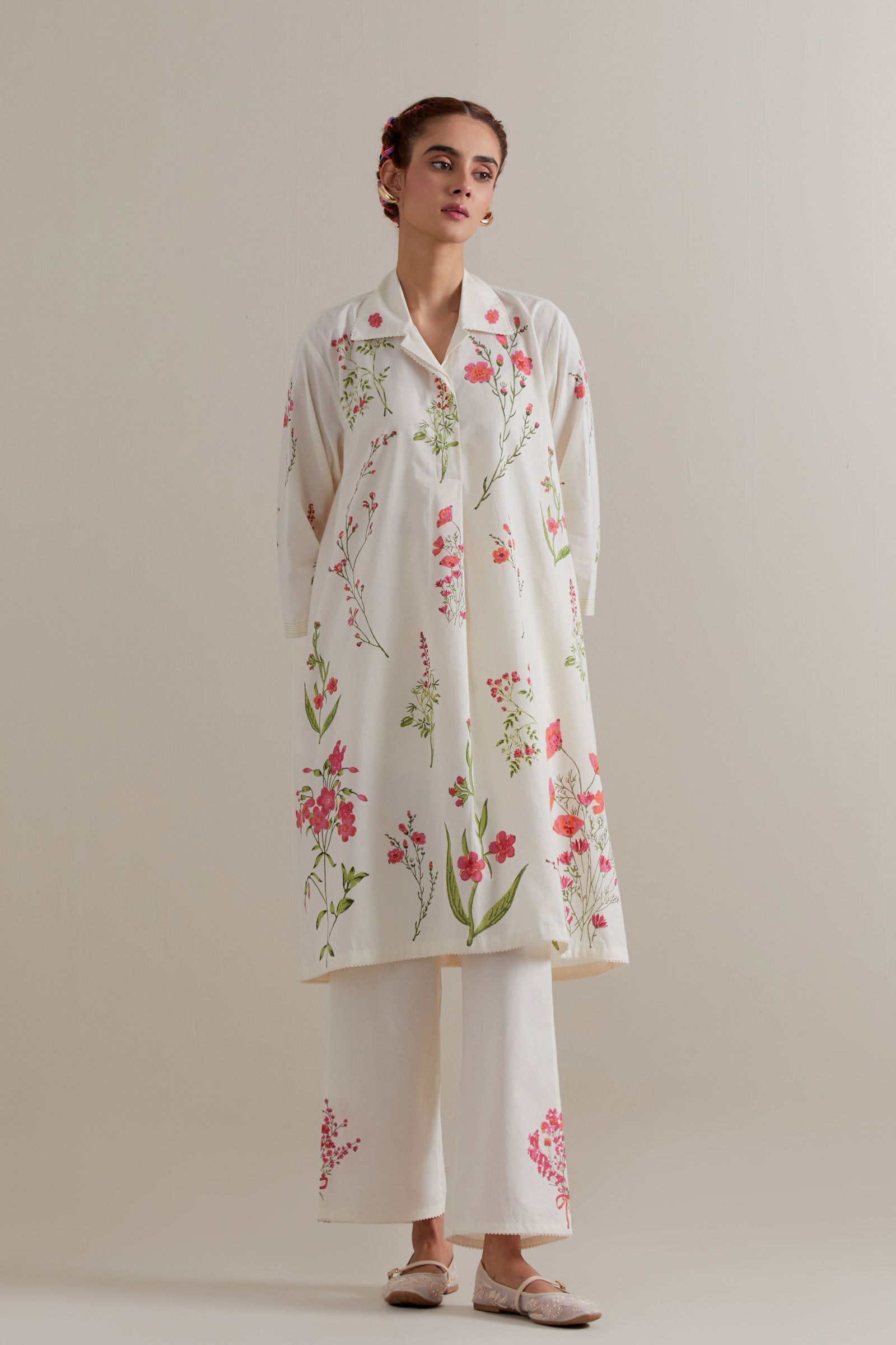 • Off white cotton chanderi hand block printed kurta with all-over pink and green coloured flower. It has round neck with slit in the front. The edges of 3/4 sleeves, neck, side slits and hem are finished with ric rac. Worn with a cotton slip. Paired with off white cotton straight pants with pink and green floral hand block printed boots at sides. It has side pockets and an elasticated waistband with drawstrings in the front for a better fit. Comes with off white cotton chanderi dupatta with all-over pink & green floral hand block print. The edges of the dupatta are finished with ric rac. The corners of the dupatta have beaded tassels.
