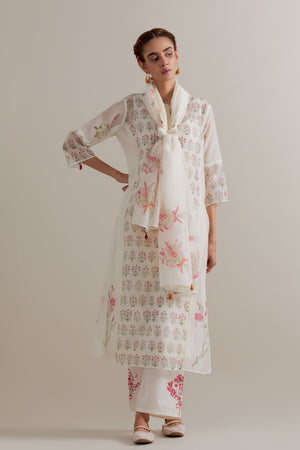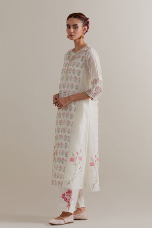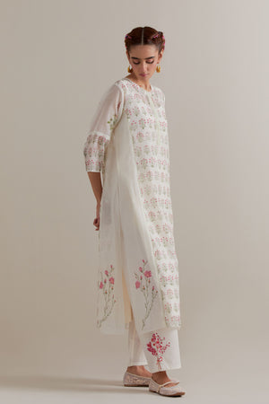 • Off white cotton chanderi kurta with all-over pink & green floral hand block print and side panels, highlighted with off white ric rac. It has a round neck with a button placket in the front and sleeves are 3/4th. The kurta is finished with the rick rack lace at the edges of neck, sleeves, panels, side slits and hem. Worn with a cotton slip inside. Paired with off white cotton straight pants with pink and green floral hand block printed boots at sides. It has side pockets and an elasticated waistband with drawstrings in the front for a better fit. Comes with off white cotton chanderi dupatta with all-over pink & green floral hand block print. The edges of the dupatta are finished with ric rac. The corners of the dupatta have beaded tassels.