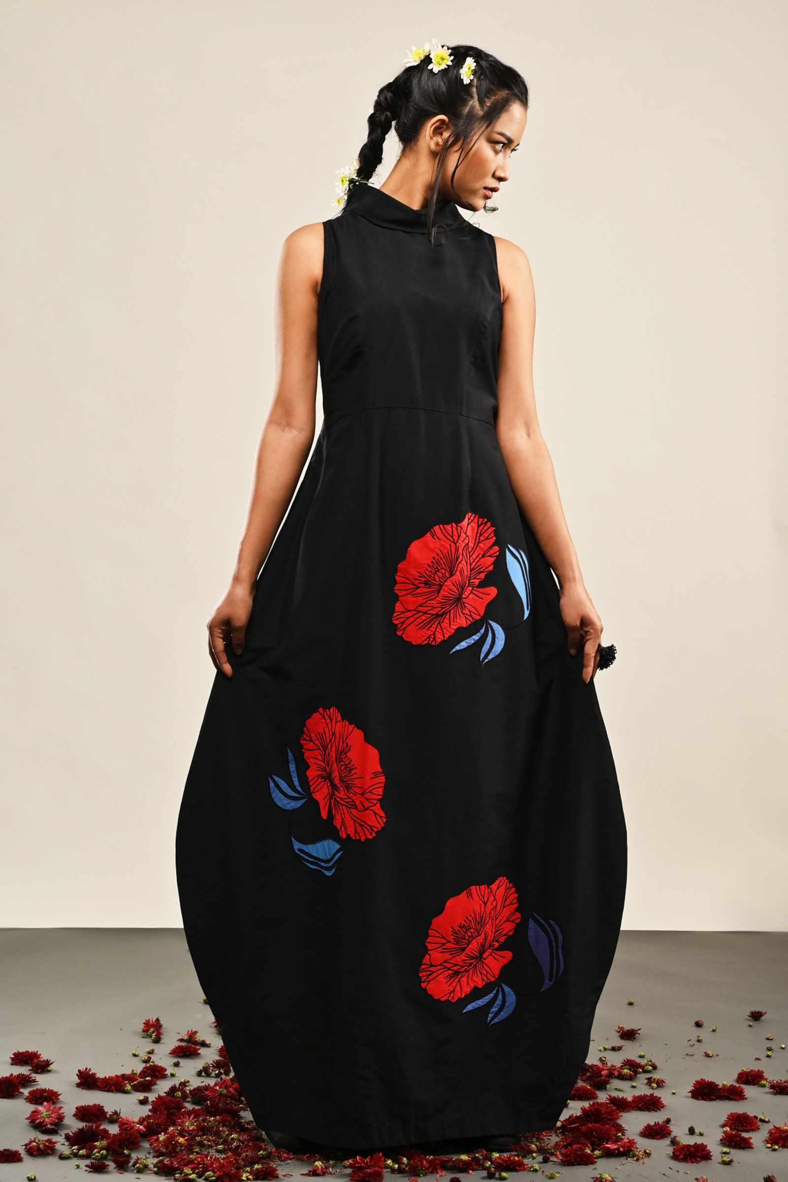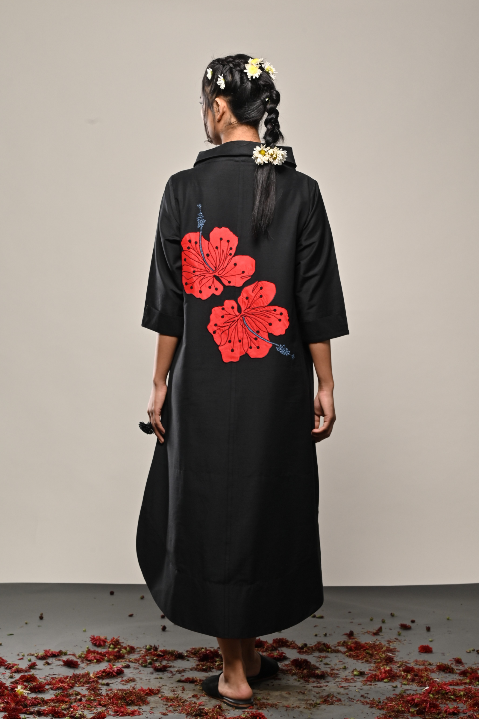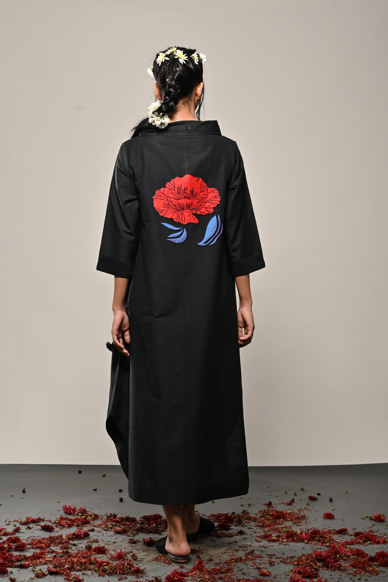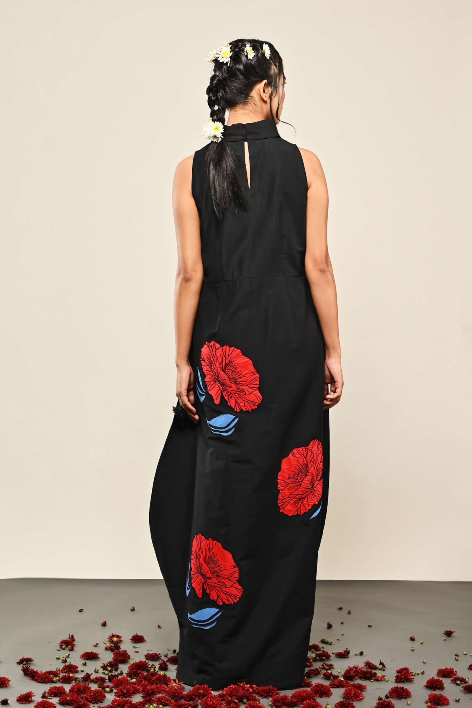 • Black cotton silk dress with appliqued floral pattern Appliqued