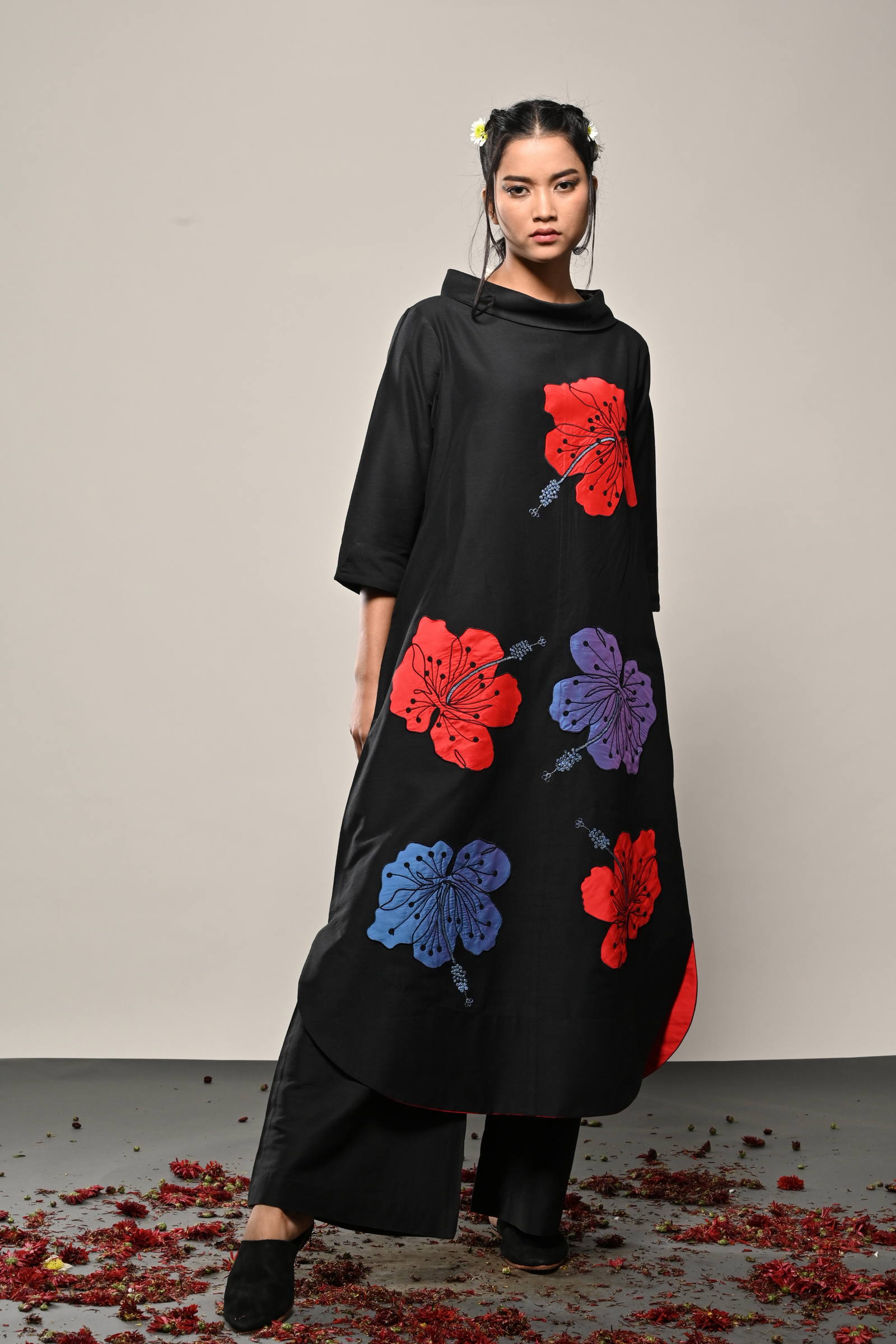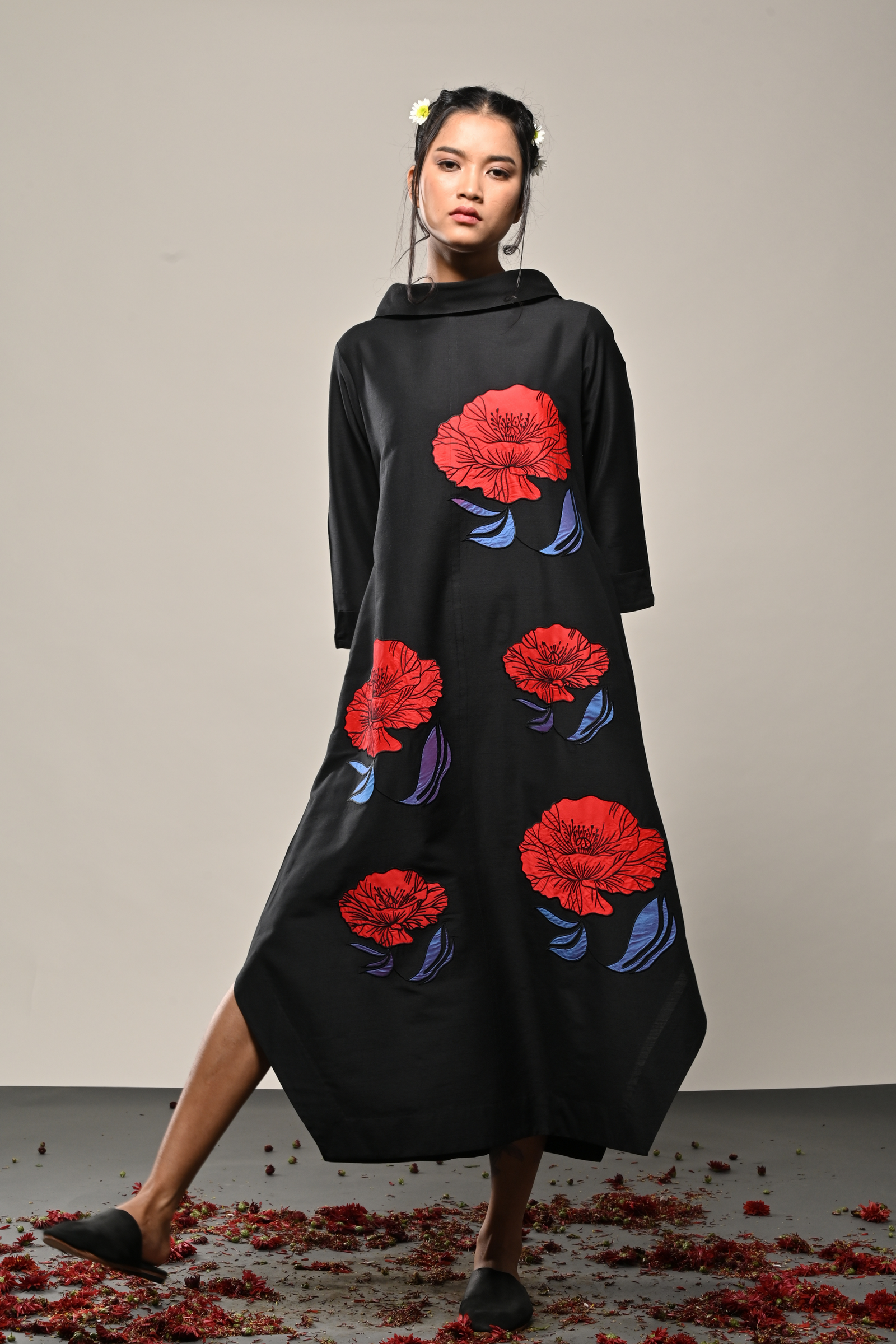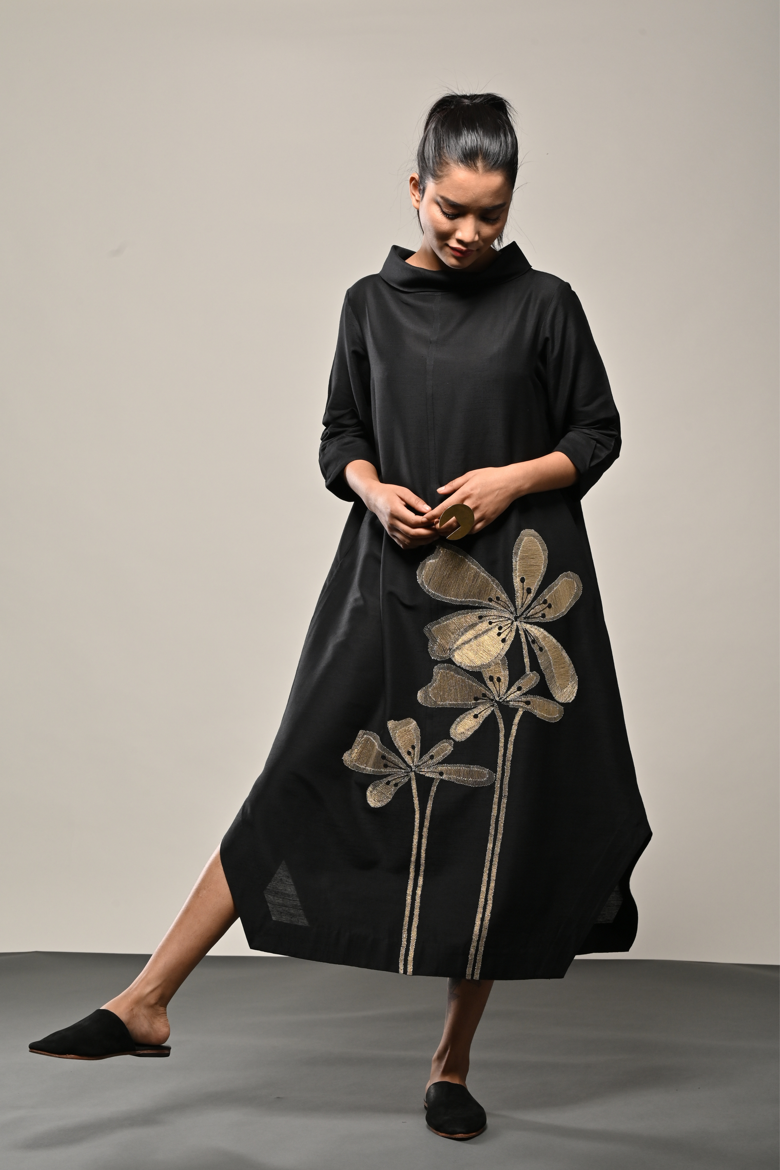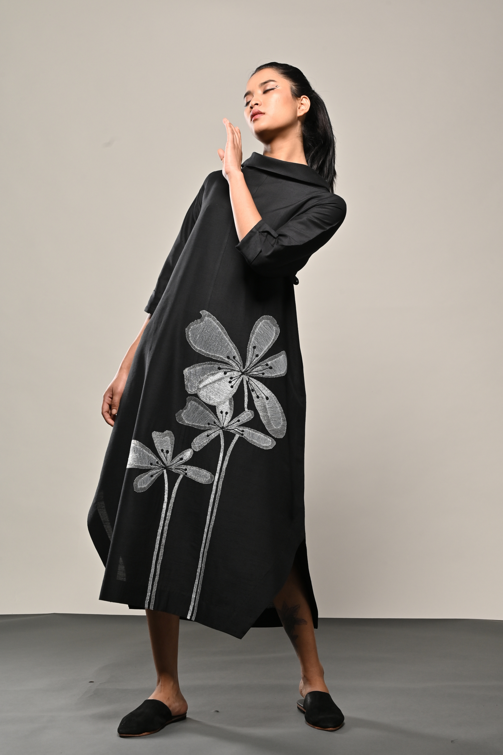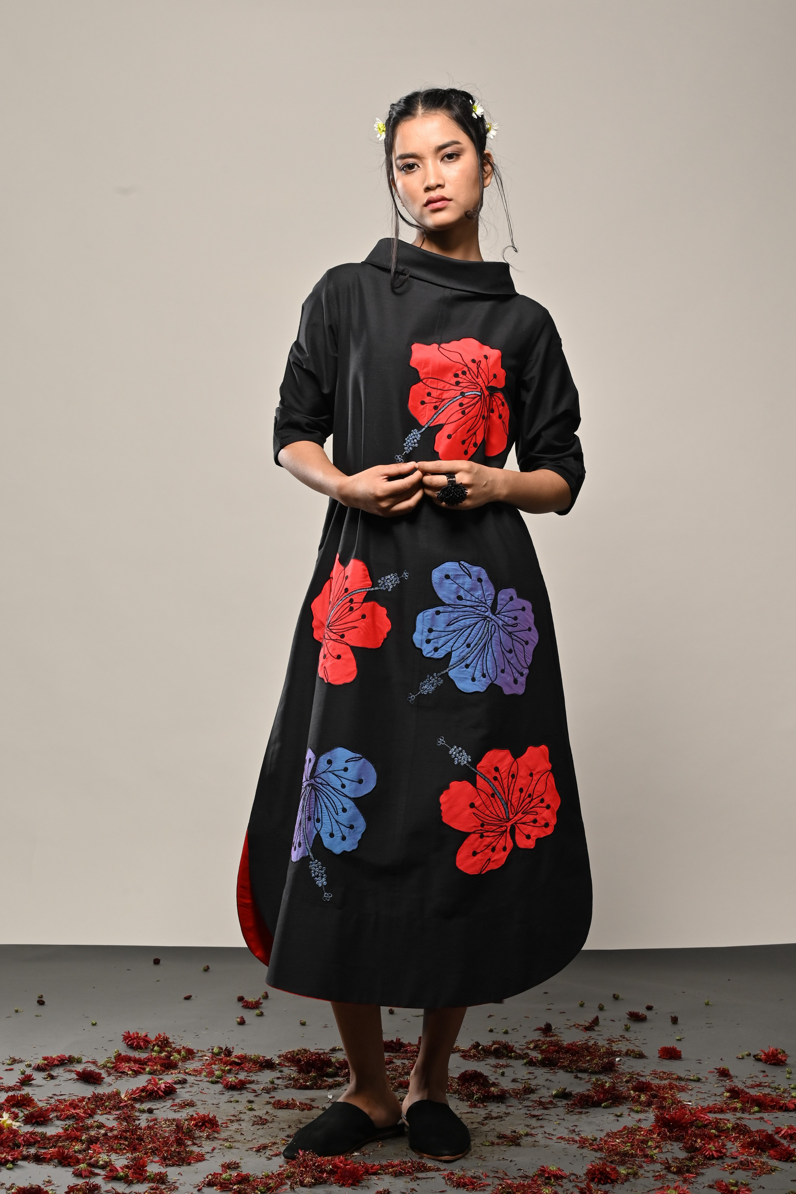 • Black cotton silk dress with appliqued floral pattern Appliqued