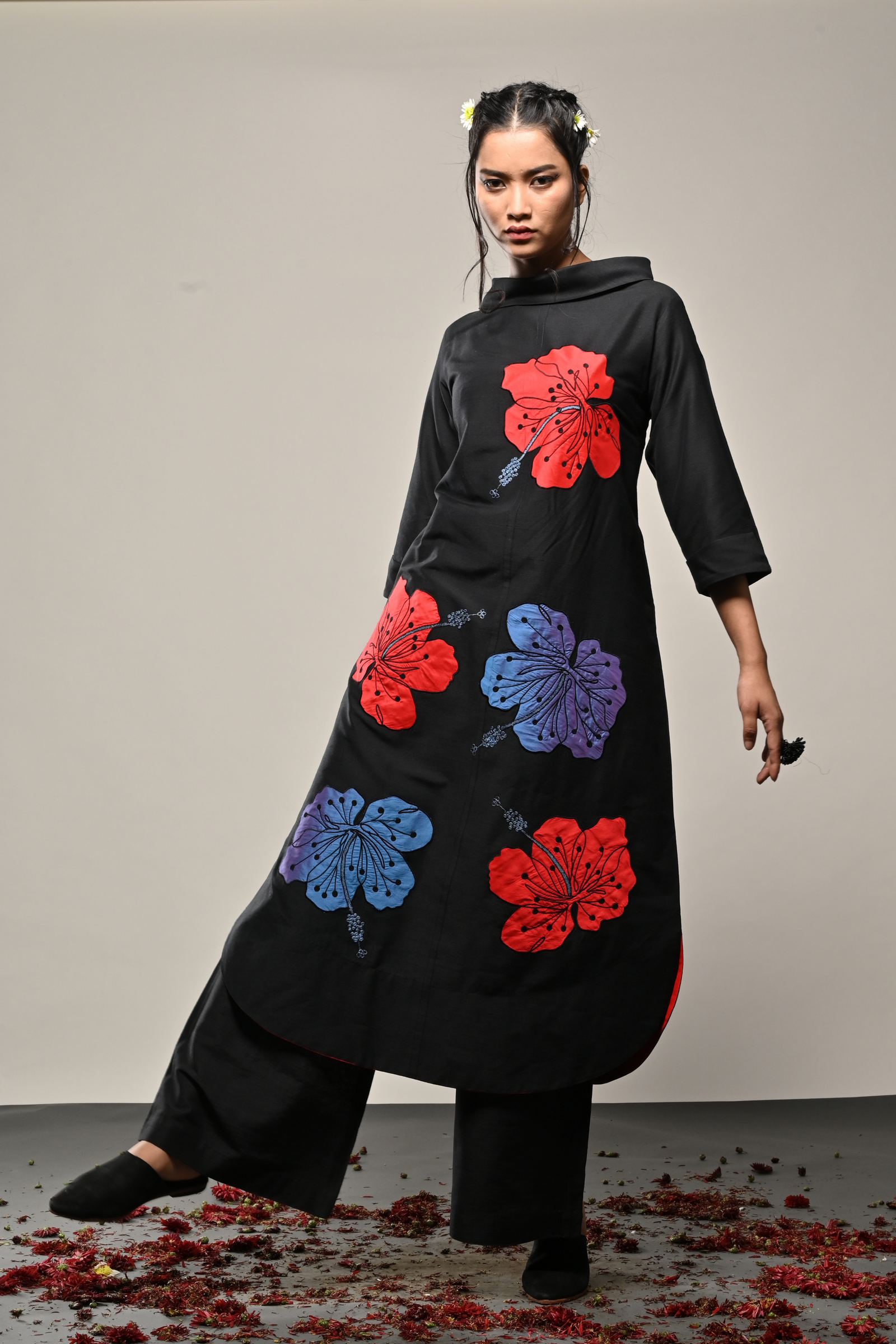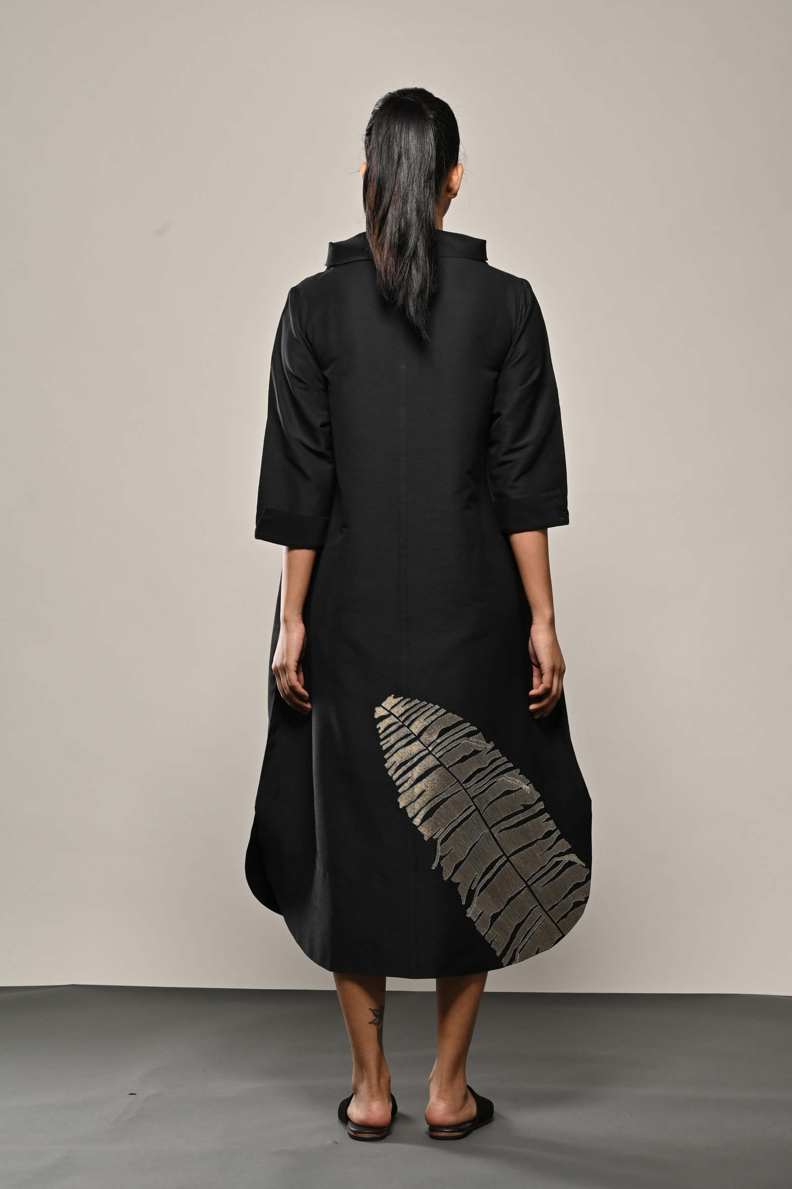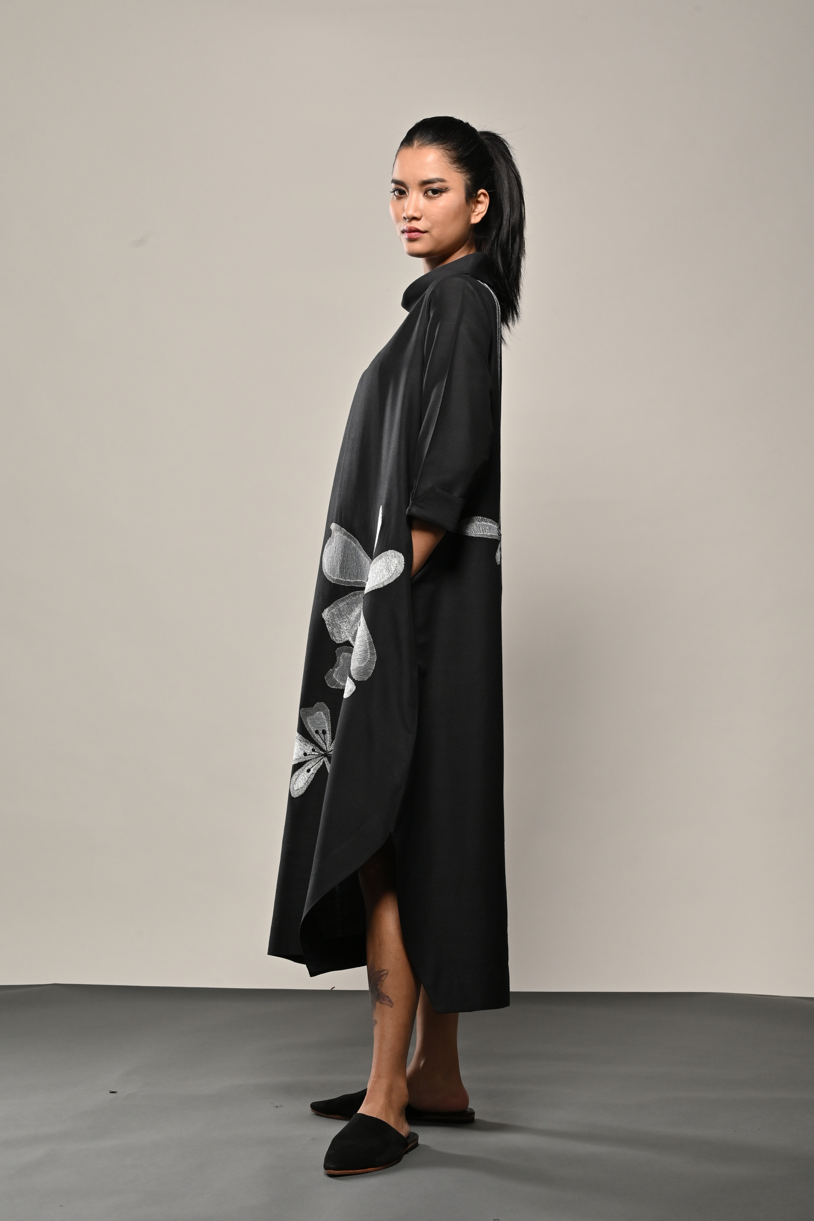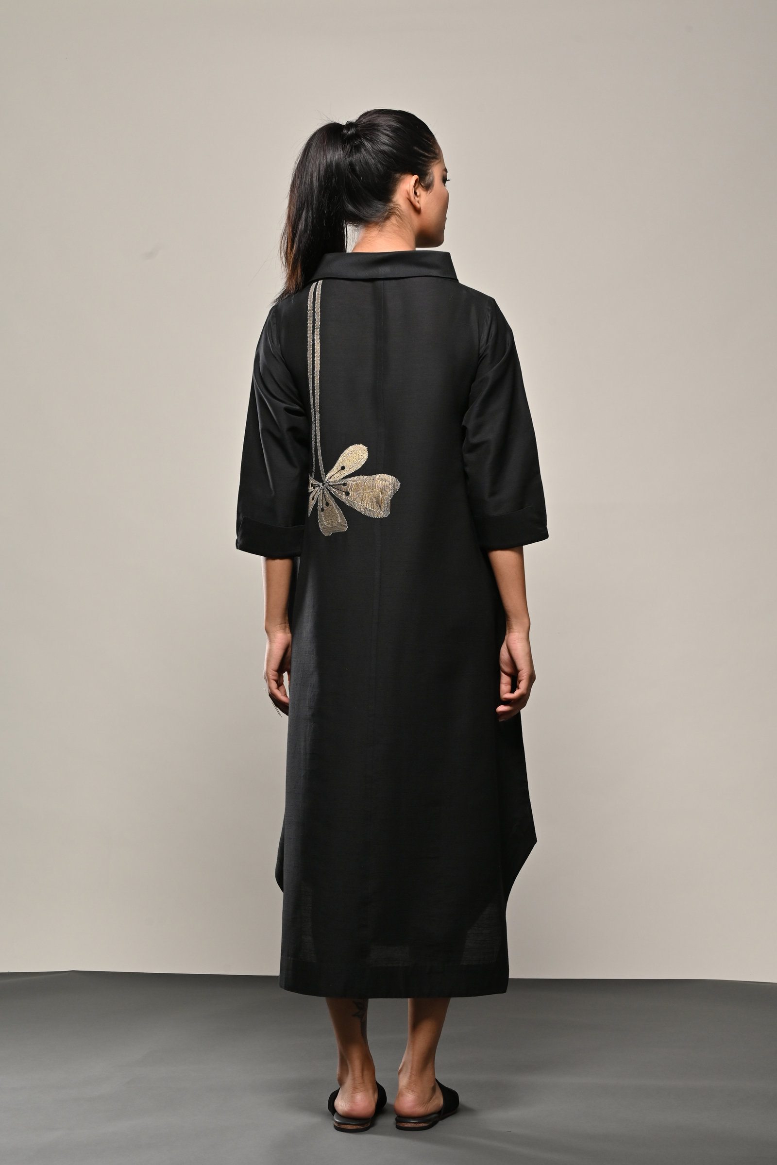 • Black cotton silk dress with appliqued floral pattern Appliqued
