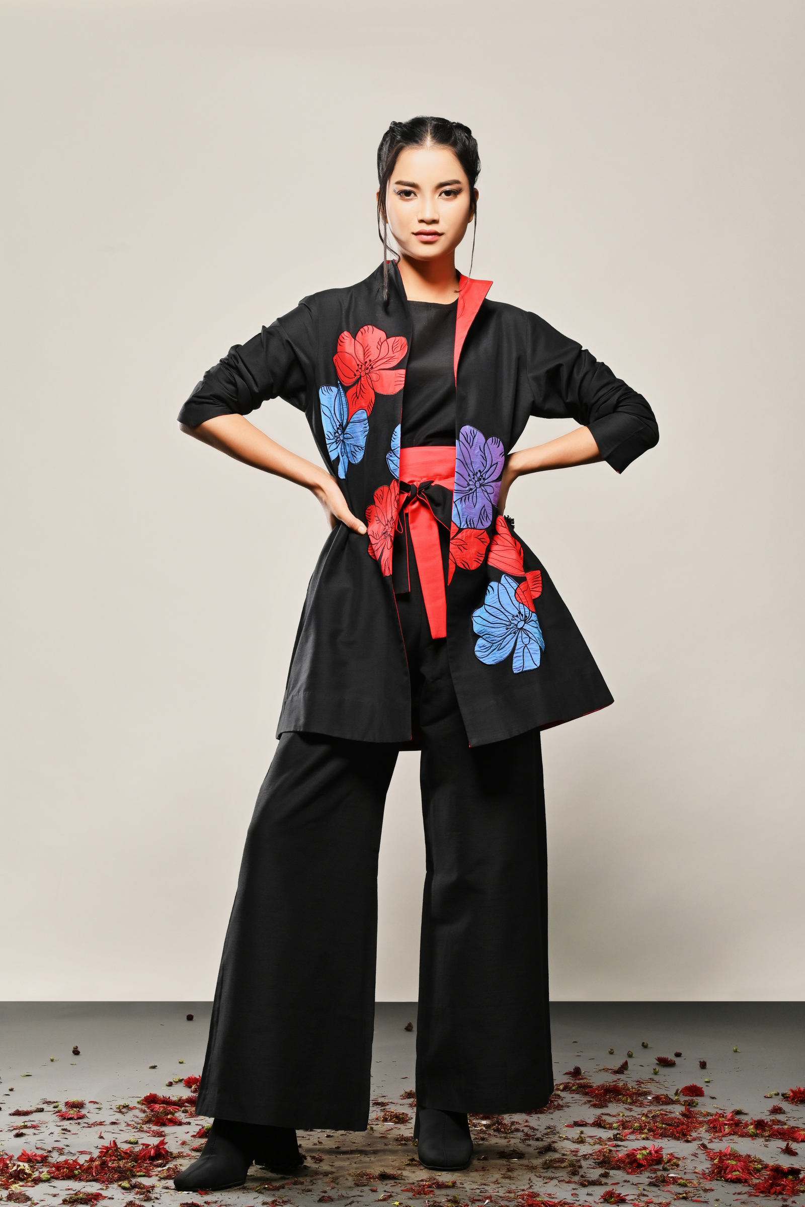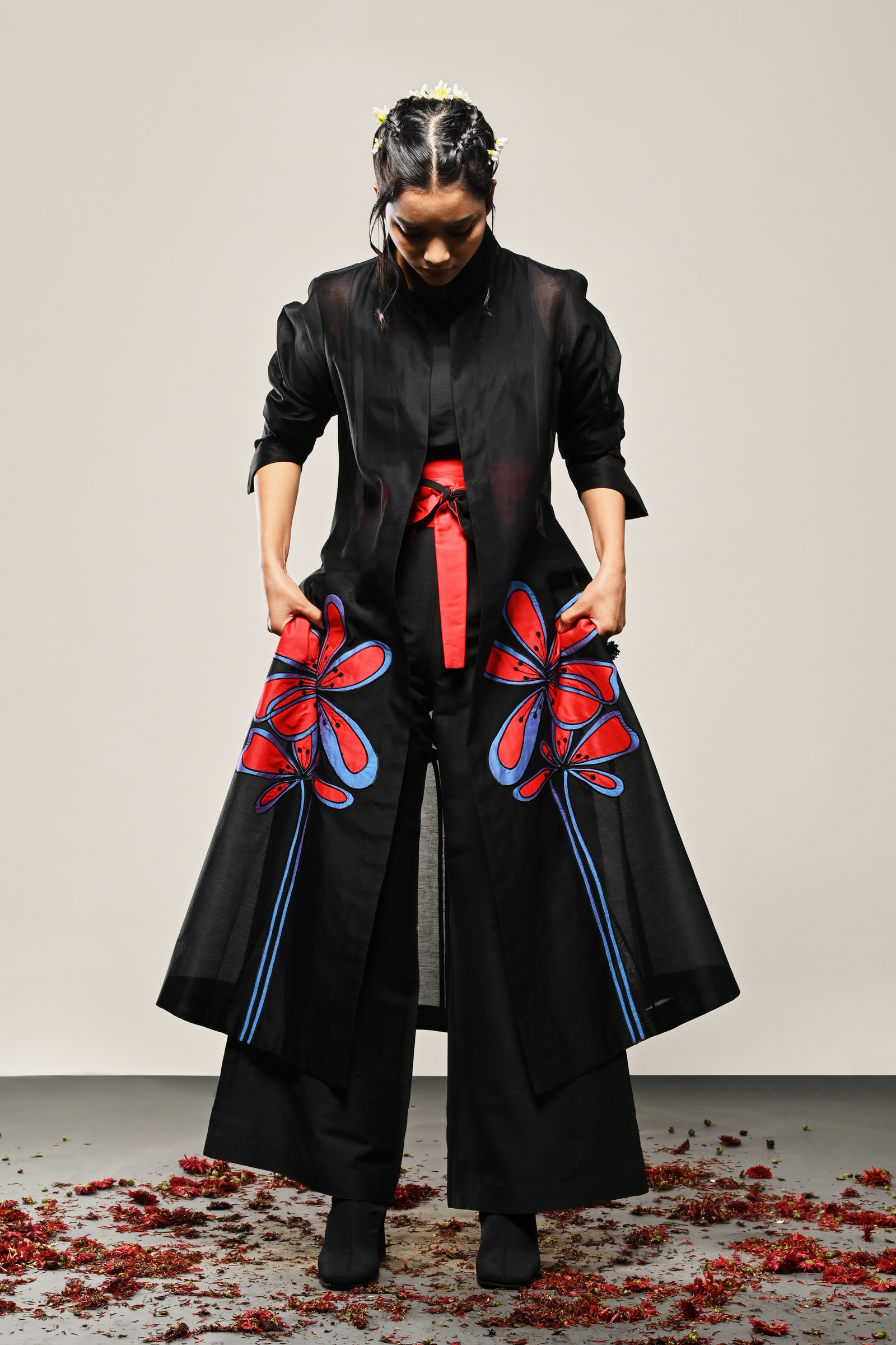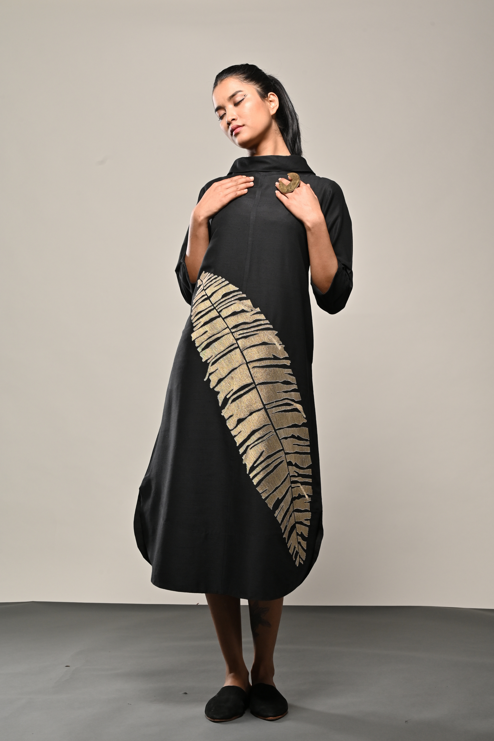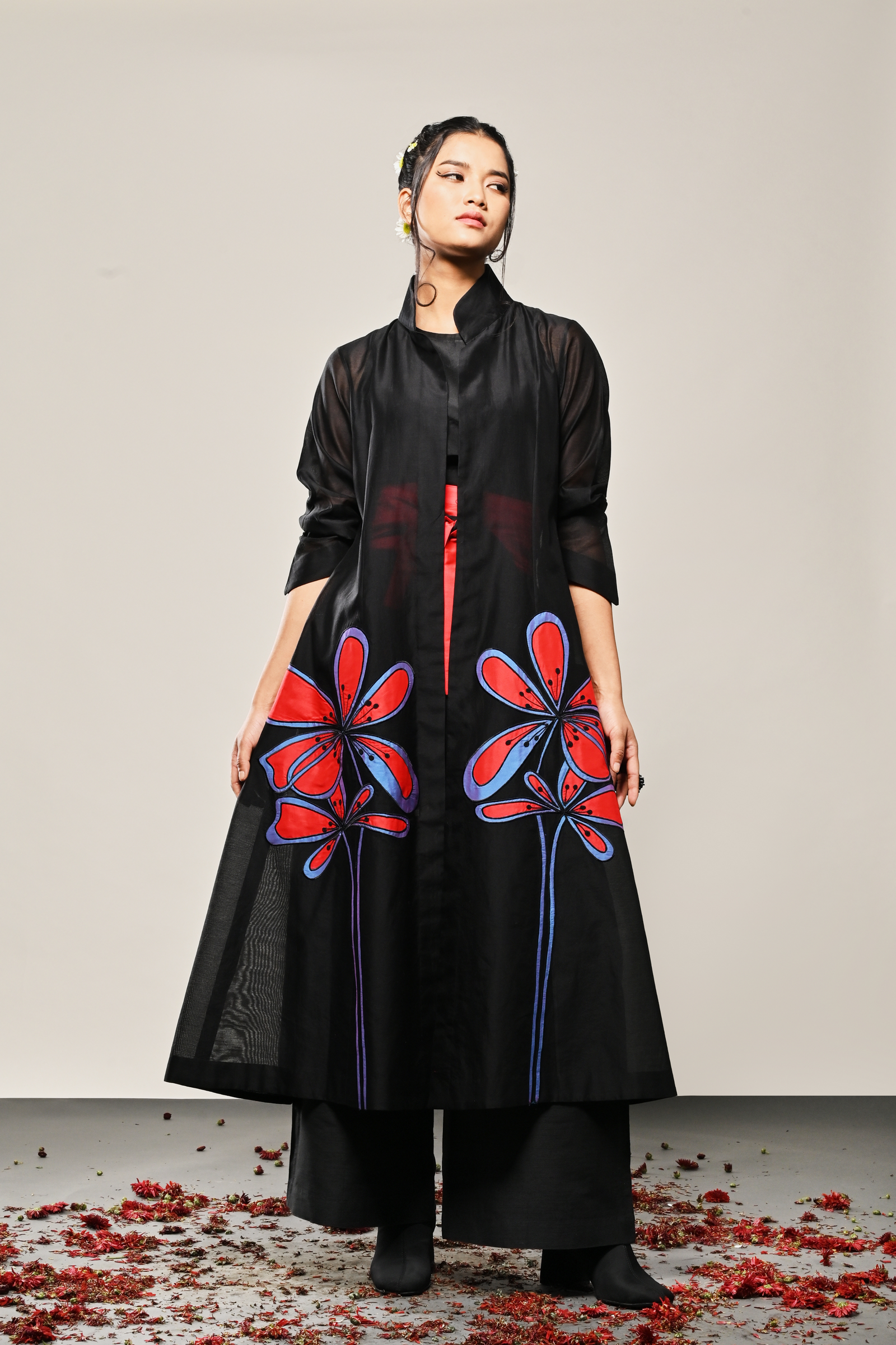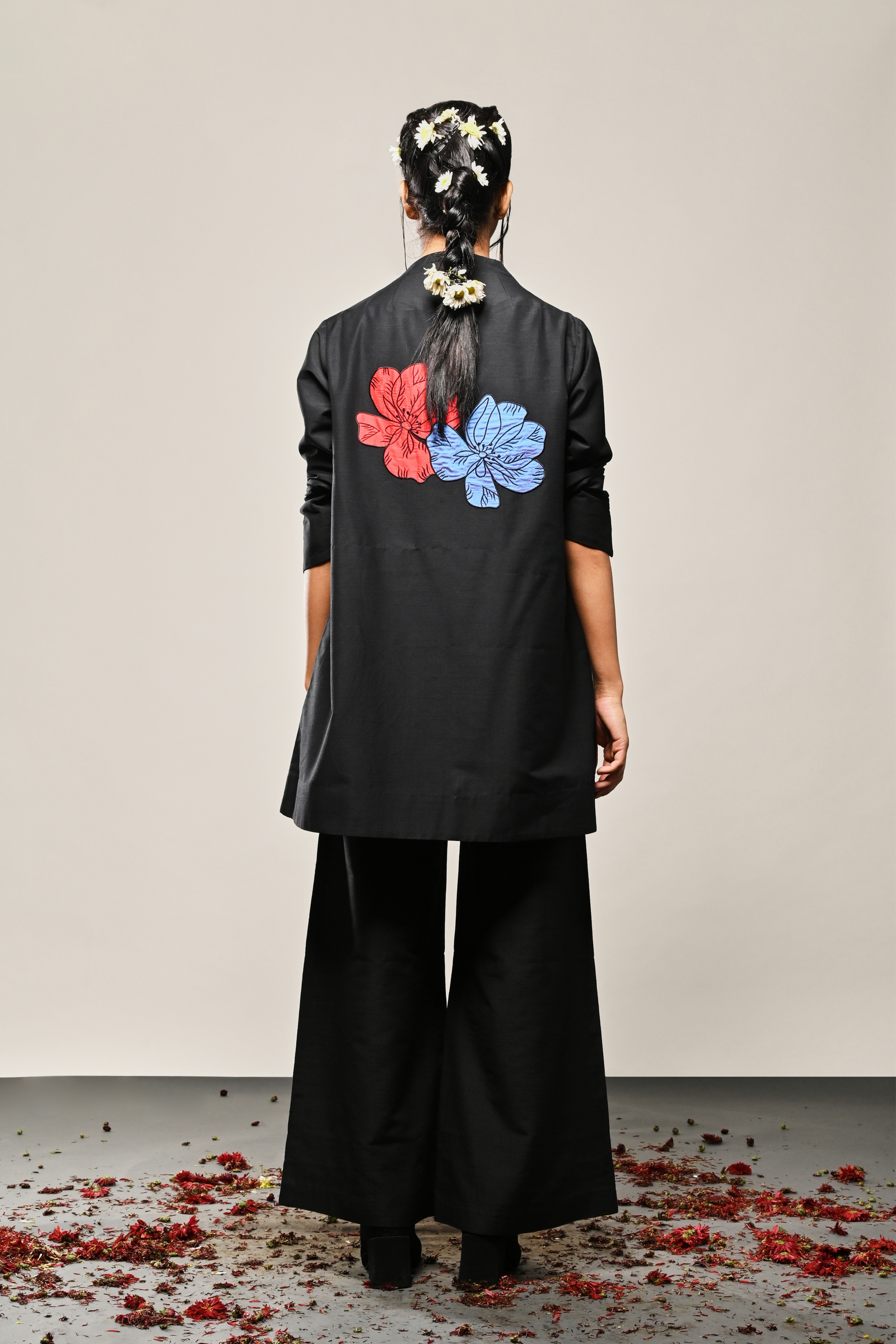 • Black cotton silk dress with appliqued floral pattern Appliqued