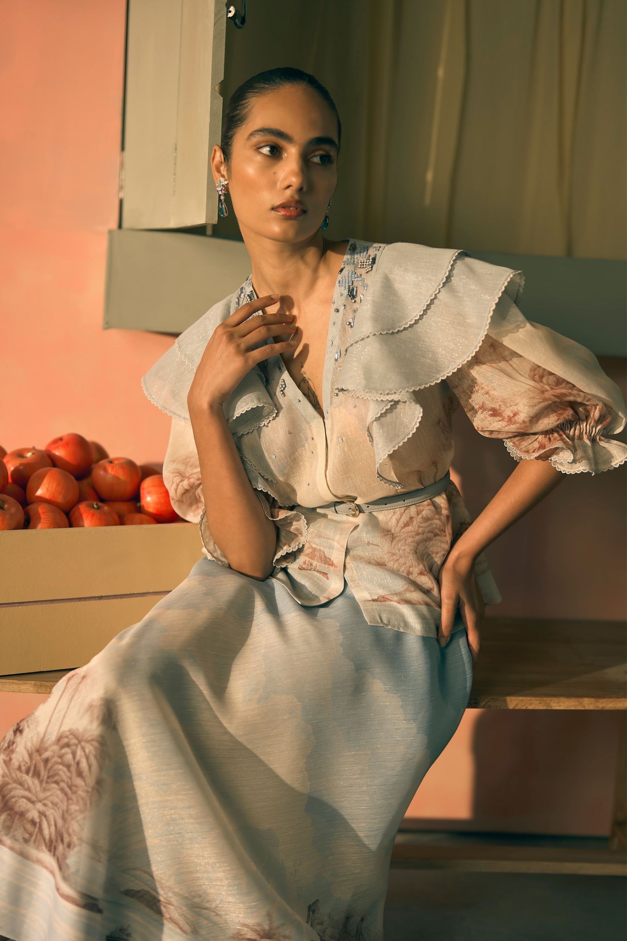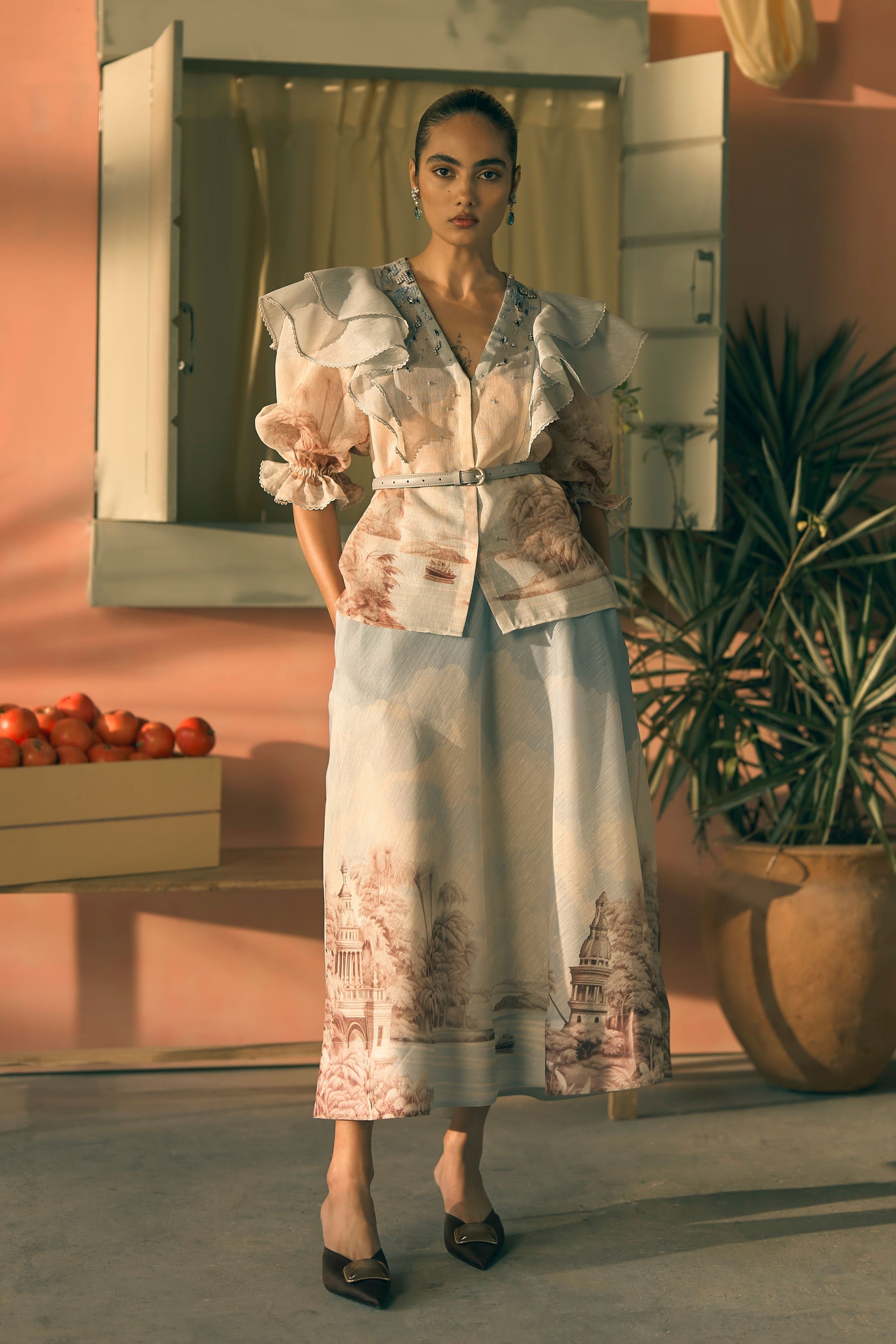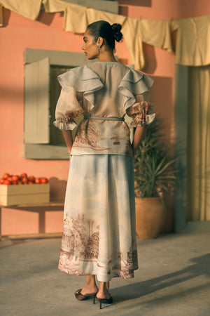 • This powder blue set is crafted from lurex linen, featuring a v-neck top framed by voluminous cascading ruffles and a slender belted waist. Elevated by delicate hand-highlighted embroidery that captures the light with every step. Model is 5ft 7'' and is wearing size small.
