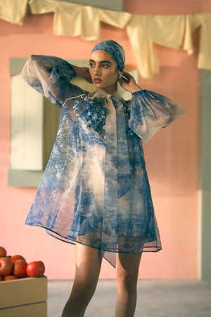 • An ethereal mini dress in sheer silk organza, featuring dramatic bishop sleeves, a statement bow neck, and intricate 3d floral hand-embroidery. It’s the perfect blend of classic artistry and modern, high-fashion romance. Model is 5ft 7'' and is wearing size small. Dress length - 35 inches.
