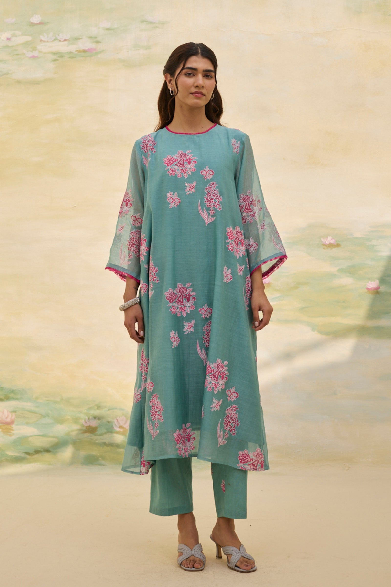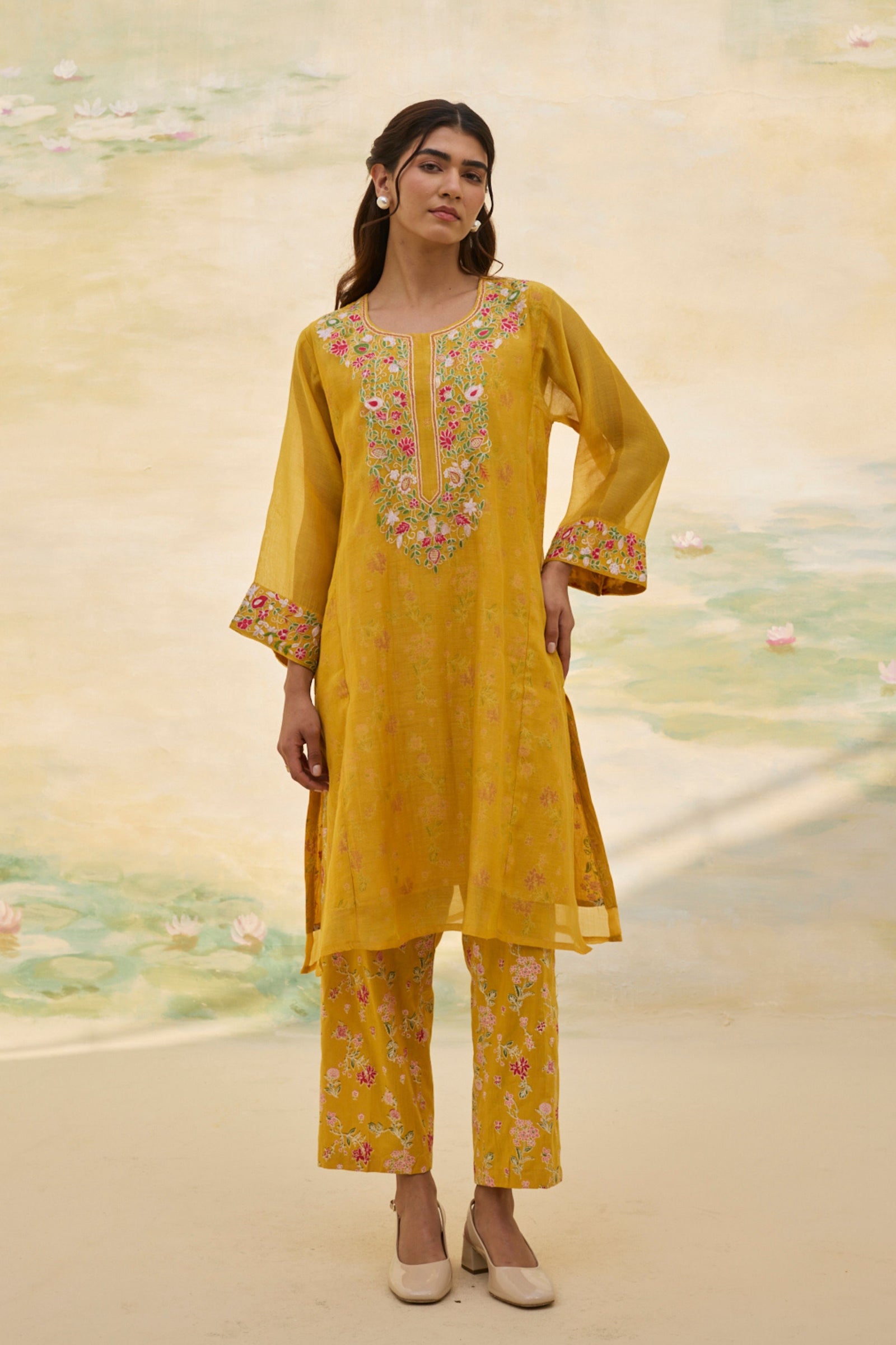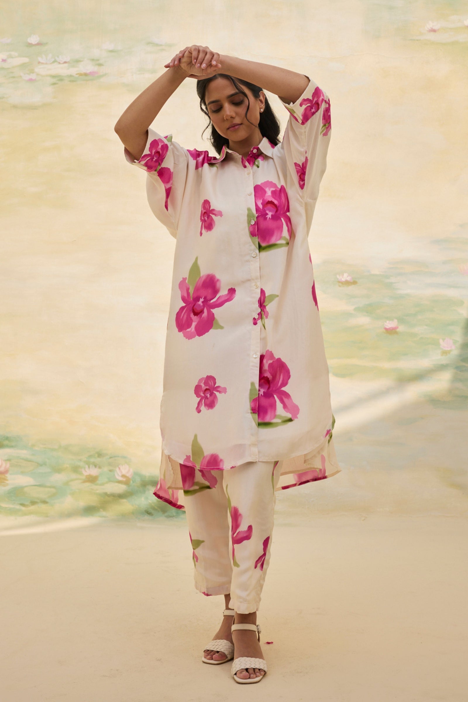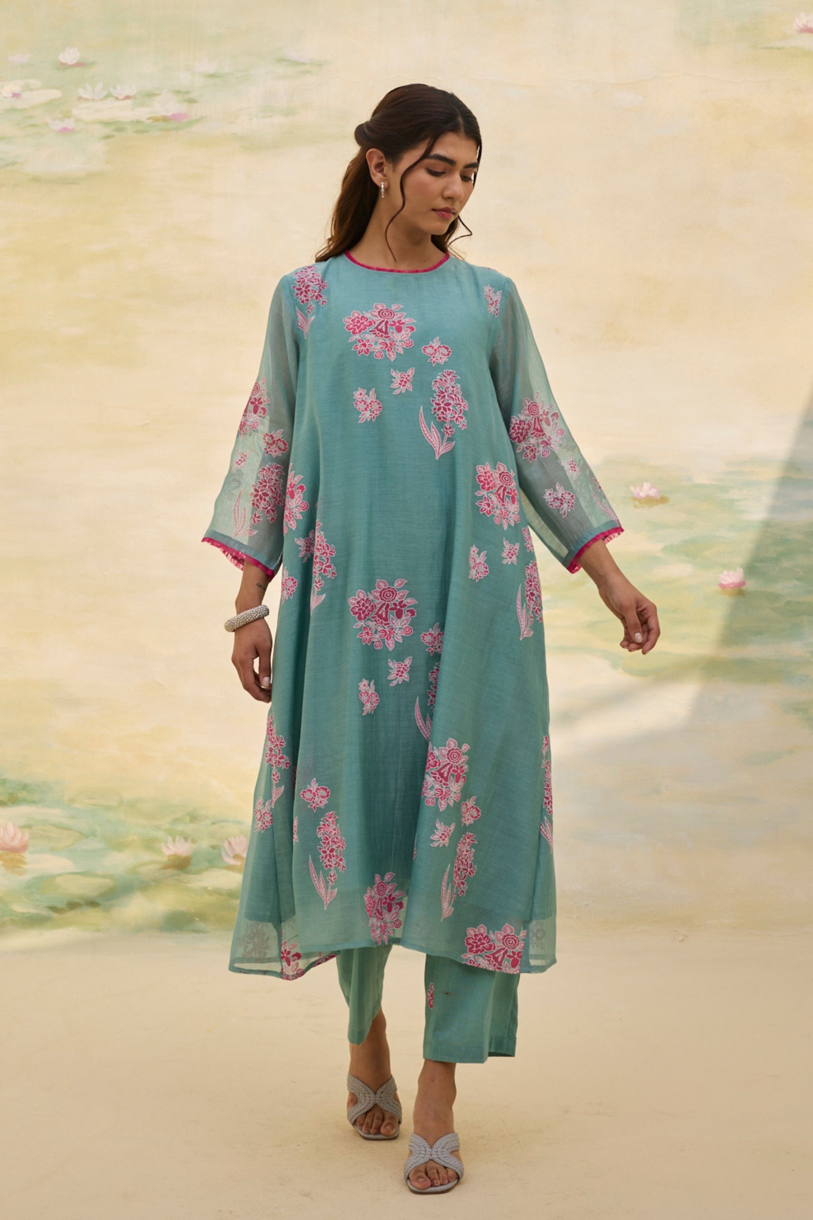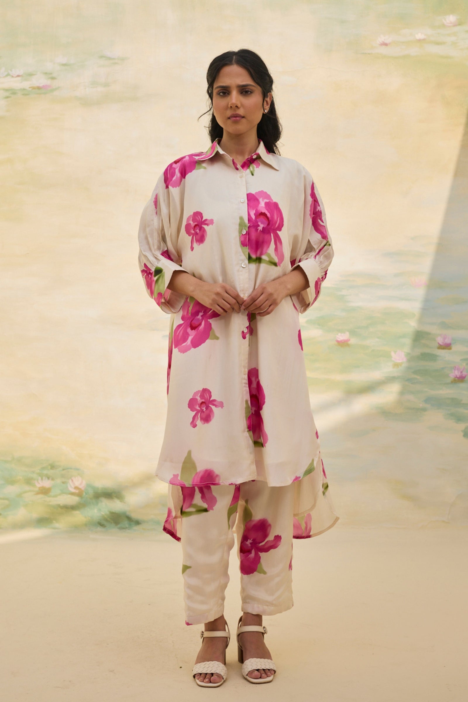 • Presenting our handwoven Chanderi relaxed-fit shirt, Adorned with florette prints, soft and bright, Smocking details grace the neck and sleeves, A delicate touch, a timeless delight. Each bloom whispers of nature’s grace, While intricate smocking adds its trace, A perfect blend of art and ease, Where beauty and comfort gently tease. Note: Each piece holds its own story—slight variations in color, embroidery, or print are the soulful marks of handmade artistry.